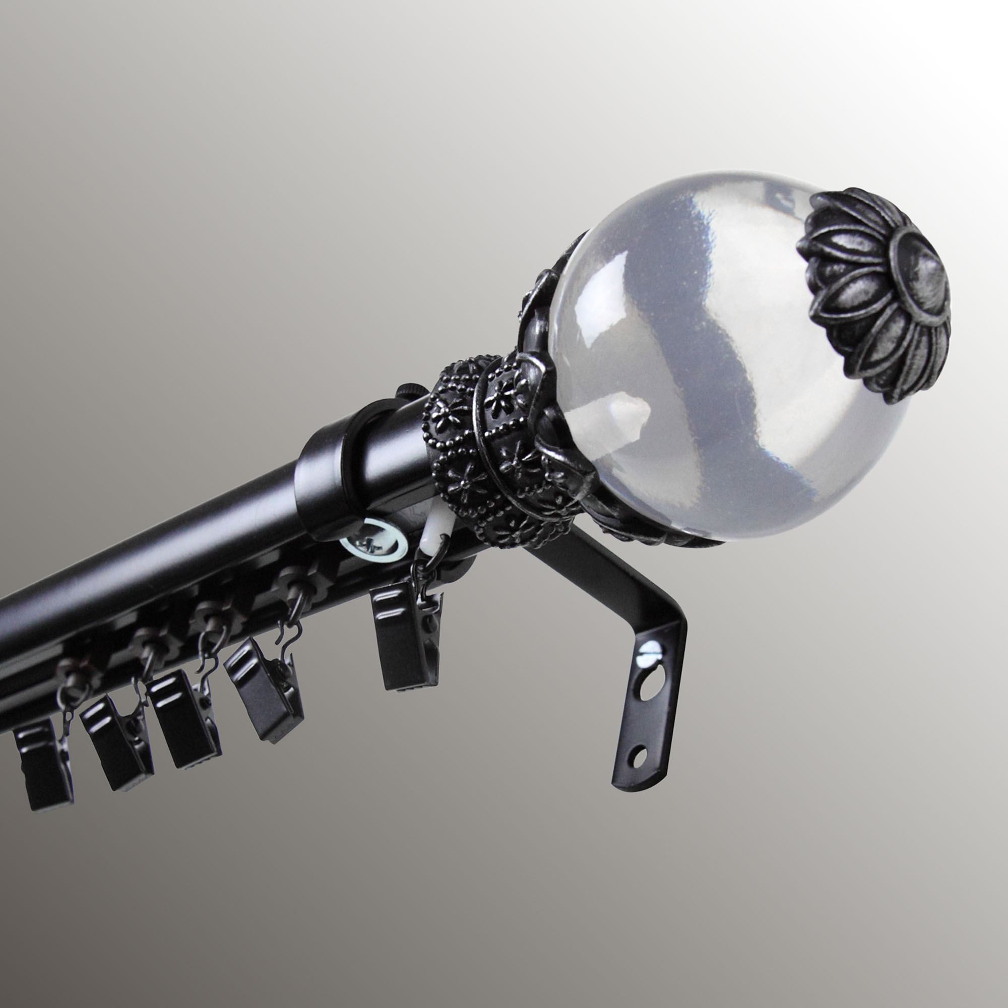 Adorn your view with the floral detailing of the Josette Traverse Rod Set. The black-finished, 1" dia. steel rod has two decorative clear resin orb finials embellished with elegant floral motifs. Each finial measures 2.5"dia.x3.25"L. The cordless, hand-drawn, smooth-glide curtain rod design features pre-attached clips that can be used with your pinch-pleat or rod-pocket panels for a grand look. Indoor use only. Capable of a center-open or one-way draw, the rod set includes one adjustable traverse rod with sliders, two finials, brackets that project 3.875", and mounting hardware. The 28"-48" has 2 brackets and 10 sliders. The 48"-86" has 3 brackets and 20 sliders. The 86"-120" has 4 brackets and 30 sliders. The 110"-156" has 4 brackets and 40 sliders.