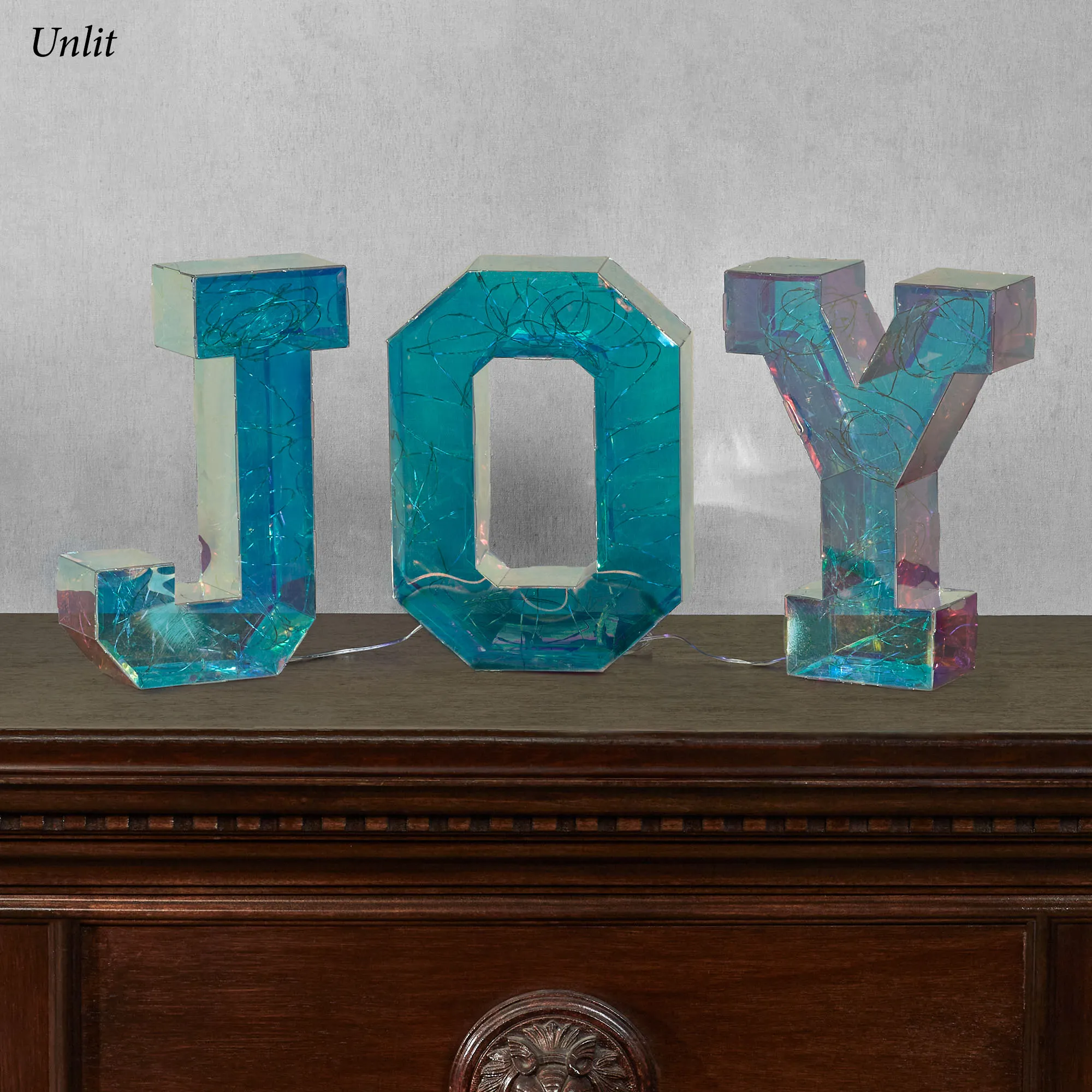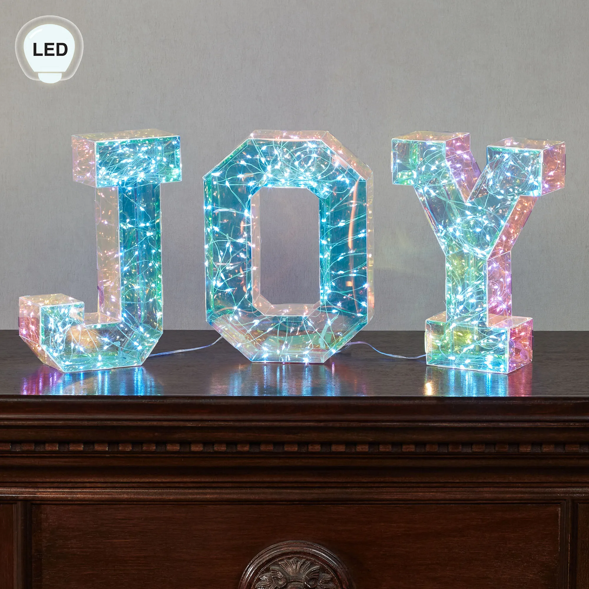 The Joy Hologram Tabletop Accent Set radiates delight. With an iridescent shine, each clear molded polymer letter has a dimensional design filled with LED fairy lights that shimmer and reflect to create a magical effect. The individual capital letters spell out "JOY" and operate via the included eight-function remote with included battery. Also includes a USB cord and adapter; the on/off button is on the USB cord. Indoor use only. Each letter measures approx. 7"Wx2.5"Dx10"H.