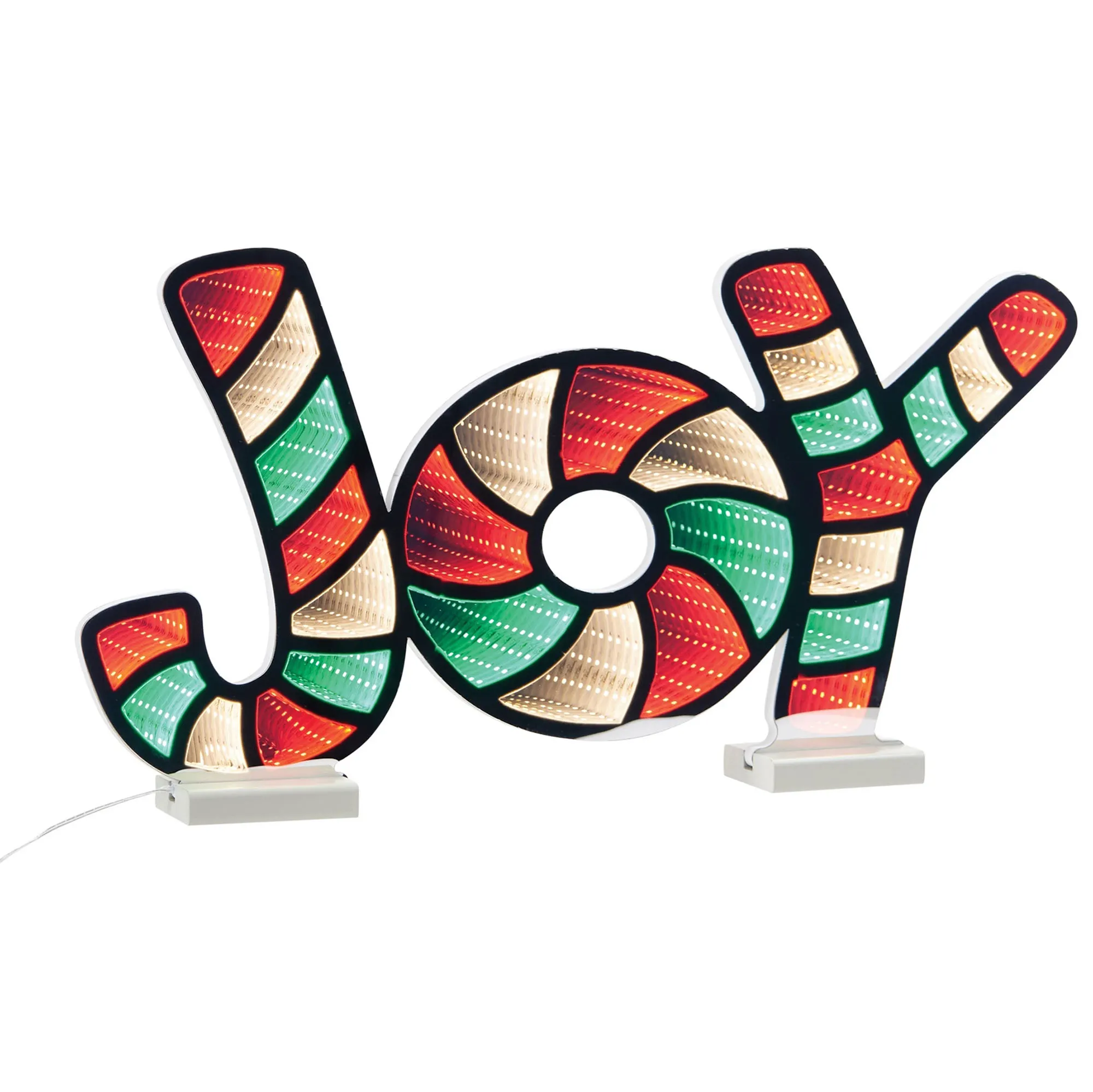 Spark winter wonder in your space with the Joy LED Infinity Light. Crafted from acrylic, the unique LED light has bold letters with red, green, and white stripes. UL listed. Indoor use only. Overall, the decorative holiday light measures approx. 25"Wx.05"Dx12.75"H; the gray wooden bases are each 4"Wx2.5"D.