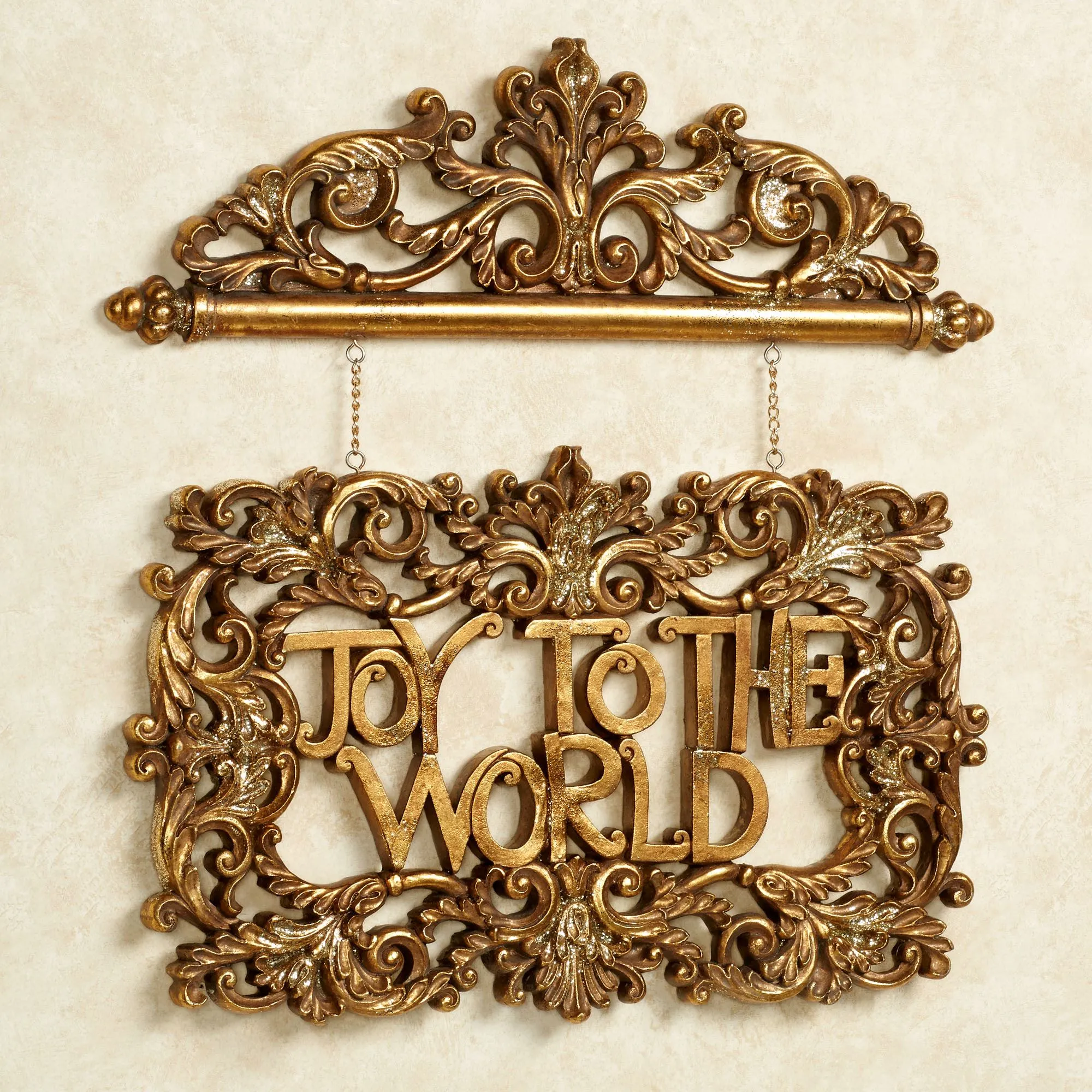 Celebrate the holiday season with the lovely, polystone Joy to the World Wall Accent. The topper has an acanthus scroll and fleur motif and is connected to the bottom design by chains. The words of the carol below are surrounded by the same leaf/scroll design. The aged gold leaf finish is accented with gold glitter. Measures 19"Wx1"Dx19"H.