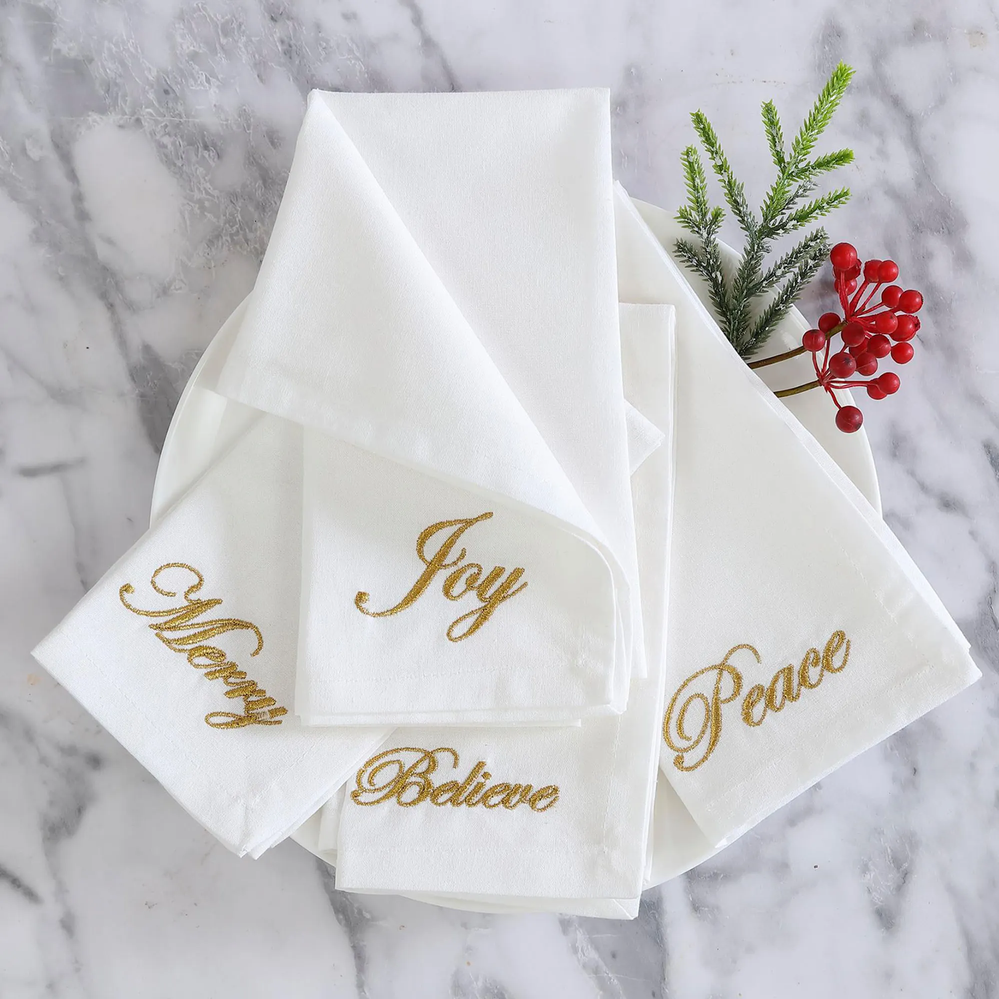 Celebrate Joyful Gatherings with family and friends. This solid color cotton napkin set is embroidered in gold with simple yet meaningful holiday sentiments. Tailored napkins read "Joy," "Merry," Believe," and "Peace." Each napkin is 17" sq. Machine washable. Imported.