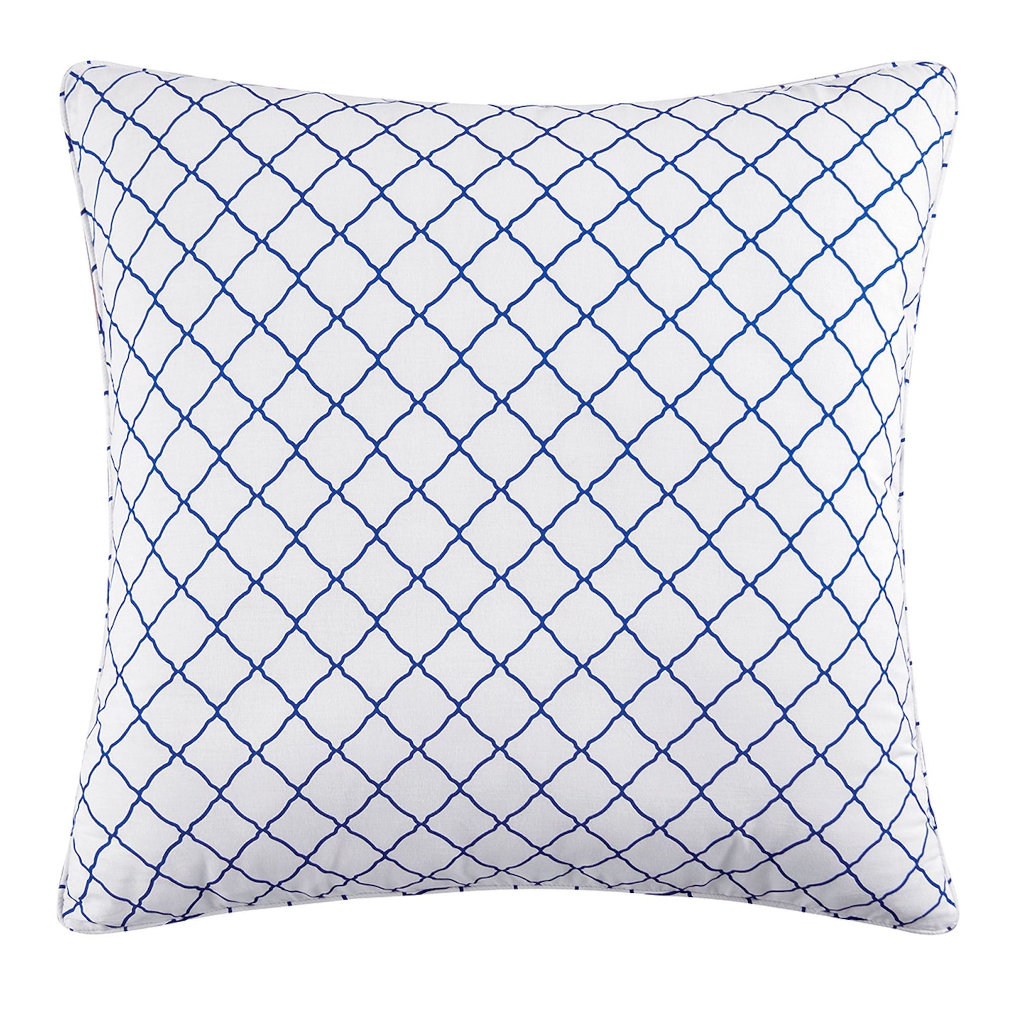 The Julianna European Sham adds a charming touch to your bedding ensemble. The piped, cotton European sham features a royal blue quatrefoil print on white and a zipper closure. Machine washable. Imported.