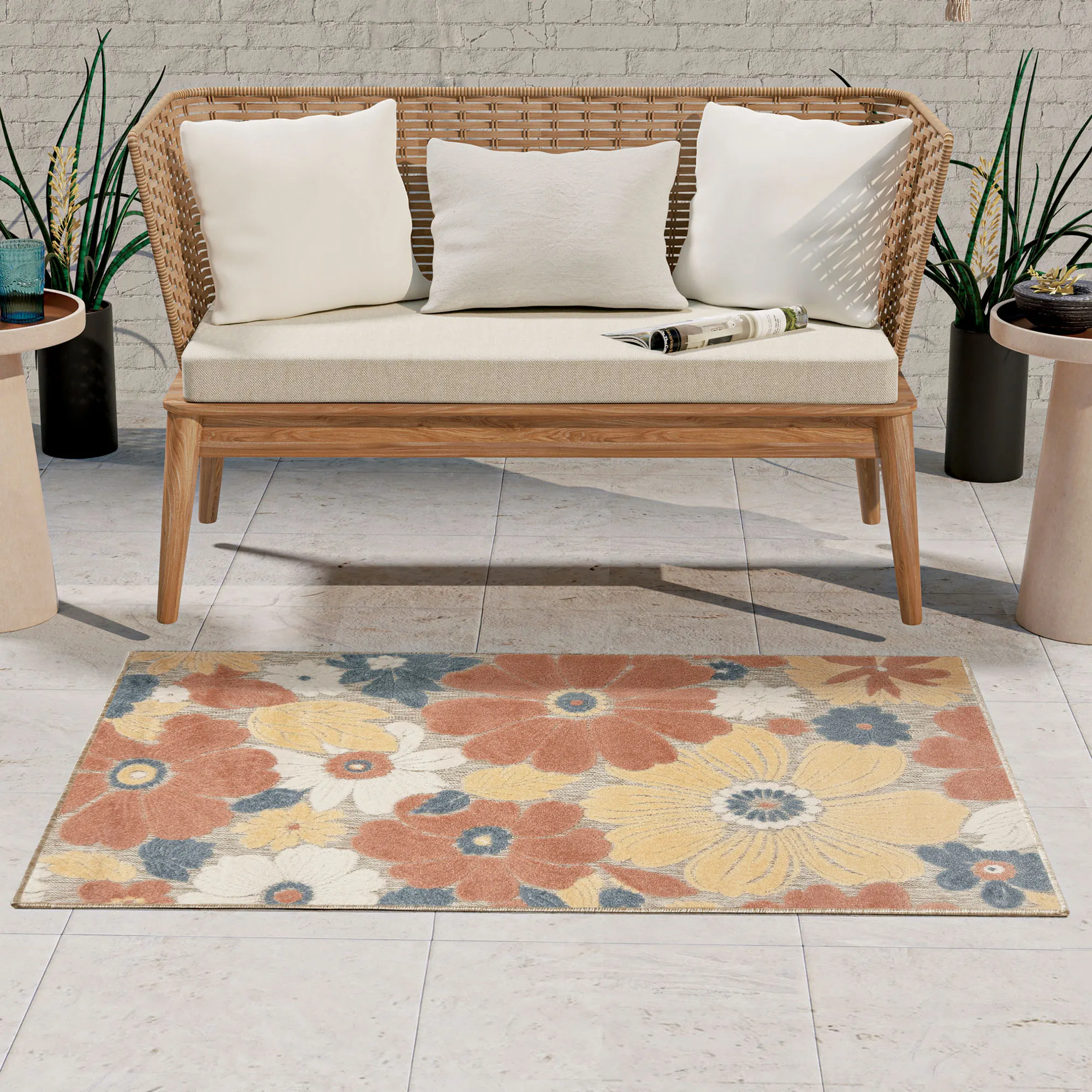 Juliet Yellow Blue Coral Flower Blossom Indoor Outdoor Rugs