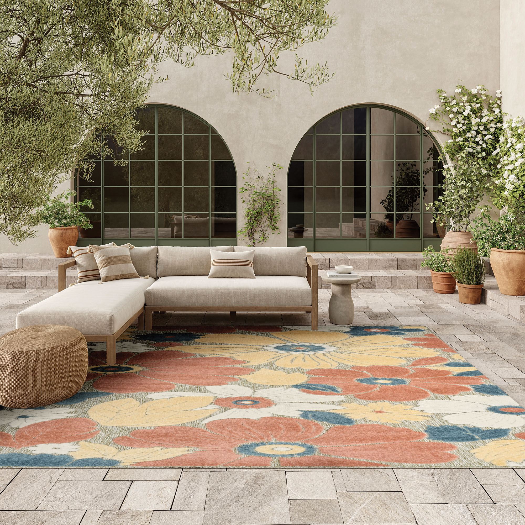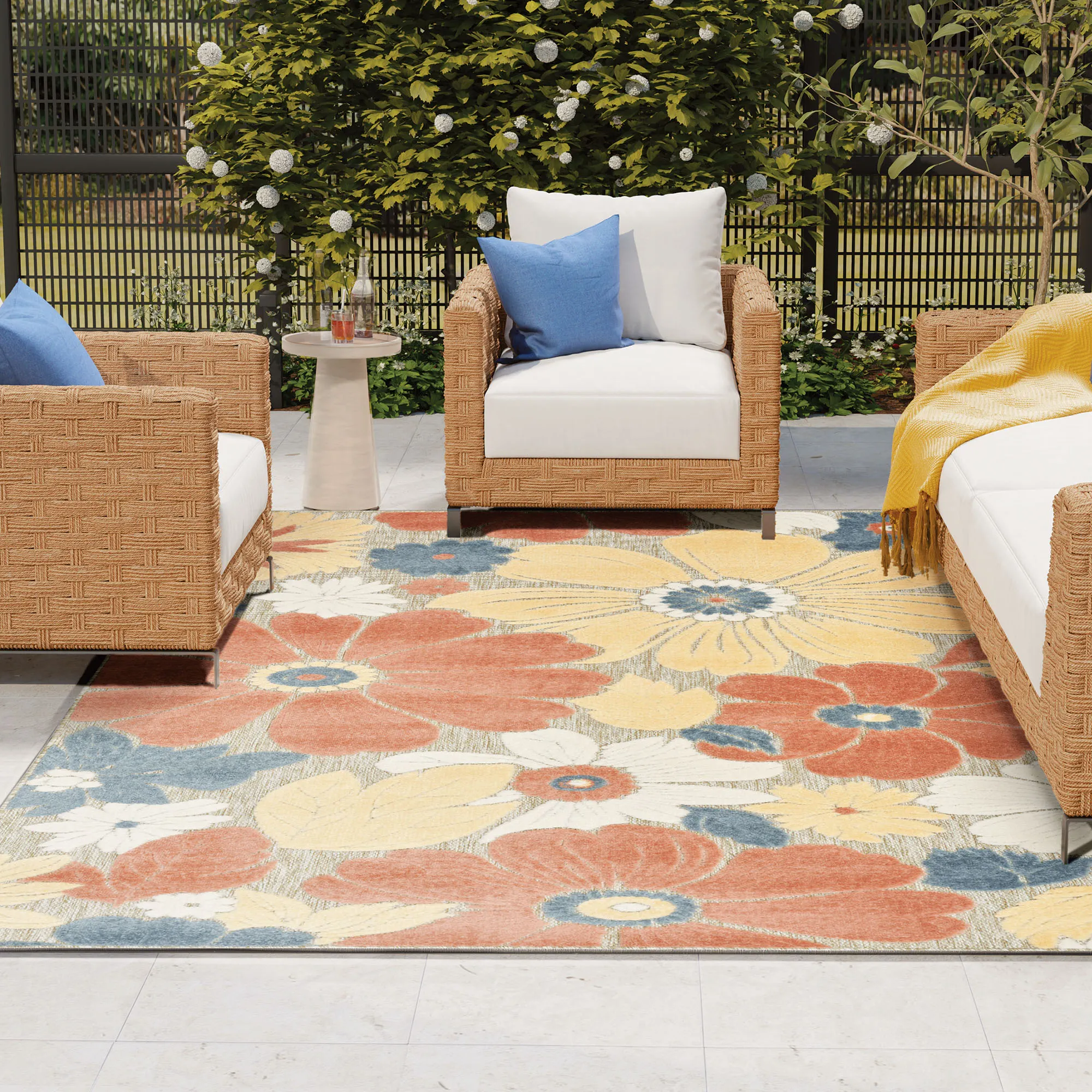 Juliet Yellow Blue Coral Flower Blossom Indoor Outdoor Rugs