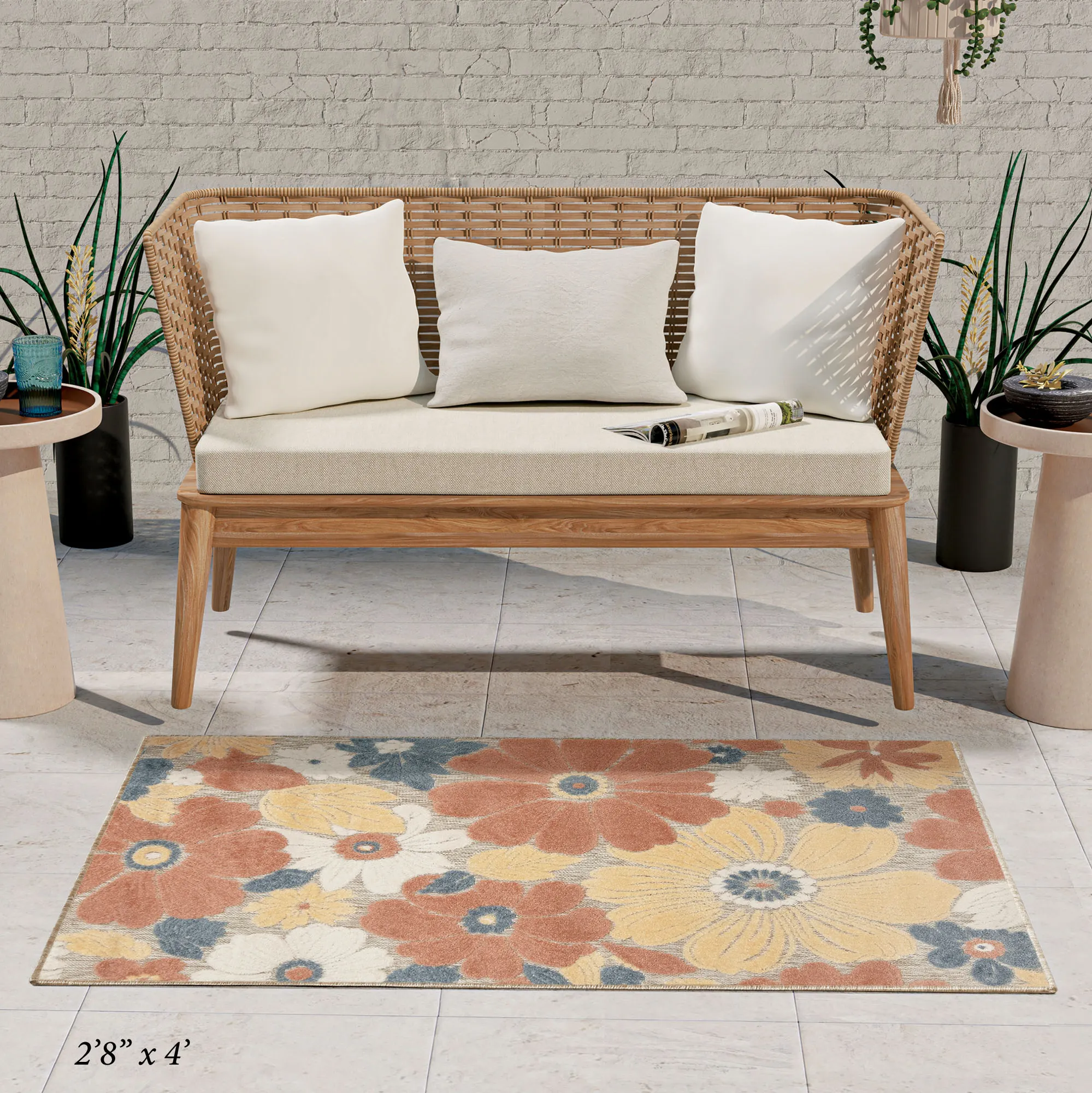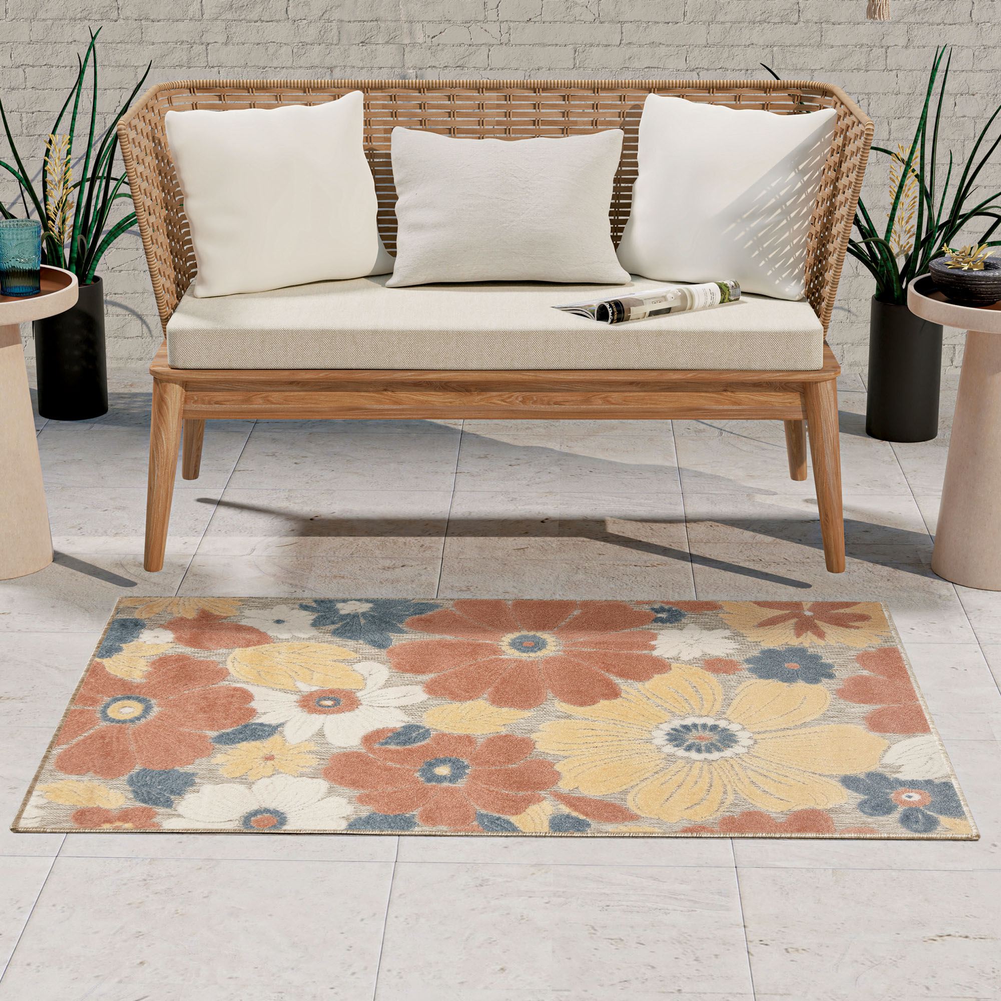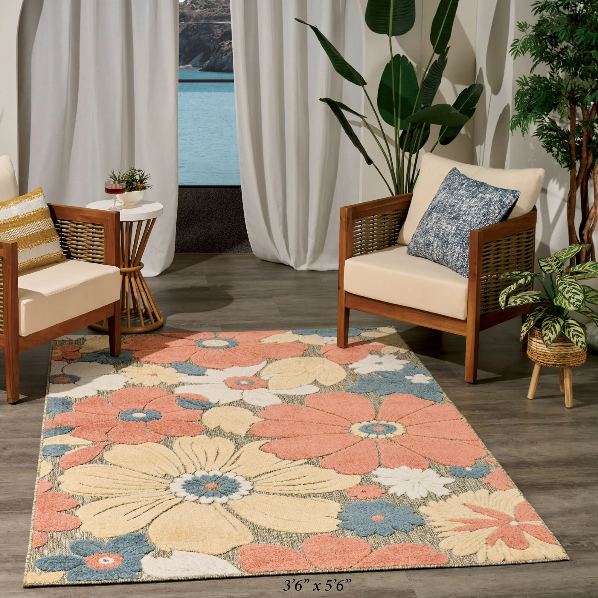 Oversized floral designs look so pretty on the Juliet Indoor/Outdoor Rug. This power-loomed polypropylene area rug, .25" thick, has a flat-woven design of flowers enhanced by a hi-lo dimensional pile on a variegated beige background. Colors include shades of beige, ivory, yellow, blue, and coral. Backing is latex. Rug may be used indoors or outdoors seasonally; do not expose this rug to freezing temperatures. Spot clean and rinse with a garden hose; for stubborn stains, we recommend professional cleaning by a rug cleaner. Imported.