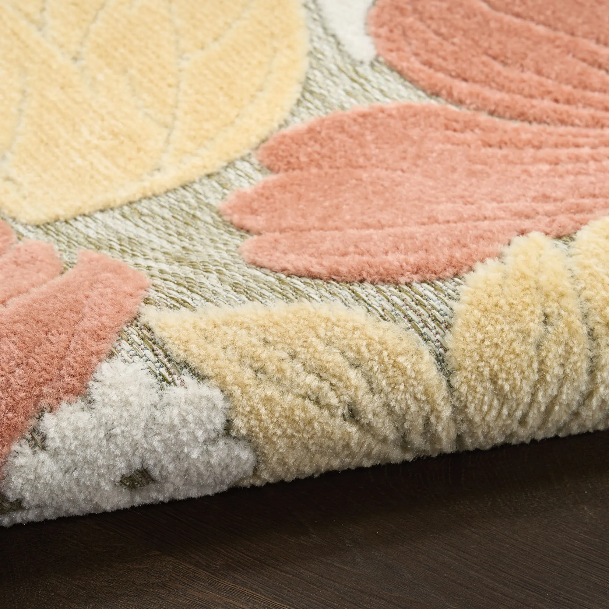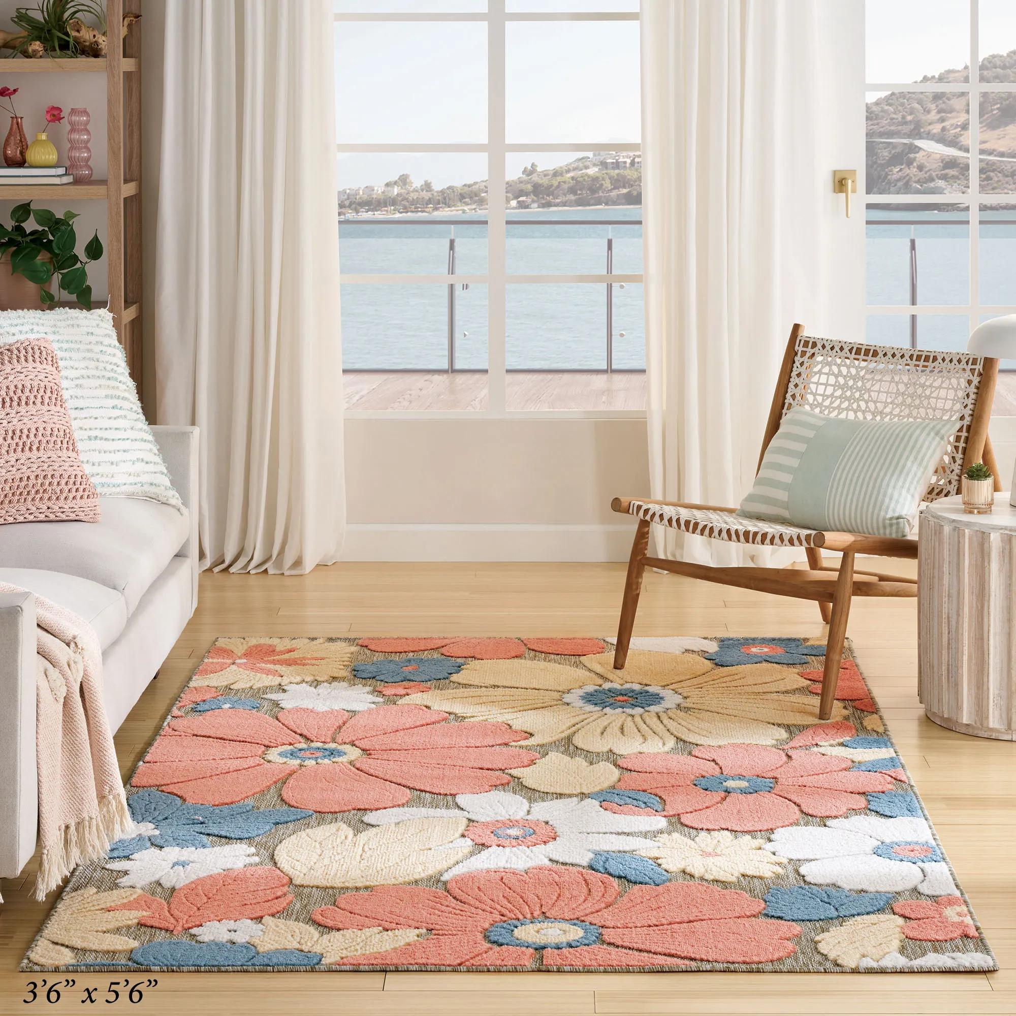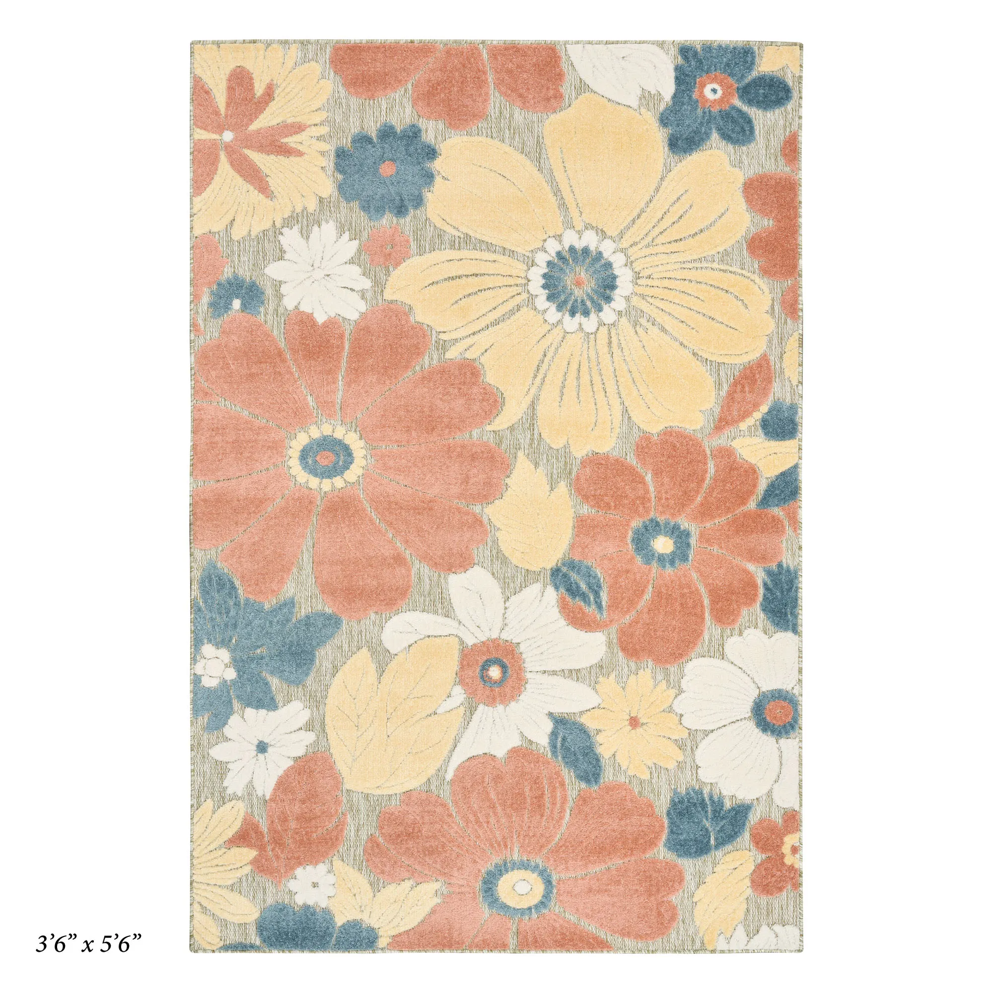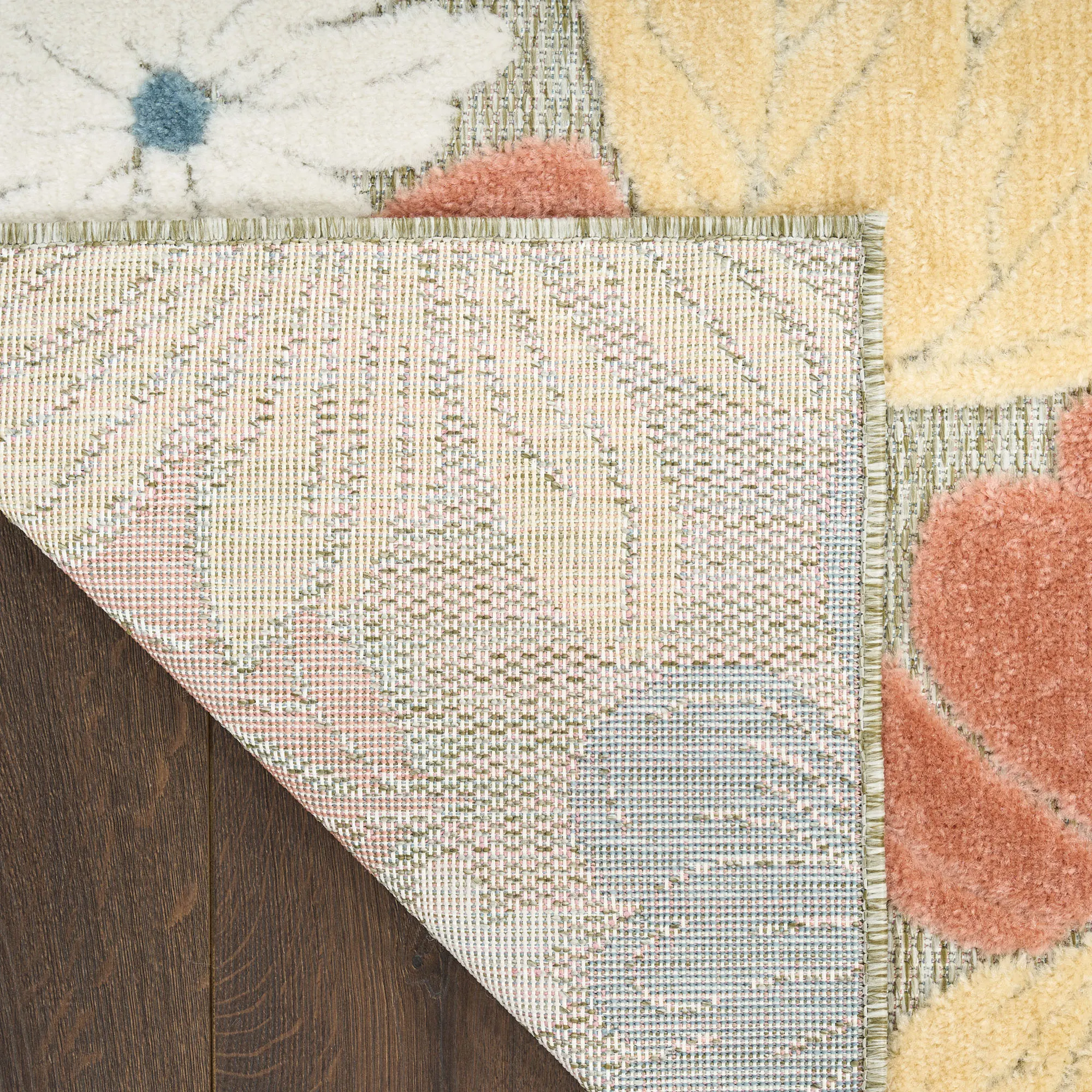 Oversized floral designs look so pretty on the Juliet Indoor/Outdoor Rug. This power-loomed polypropylene area rug, .25" thick, has a flat-woven design of flowers enhanced by a hi-lo dimensional pile on a variegated beige background. Colors include shades of beige, ivory, yellow, blue, and coral. Backing is latex. Rug may be used indoors or outdoors seasonally; do not expose this rug to freezing temperatures. Spot clean and rinse with a garden hose; for stubborn stains, we recommend professional cleaning by a rug cleaner. Imported.