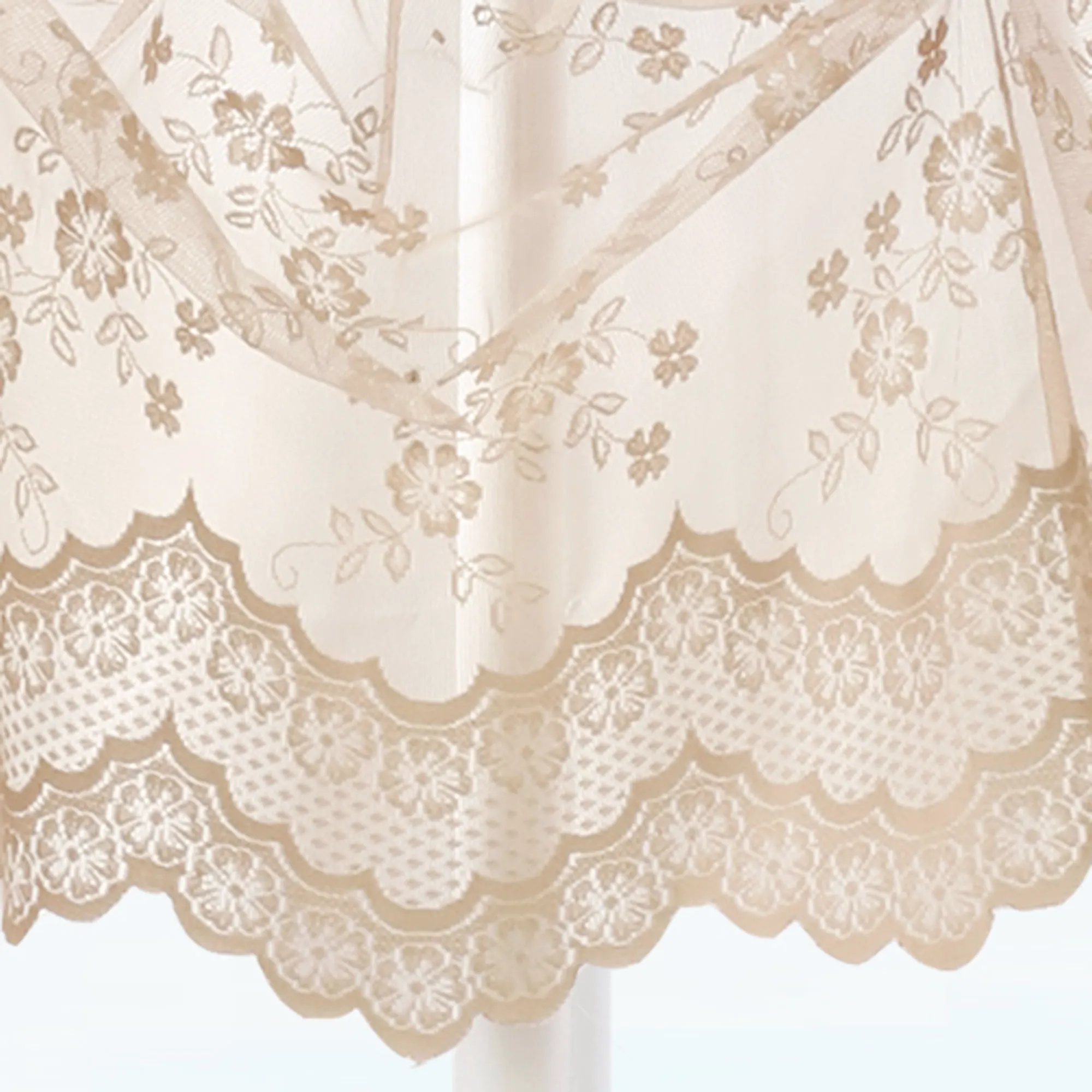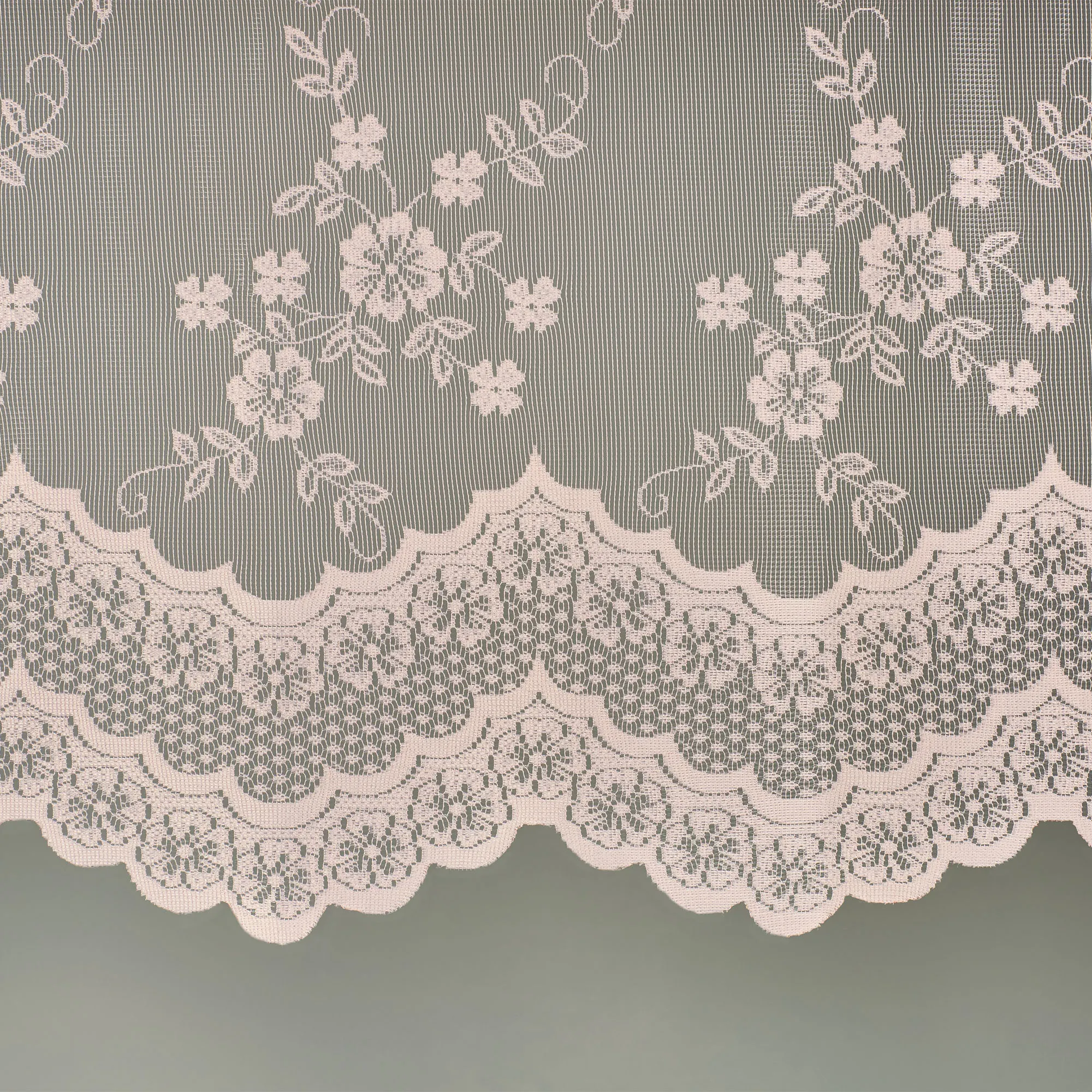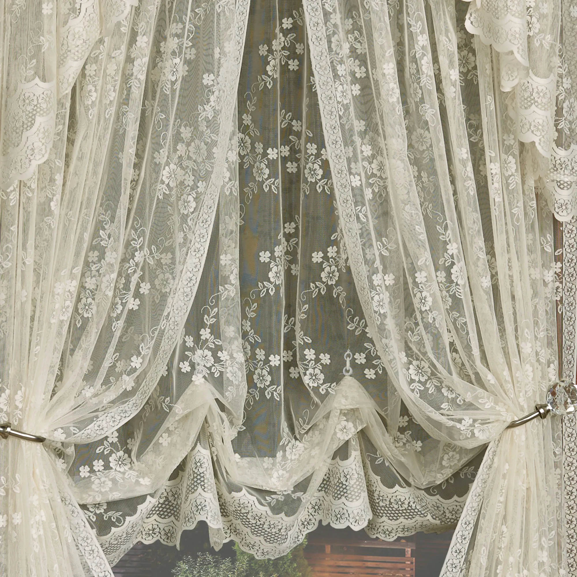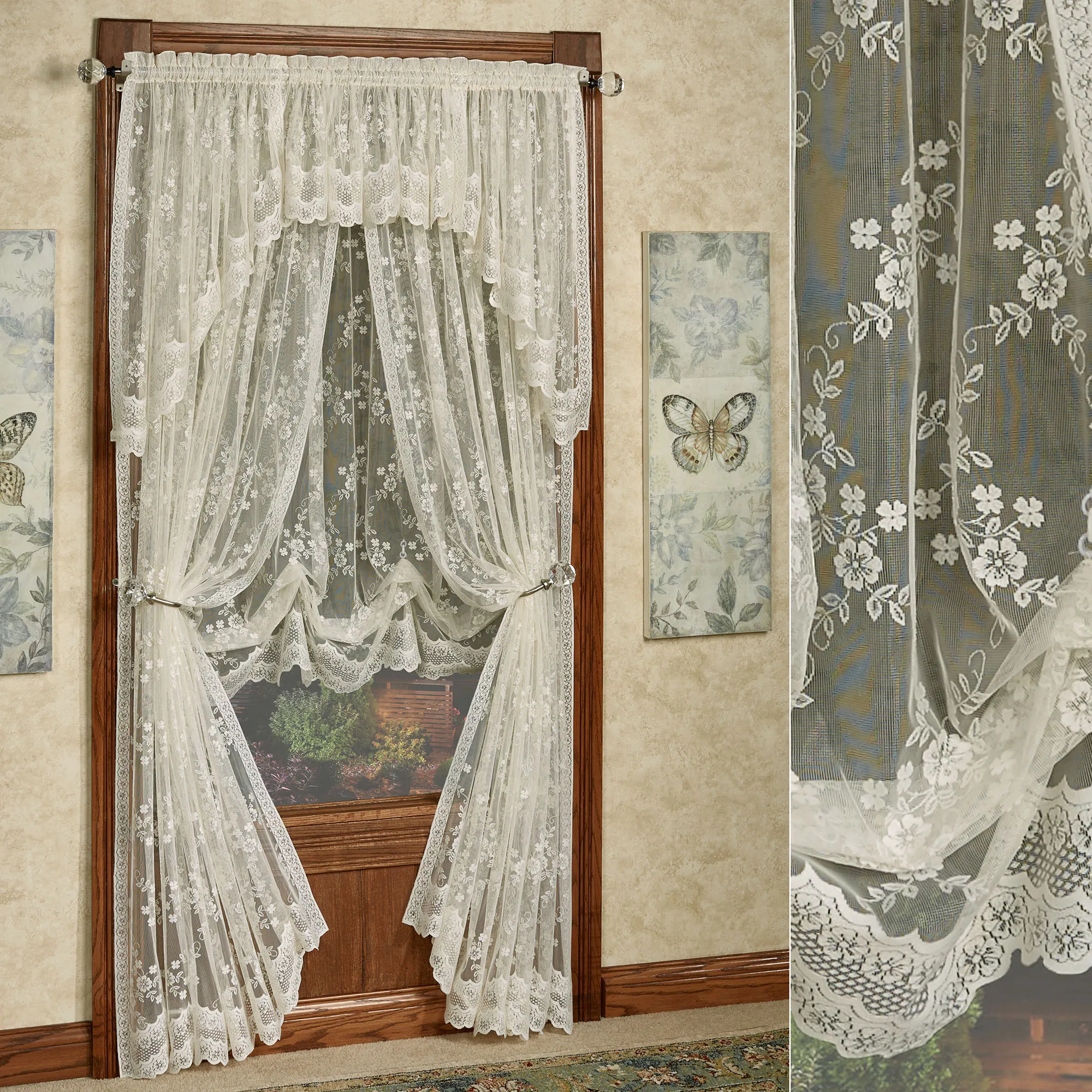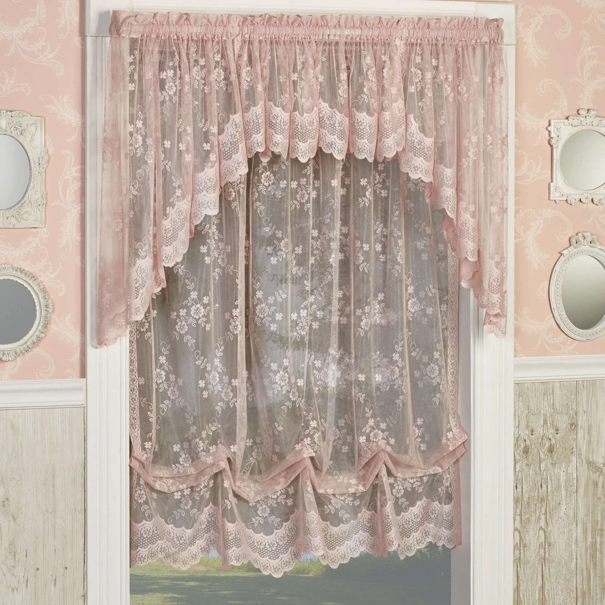 The Juliette Lace Window Treatment is a lovely, delicate ensemble that falls like a graceful veil over your window. Polyester jacquard lace window treatment has vining lattice florals, selvedge sides, and scalloped florals on the bottom edge. Specify Lace Balloon Shade, Lace Swag Valance Pair, Lace Tailored Valance, or Lace Curtain Panel. Balloon Shade has four columns with adjustable rings. Window treatments have a 1.25" rod pocket. Washable. Imported.
