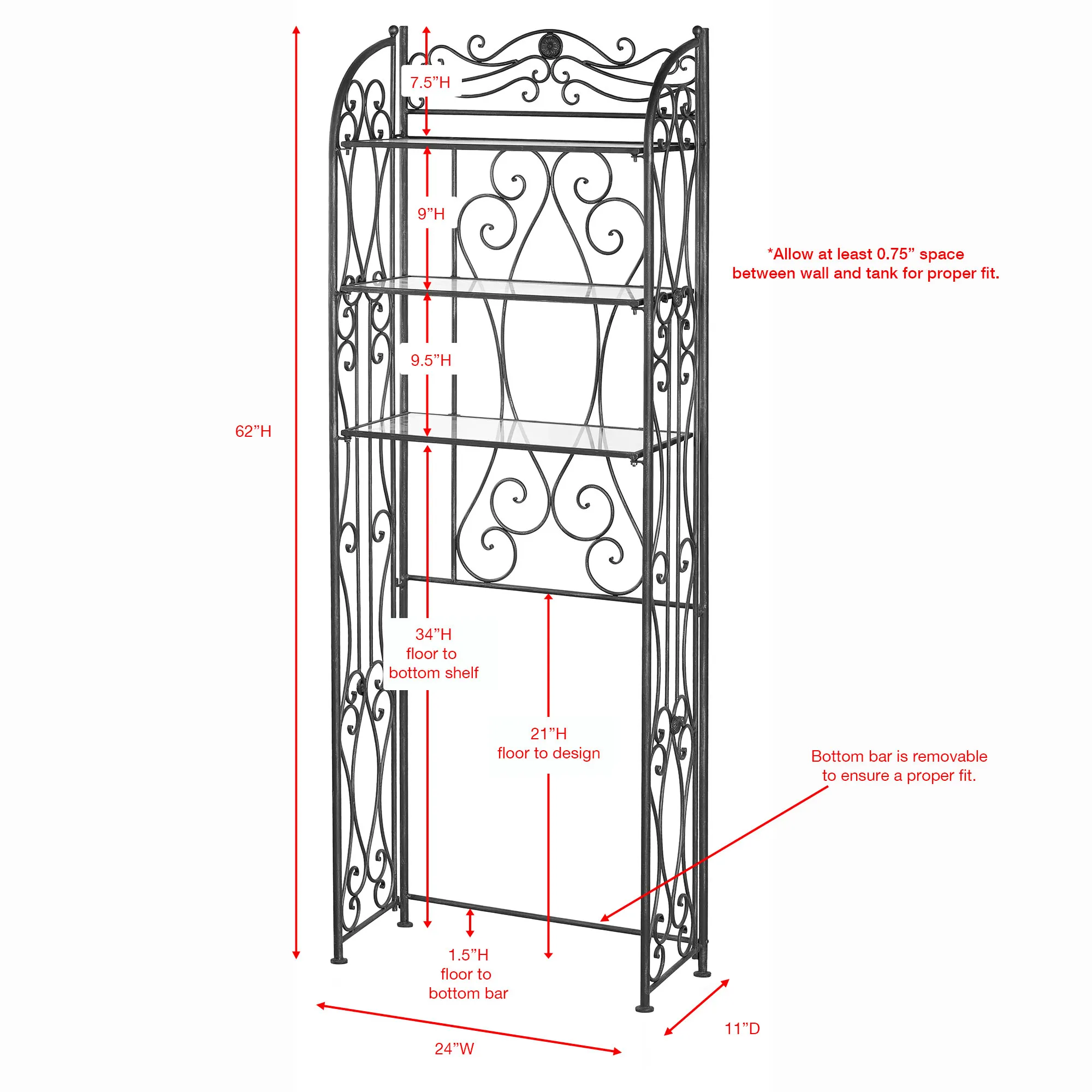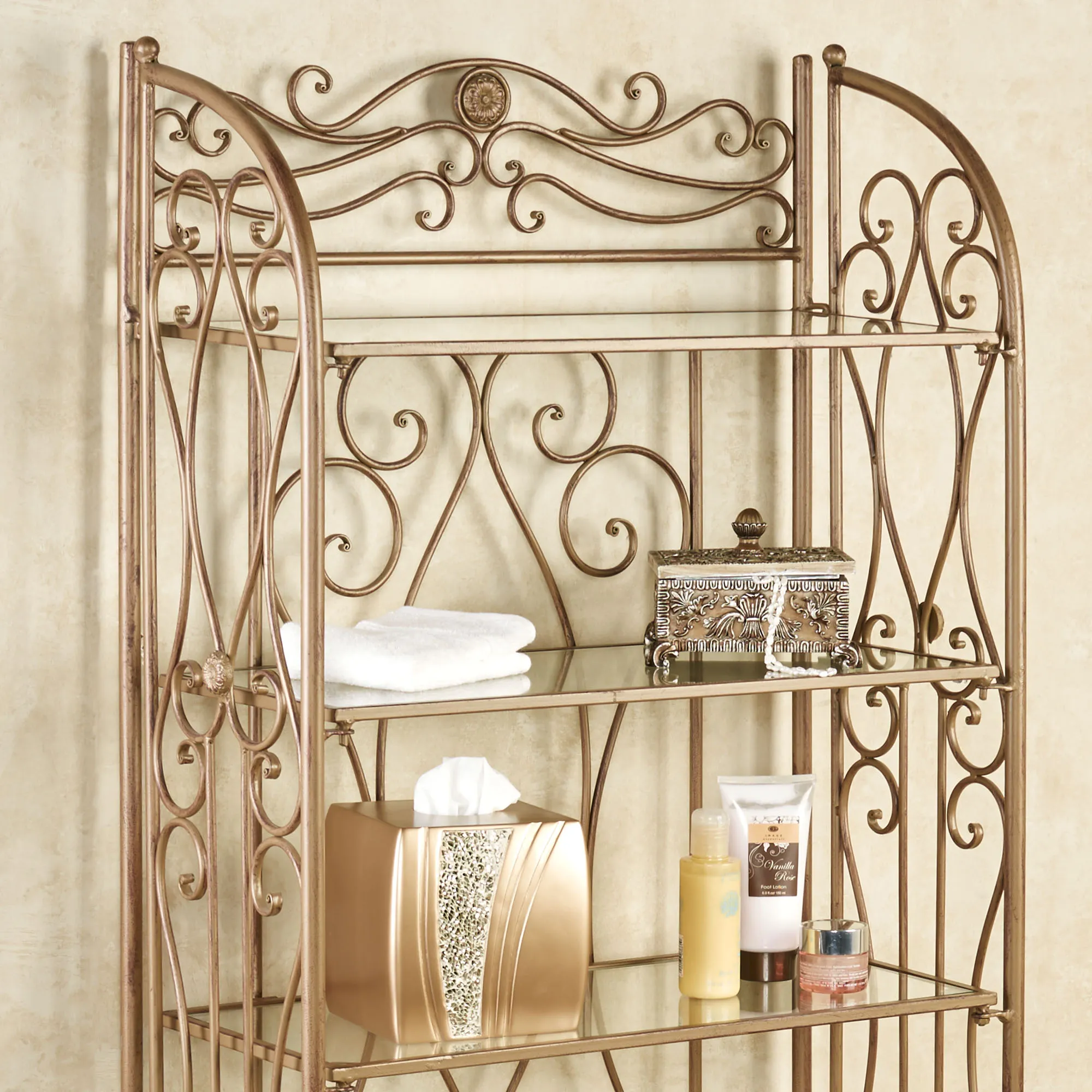 Organize your bath items in elegant fashion with the Kadalynn Satin Gold Bathroom Space Saver. Handcrafted of metal, this charming accent features a swirling scroll design, round cast medallions, and a handpainted, satin gold finish. The freestanding space saver has three shelves with glass inserts. Overall, measures 24"Wx11"Dx62"H; weighs 35 lbs.