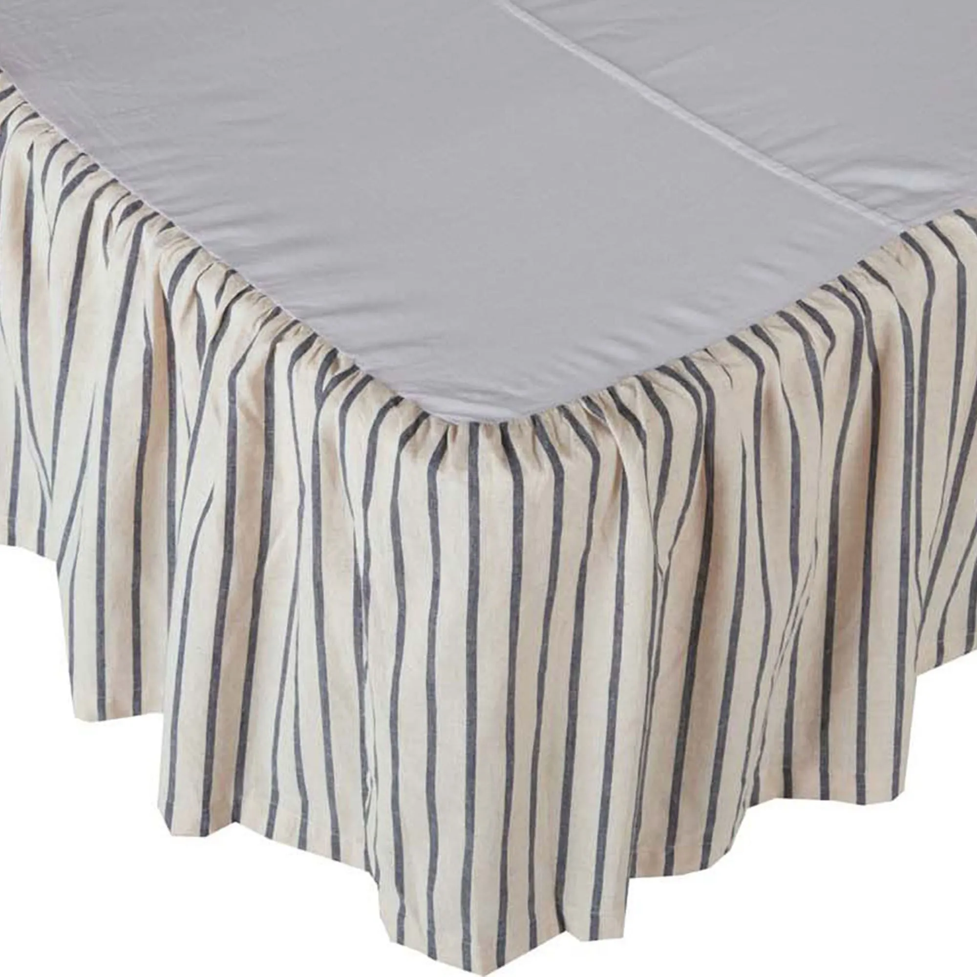 Gathered Bedskirt has printed stripes in dark blue and natural and split corners in the 16" drop. Choose Queen or King.