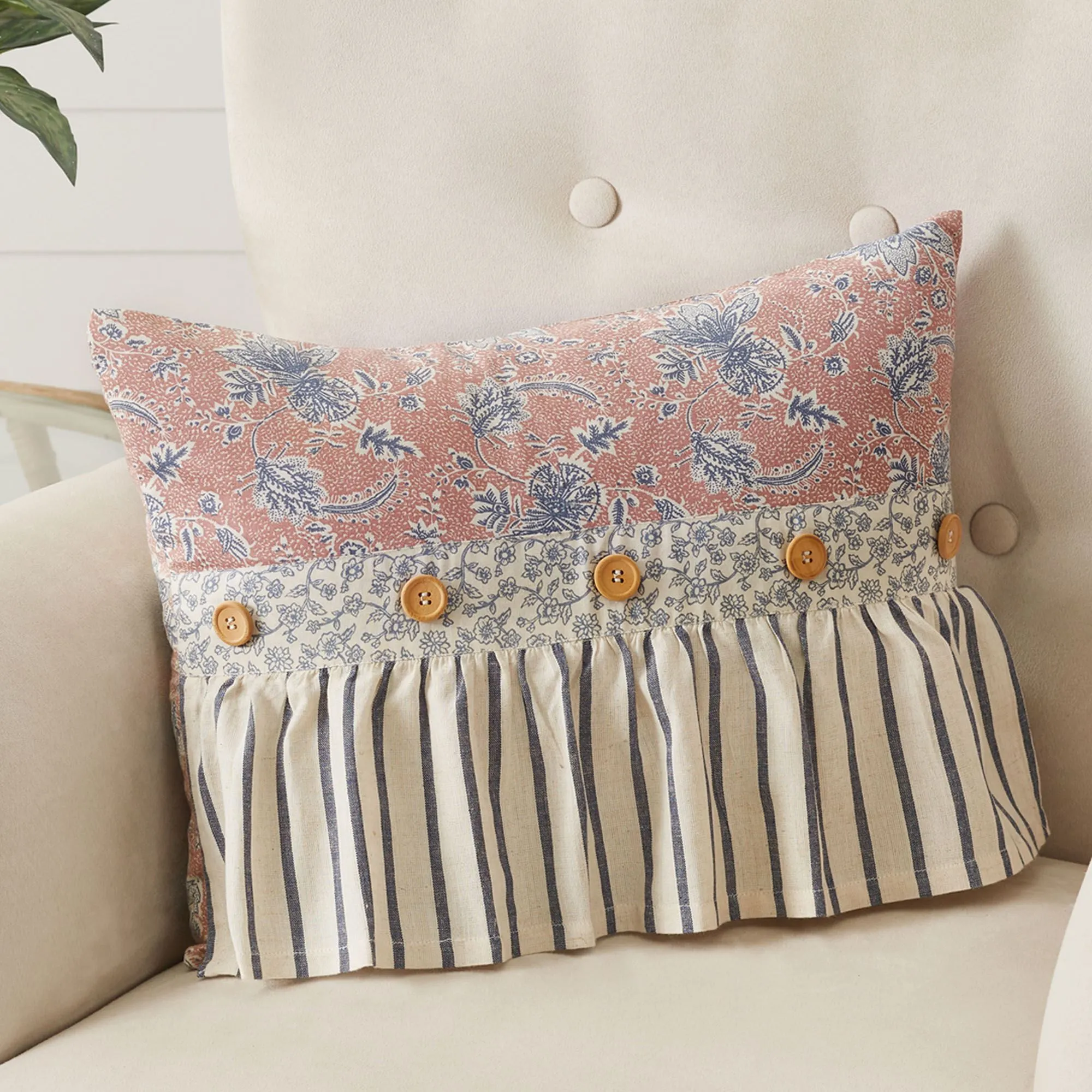 The tailored Rectangle Pillow is pieced with leaves and florals, along with an attached striped "skirt." Pillow also has wooden button accents and a French back closure with buttons. Spot clean.