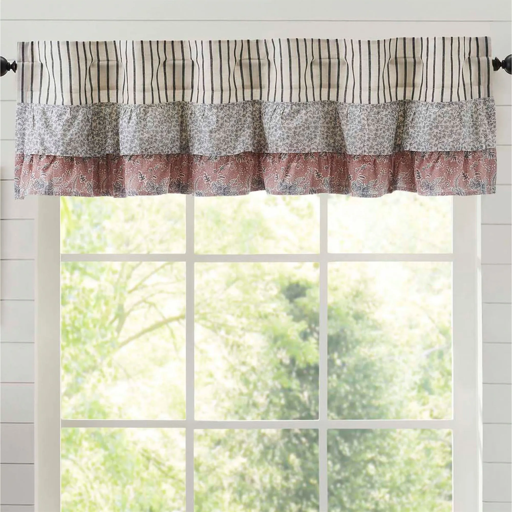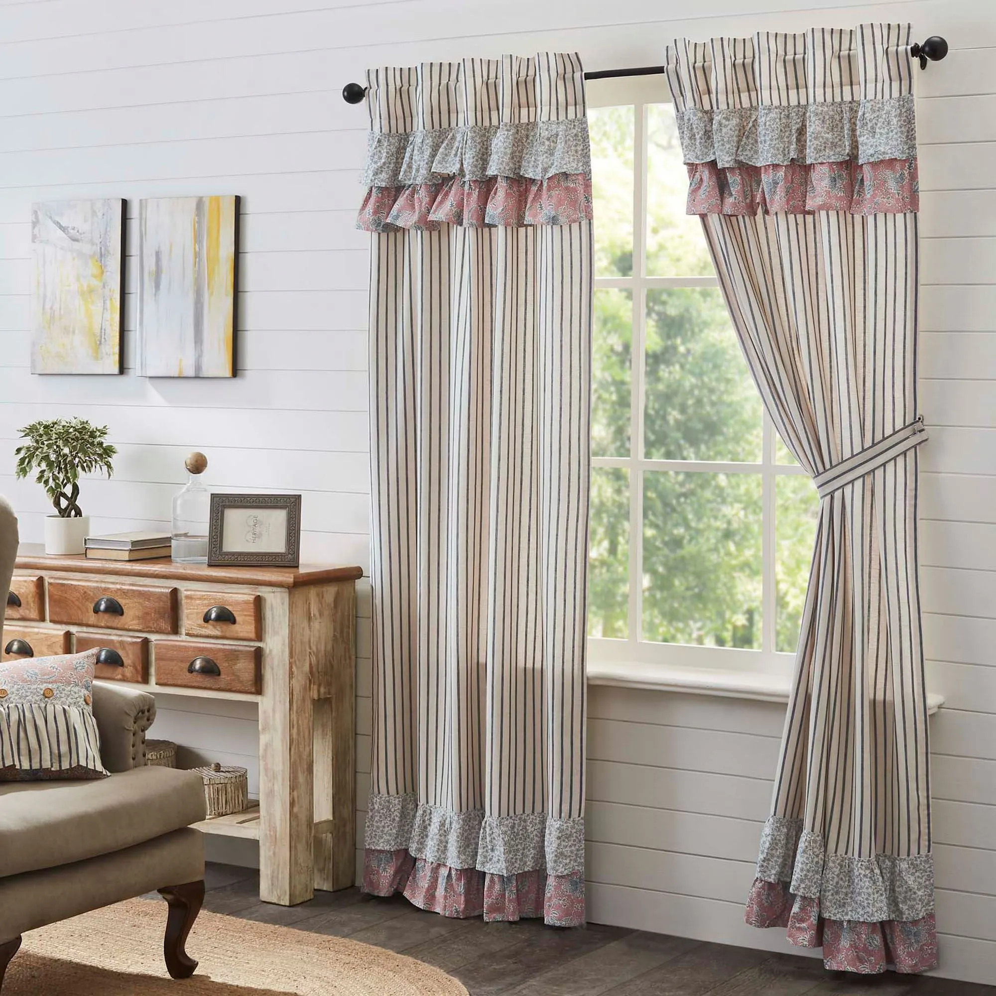 The lined Window Treatment has 3.25" rod pockets. The striped Curtains have ruffle accents and include tiebacks. Available in two sizes. The Ruffled Valance is pieced with stripes, florals, and leaves. Available in two lengths.