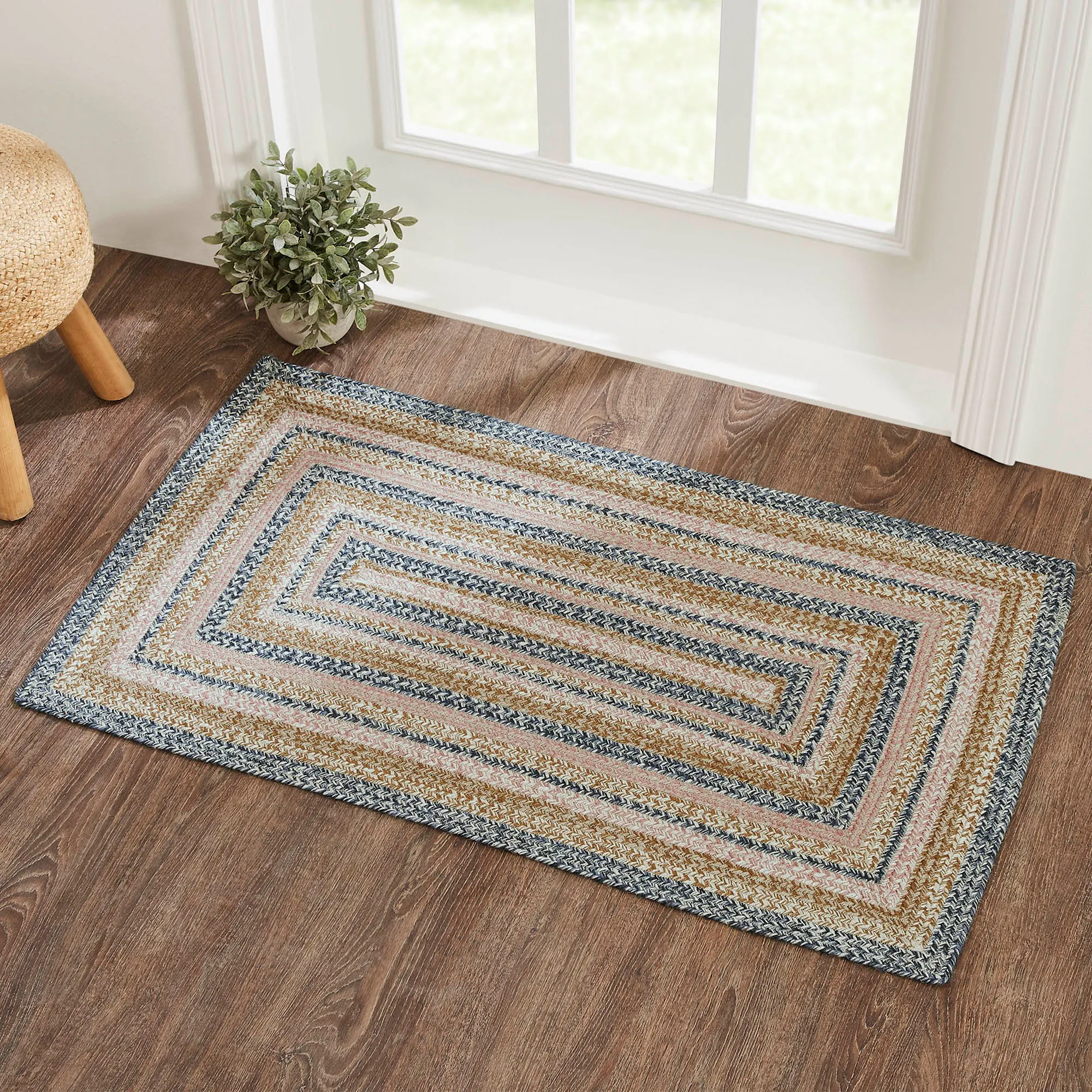 Follow the intriguing pattern on the Kaila Braided Rug. Made of jute/cotton blend/acrylic, this .25" thick rug is machine-braided and stitched. Colors include dark blue, tan, pink, and vanilla. The included PVC rug pad has nonslip properties. Spot clean. Imported.