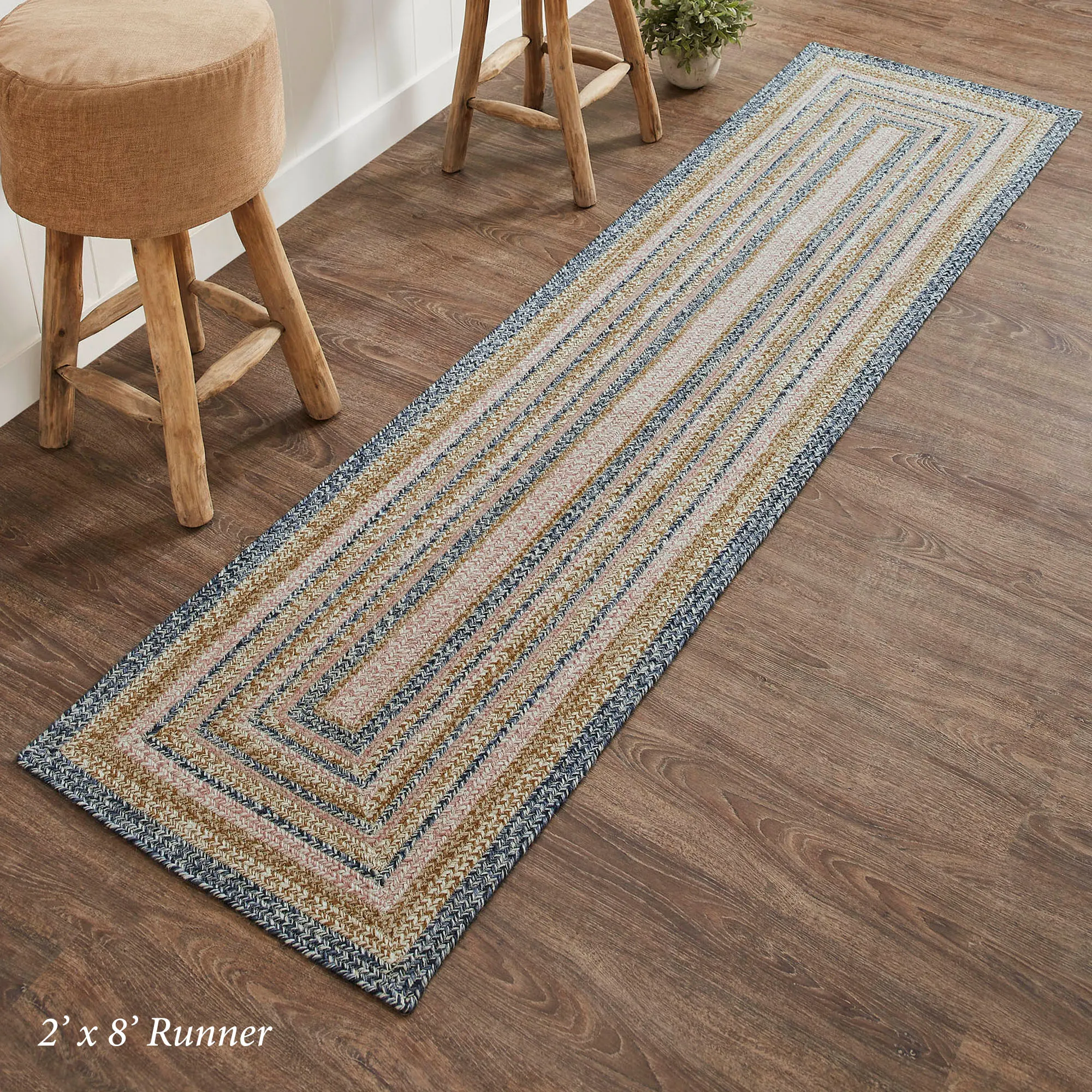 Follow the intriguing pattern on the Kaila Braided Rectangle Rug Runner. Made of jute/cotton blend/acrylic, this .25" thick rug is machine-braided and stitched. Colors include dark blue, tan, pink, and vanilla. The included PVC rug pad has nonslip properties. Spot clean. Imported.