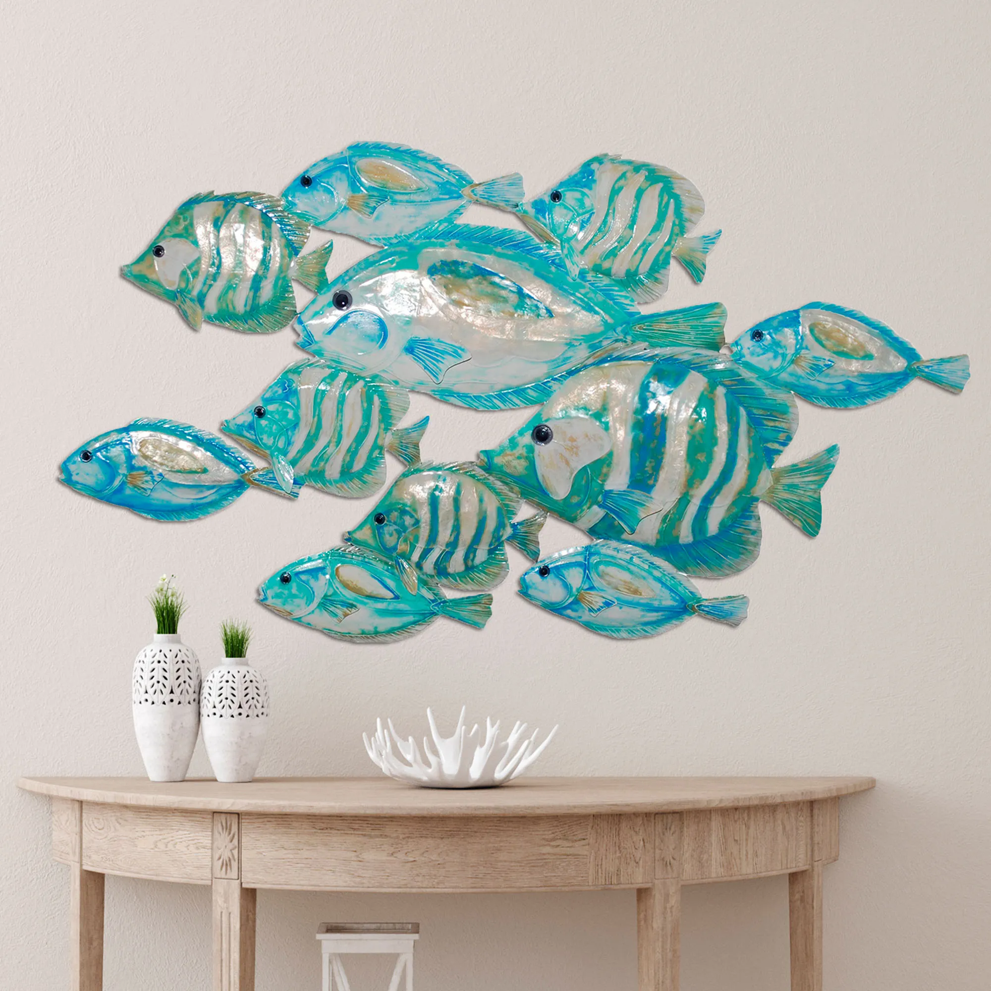 The sweet Kailani Fish comfortably swim together. This handcrafted metal and capiz shell wall art features differently sized tang fish, some with pretty patterns. The textured metal has a powder-coat finish, and the edges are reinforced; the capiz shells are sealed with a water-based sealant. Colors include shades of soft blue, turquoise, off-white, light green, and black. Due to the handcrafted nature of this item, slight variations may occur. Indoor or covered outdoor use. Lightweight fish wall art measures 43"Wx3"Dx26"H.