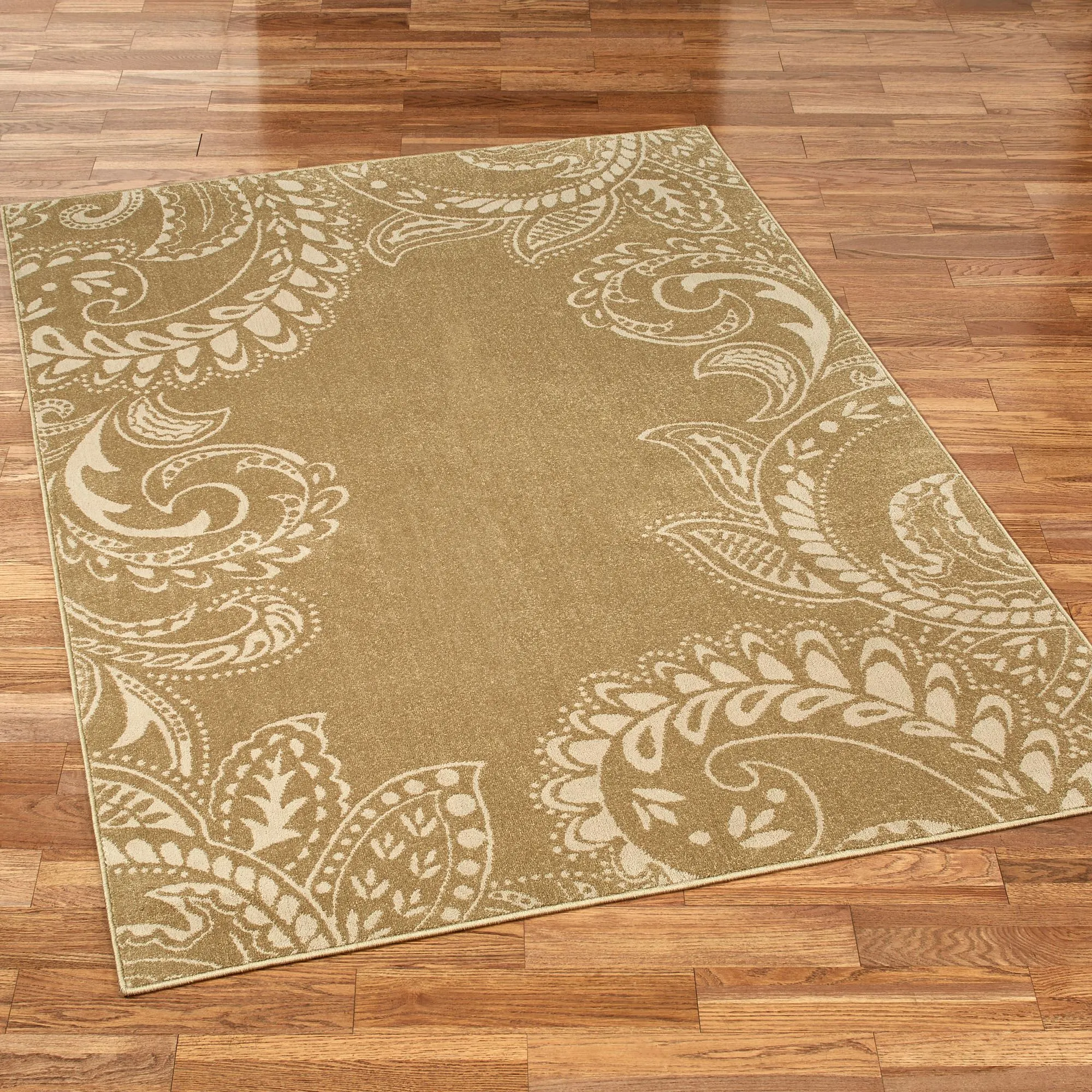 Traditional scrolls and elegant paisley designs meander beautifully around the borders of the Kamaria Golden Bronze Area Rugs. The machine-woven, heat-set polypropylene rugs, .5" thick, have patterns in a natural color on a golden bronze ground. We recommend professional cleaning by a rug cleaner.