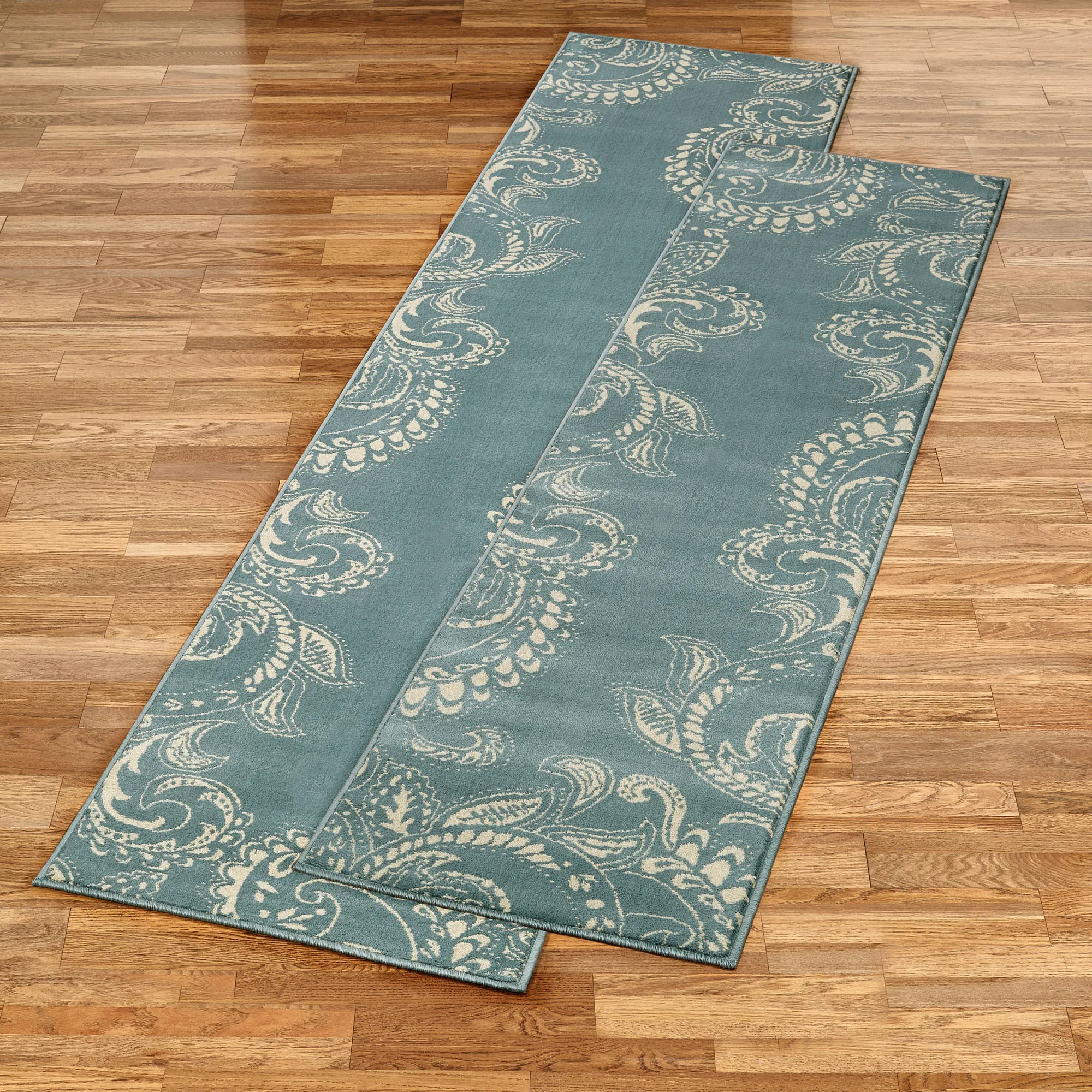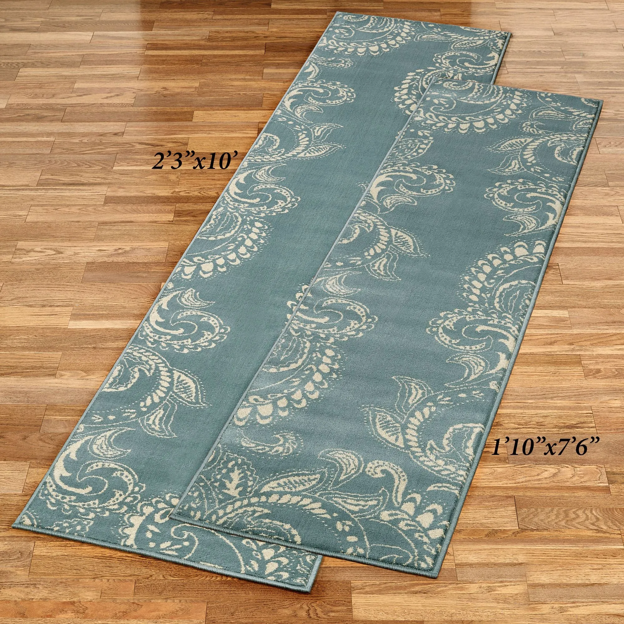 Traditional scrolls and elegant paisley designs meander beautifully around the borders of the Kamaria Parisian Blue Rug Runners. The machine-woven, heat-set polypropylene rugs, .5" thick, have patterns in a natural color on a Parisian blue ground. We recommend professional cleaning by a rug cleaner.