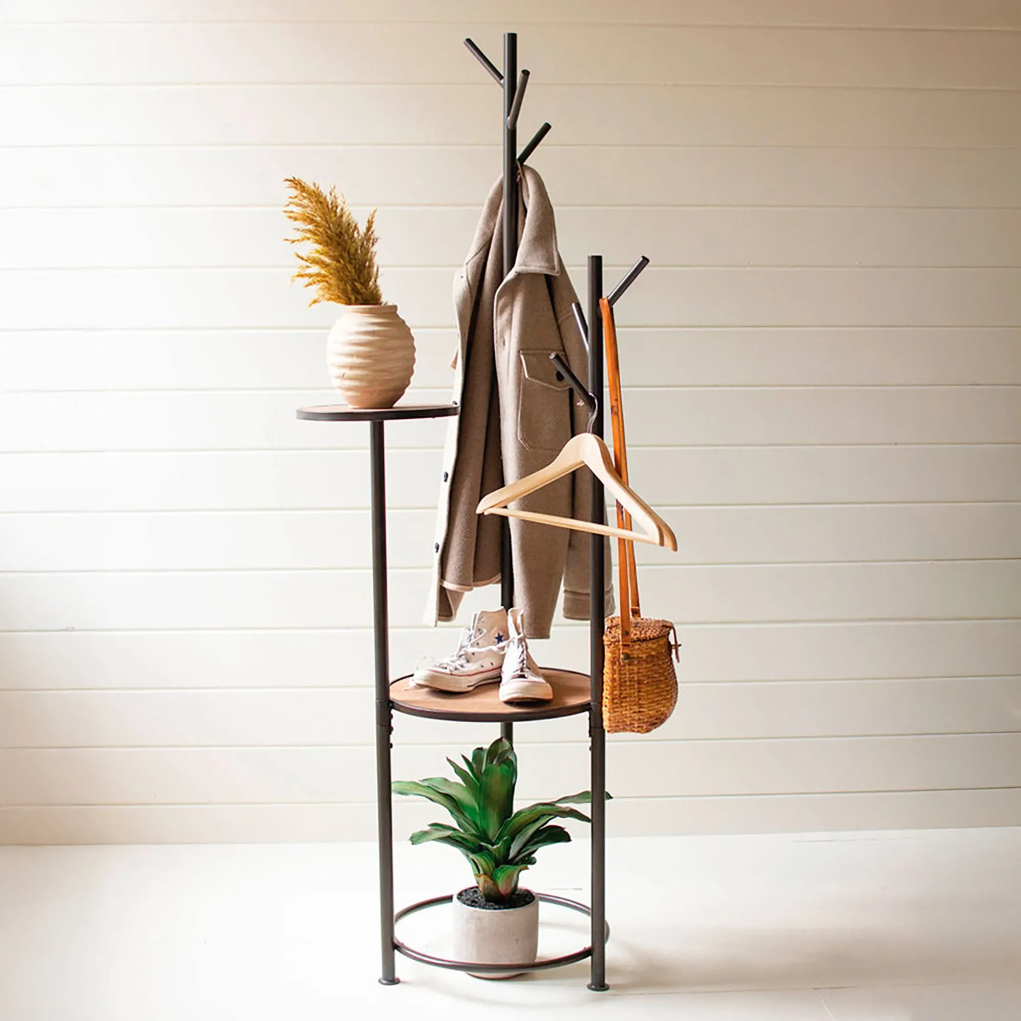 Kamdyn Metal and Wood Coat Rack Stand with Round Shelves