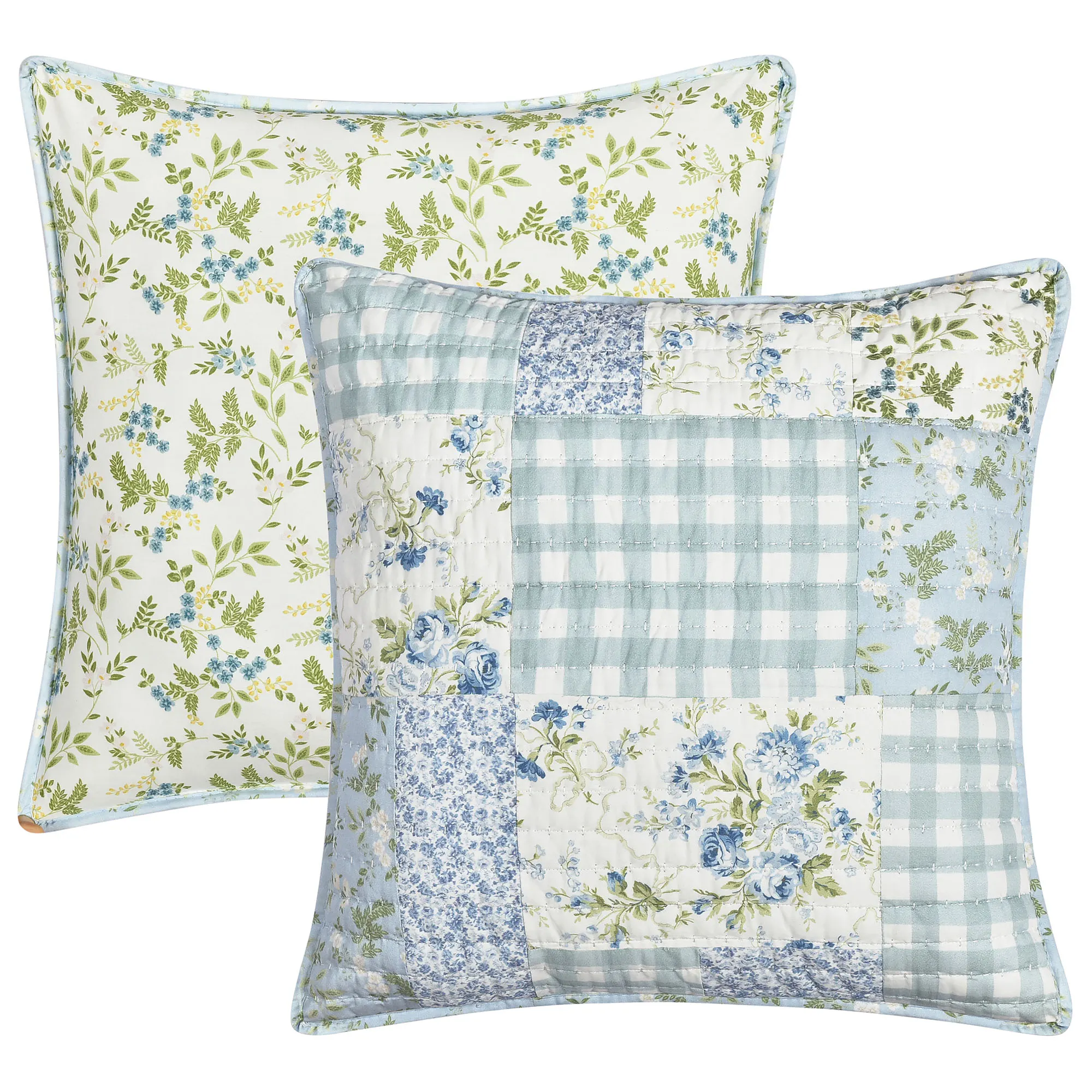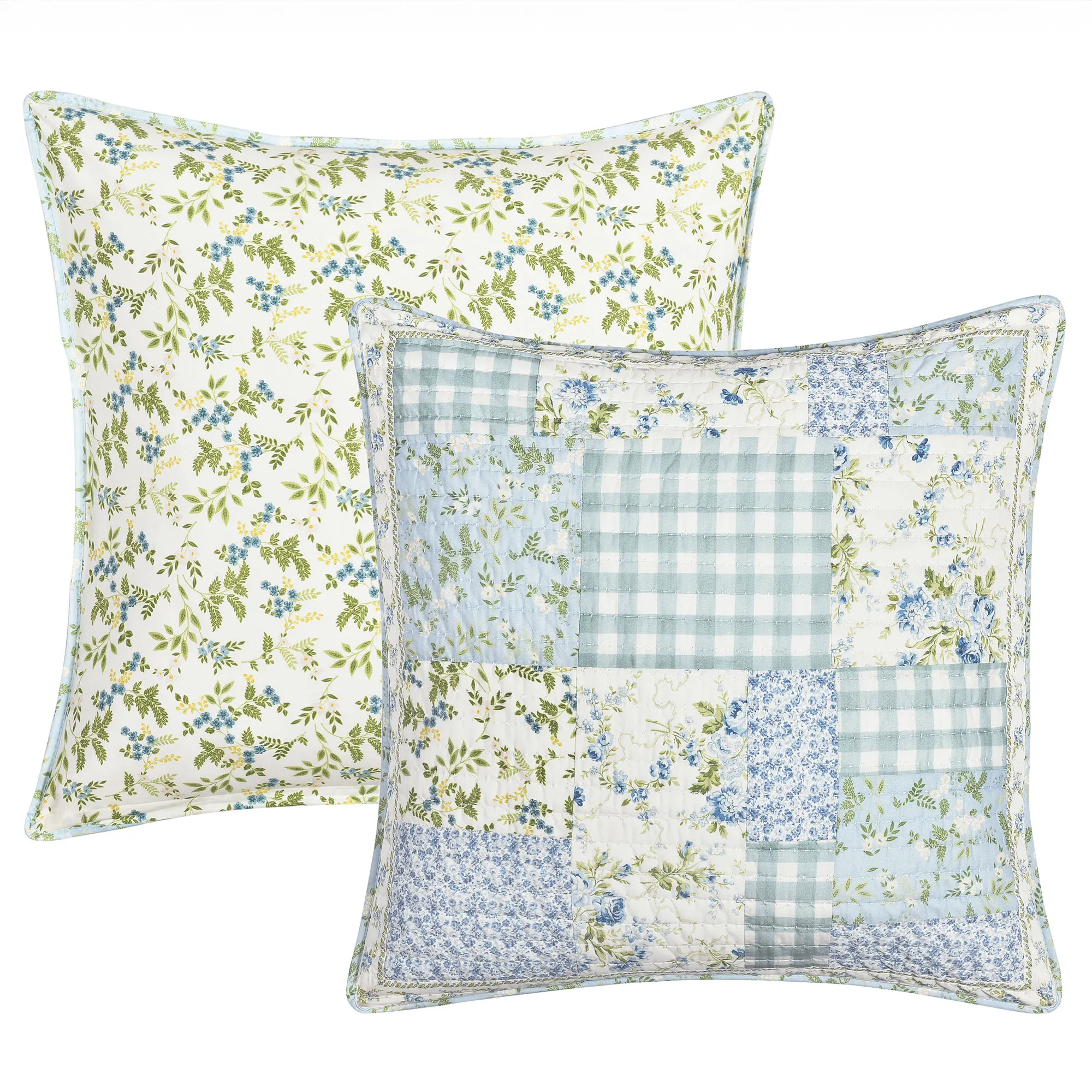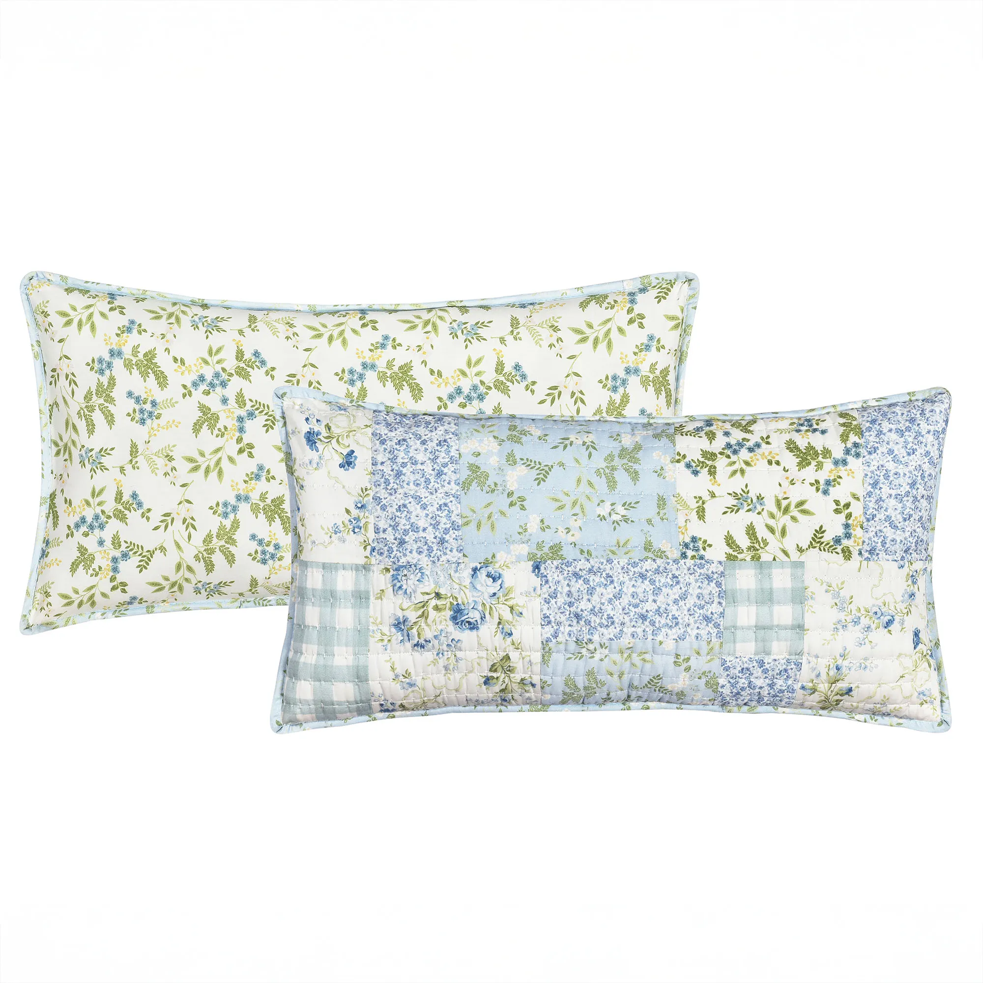 Allow the vintage charm of the Karalena Bedding to grace your space with whimsy and delight. From J. Queen Cottage, the cotton ensemble features a pieced patchwork design of lovely blossoming rose, old-fashioned ditsy floral, and classic gingham plaid blocks in shades of blue, green, and ivory. An ivory cotton reverse of blue, golden yellow, and green ditsy florals patterns each item, while bound edges add a sweet finish. Hand-stitched detailing adds authentic charm throughout the designs. All reverses are non-quilted, except on the Quilt.