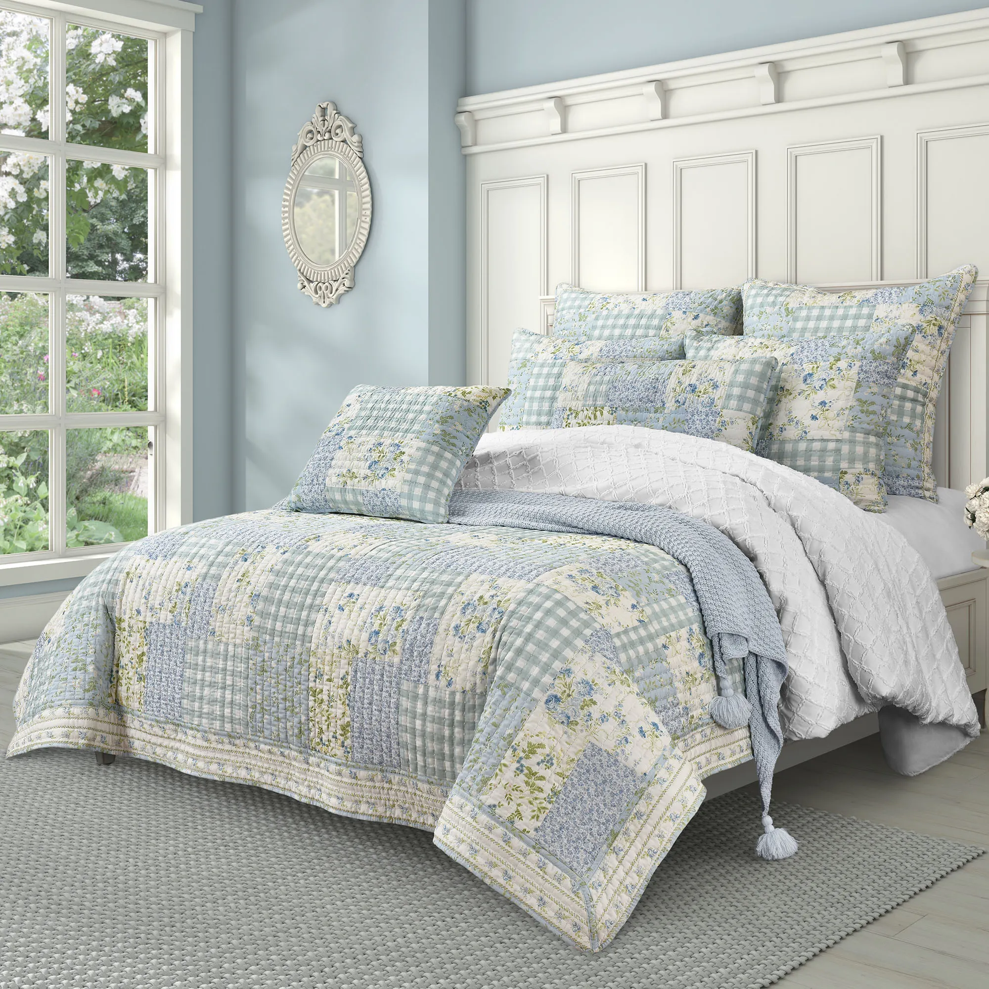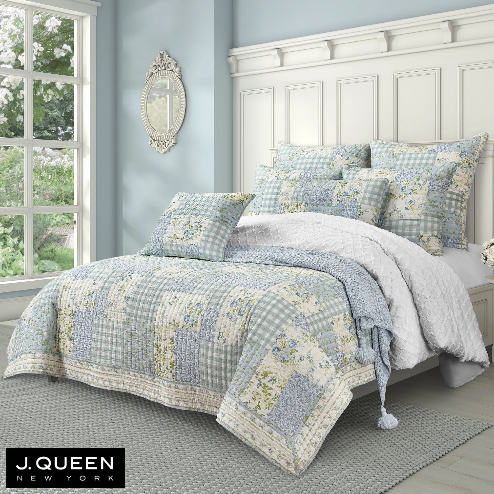 Grace your bedroom with the vintage charm of the Karalena Patchwork Quilt from J. Queen Cottage. The cotton quilt features a pieced patchwork design of rose, ditsy floral, and gingham plaid blocks in shades of blue, green, and ivory. Quilt is bordered in a mitred frame and reverses to ivory with blue, golden yellow, and green ditsy florals. Fill is polyester. Machine washable. Imported. Sorry, the light blue throw and white comforter shown are not available.