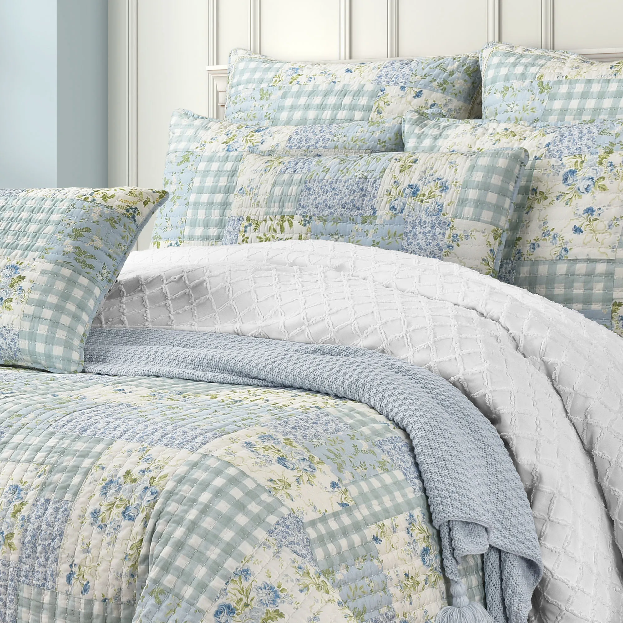 • Patchwork quilt features roses, ditsy florals, and gingham