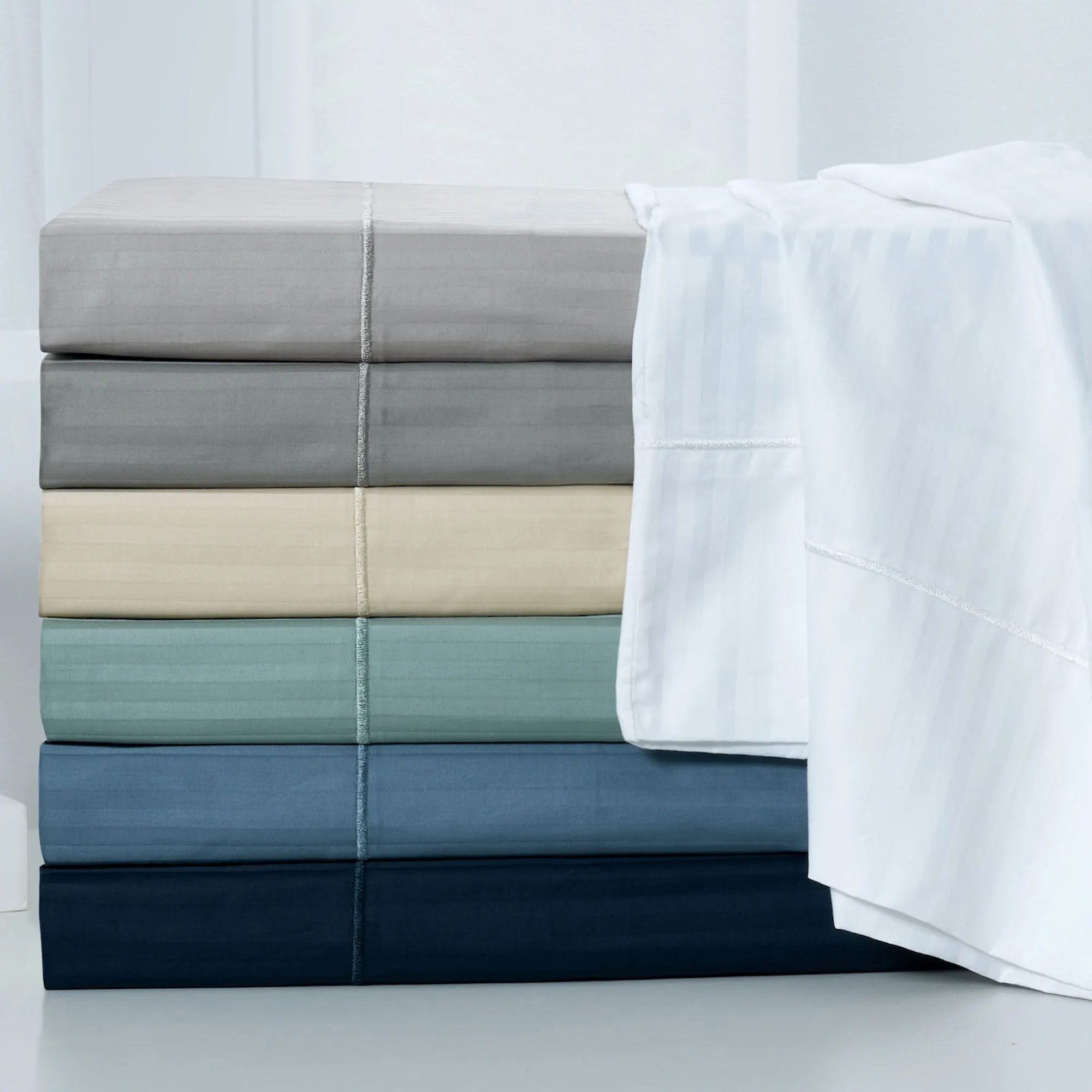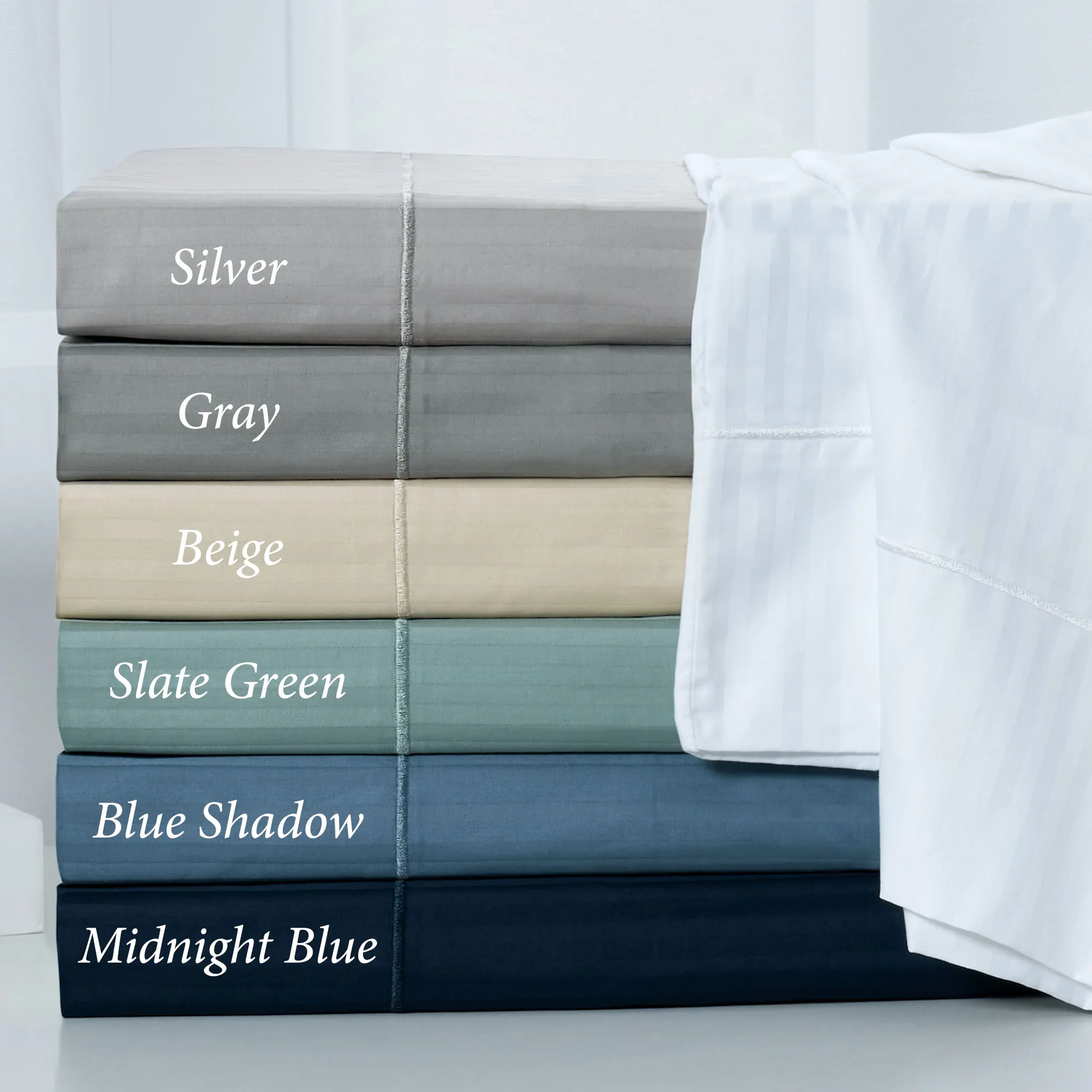 Finish your bedding ensemble with the class and sophistication of the Kathy Ireland Stripe Sheet Set. From Kathy Ireland Home(R), the 500 T.C. cotton sateen sheet set features a solid color woven damask stripe design crafted from long staple cotton. Sheet set includes a flat sheet, a fitted sheet, and two pillowcases (one in Twin set). Flat sheet and pillowcase(s) have a 4" embroidered hem. With 16" deep pockets to fit up to an 18" deep mattress, the fitted sheet has all-around elastic with OptiFit, which is a 1" thick elastic band that ensures a tight fit on most mattresses. Choose Beige, Blue Shadow, Gray, Midnight Blue, Slate Green, Silver, or White. Machine washable. Imported.