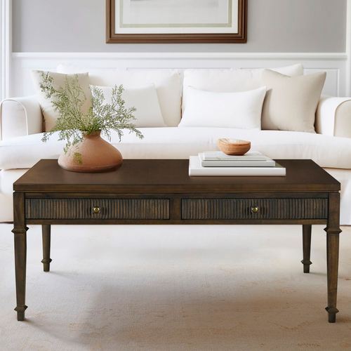 Display books or decorative items on the Kenna Coffee Table. This sophisticated, wooden table, by Martha Stewart, has an espresso dark brown wood finish, two drawers with fluted detailing and antique gold metal knobs, and square tapered legs with plastic glides to protect floor surfaces. The interior drawer dimensions are 10.75"Wx13.75"Dx2.25"H each. The maximum recommended weight on top is 85 lbs. Overall, the coffee table measures 44"Wx24"Dx18"H; weighs approx. 51 lbs.