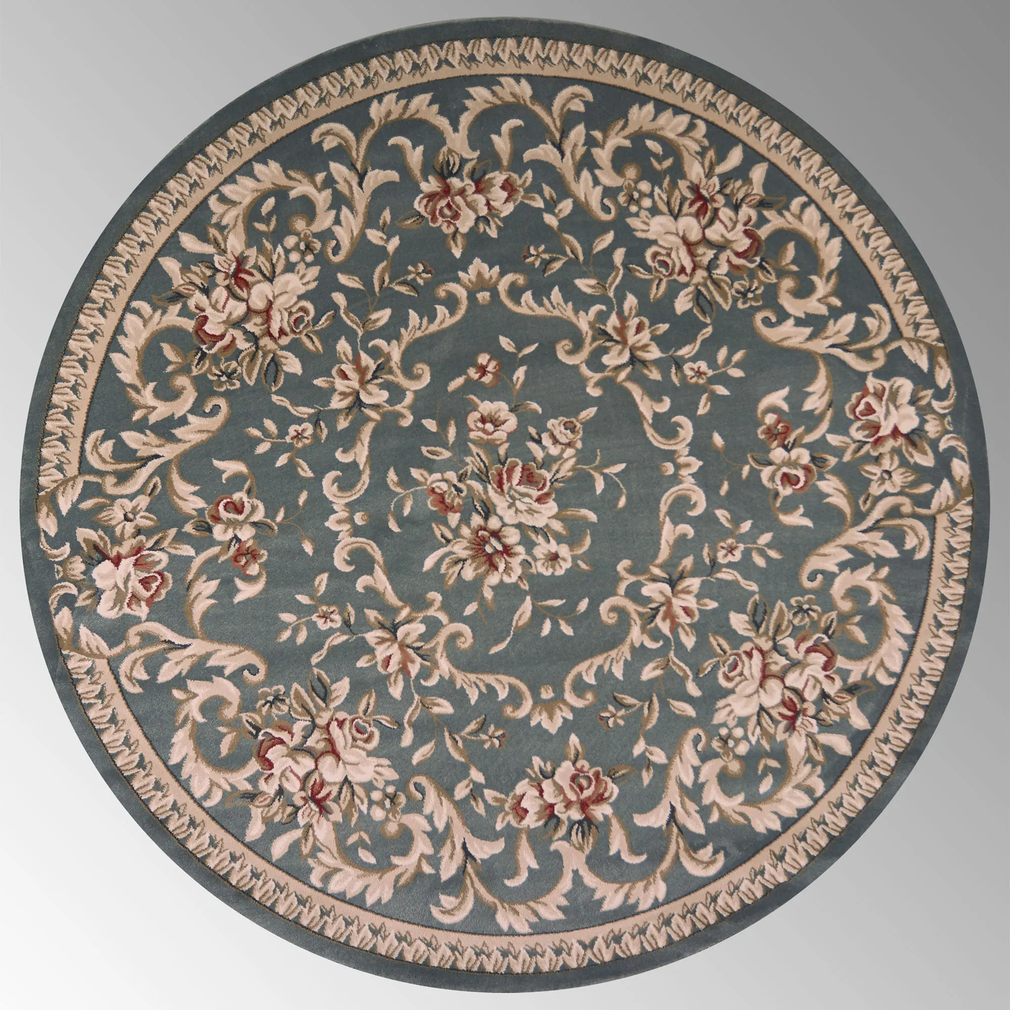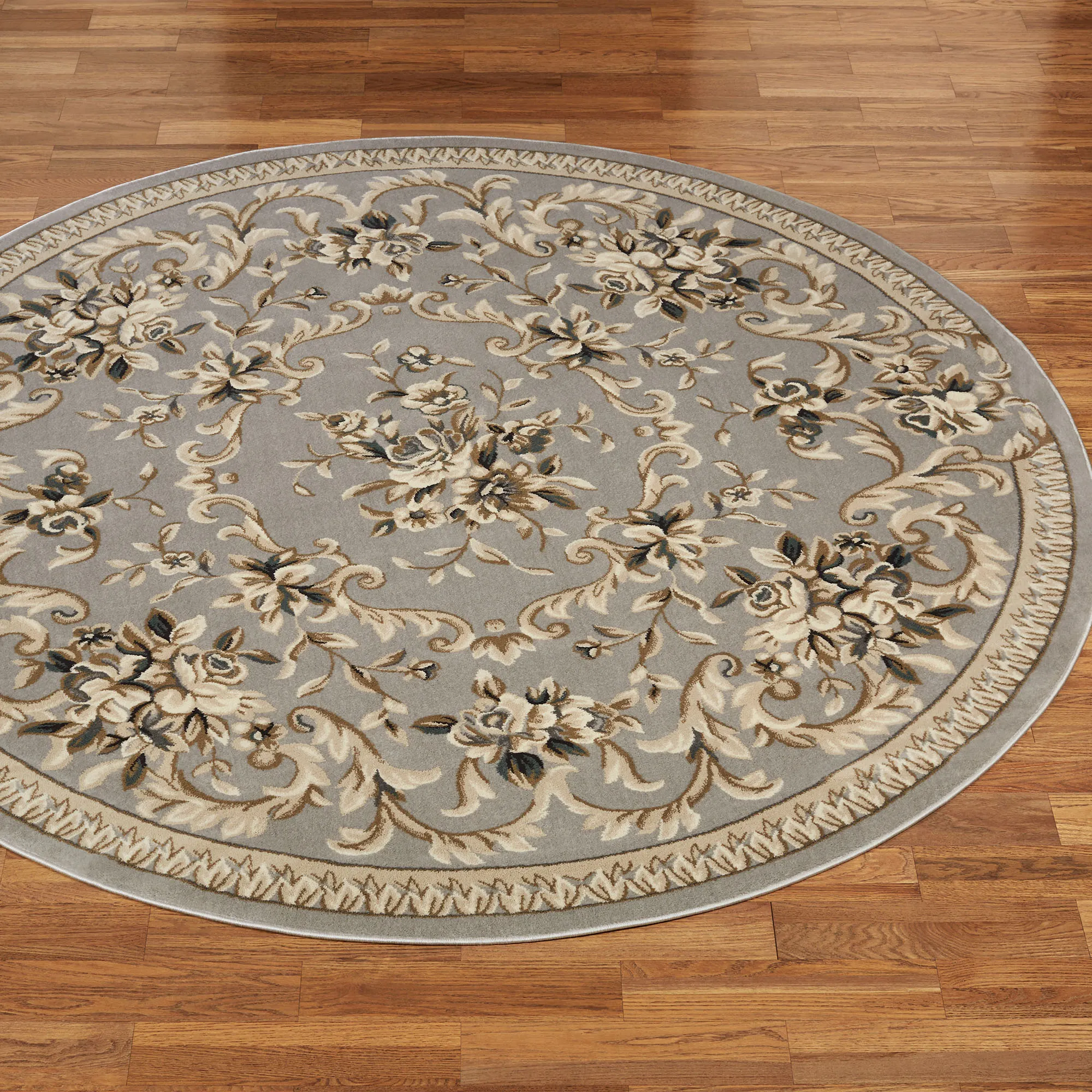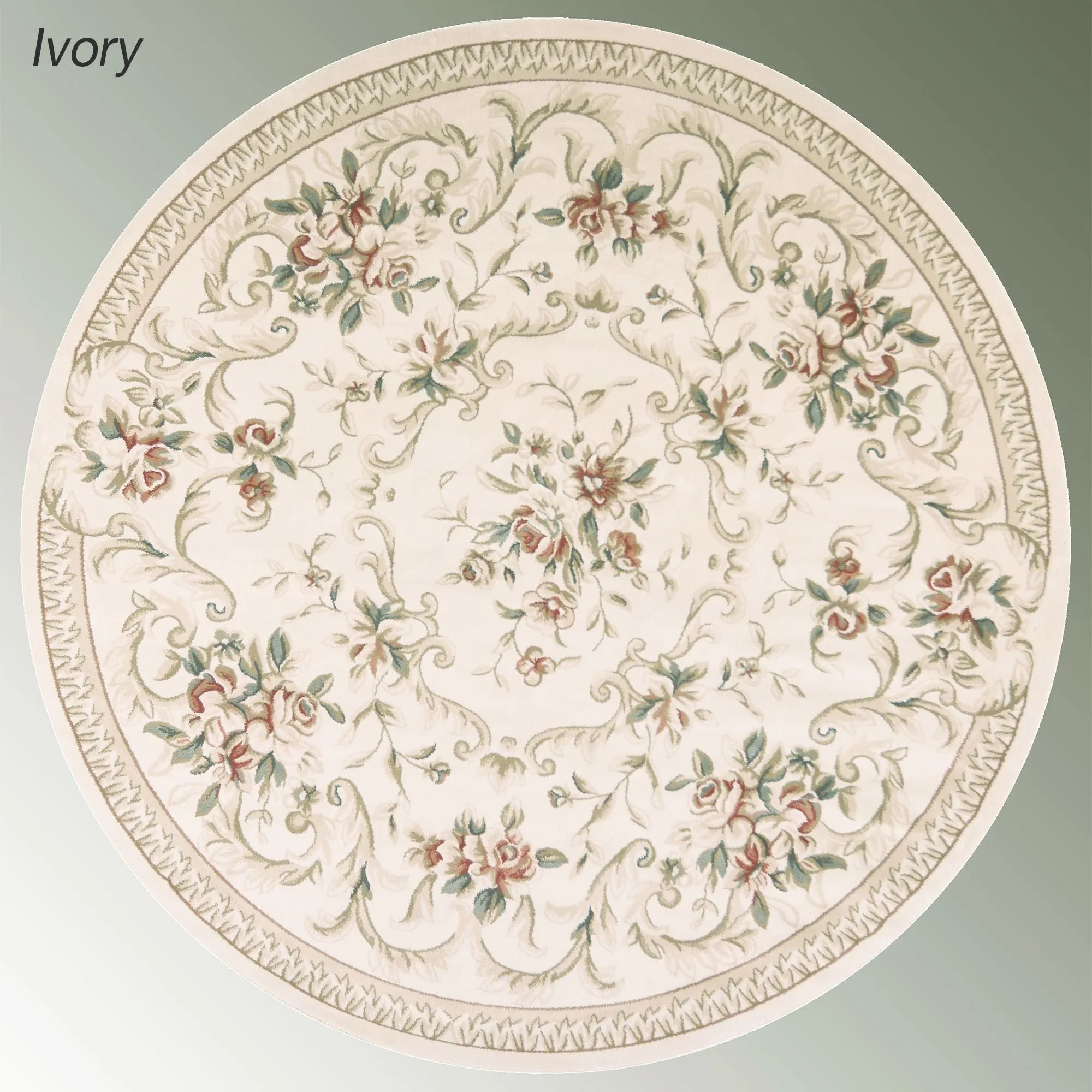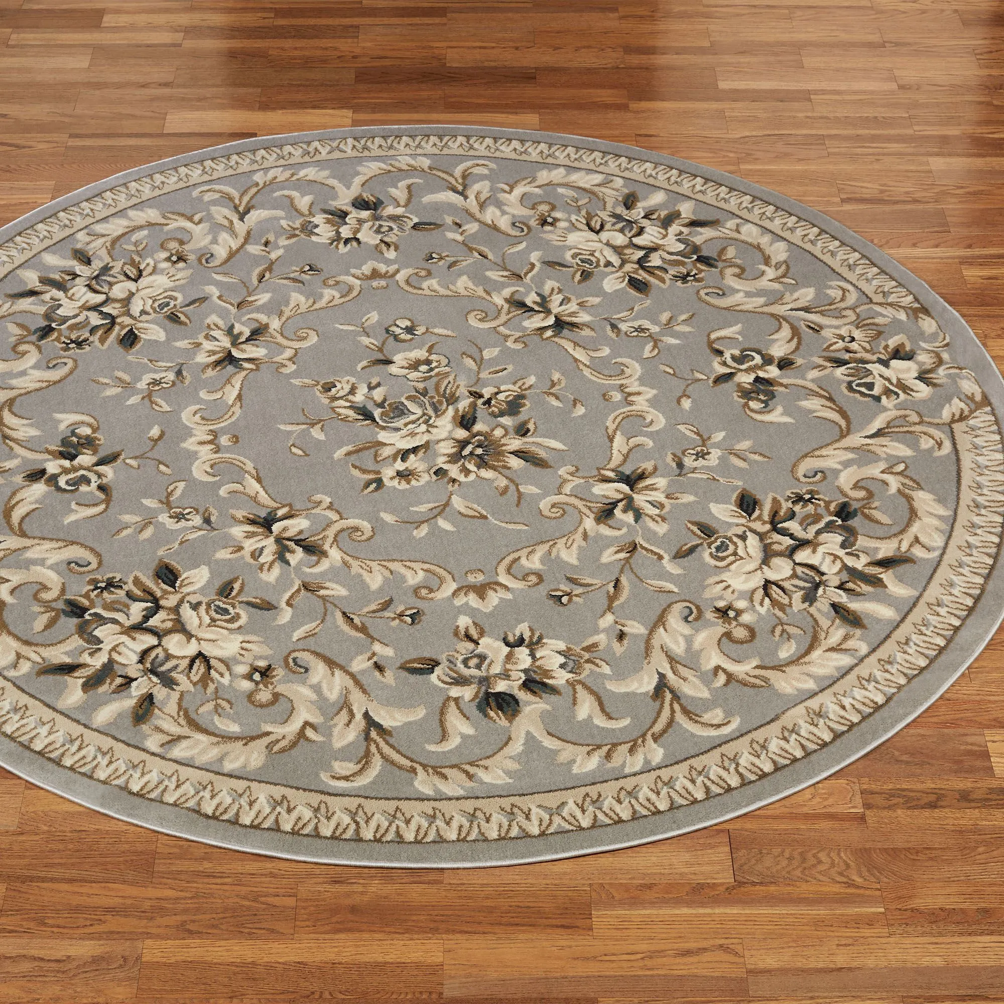The swirling florals and leaves on the Kennesaw Round Rug add a classic touch of elegance. Power-loomed of polypropylene, this area rug, .5" thick, features an ornate traditional design. Platinum Gray includes shades of cream, tan, and gray. Ivory includes shades of blue, pink, red, beige, and ivory. Slate Blue includes shades of pink, beige, and ivory. We recommend professional cleaning by a rug cleaner. Imported.