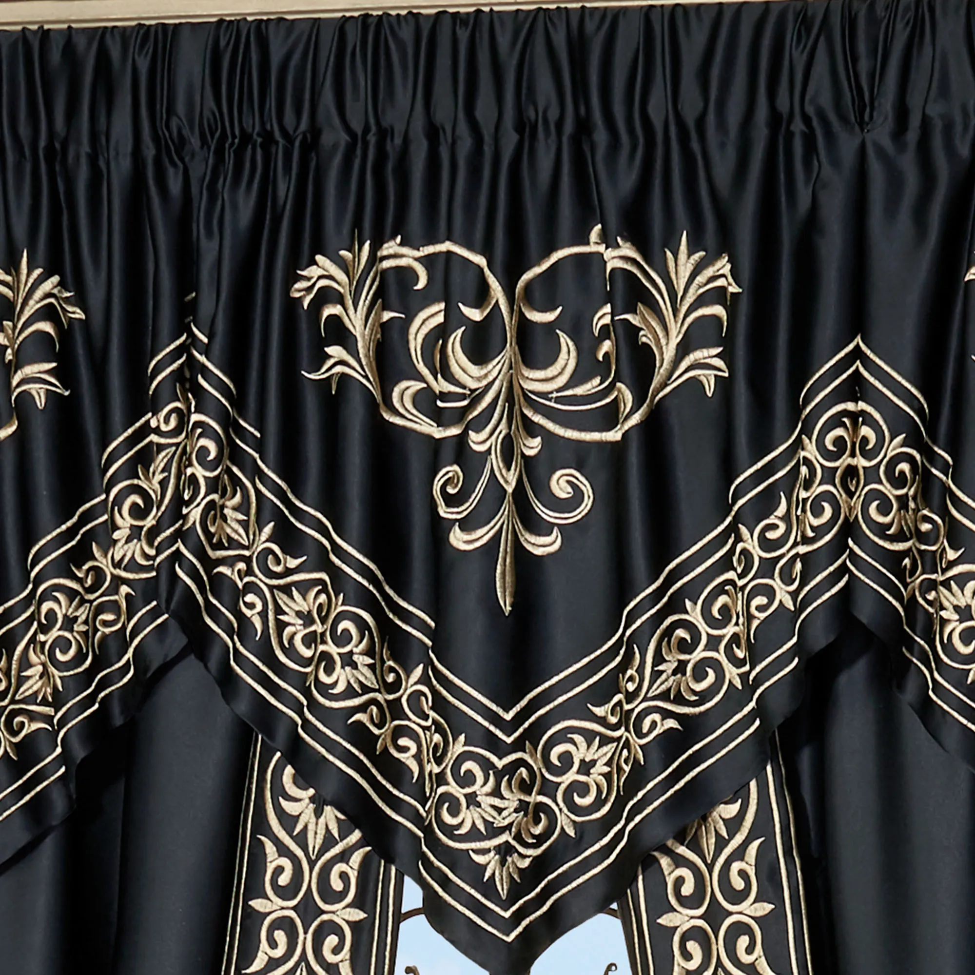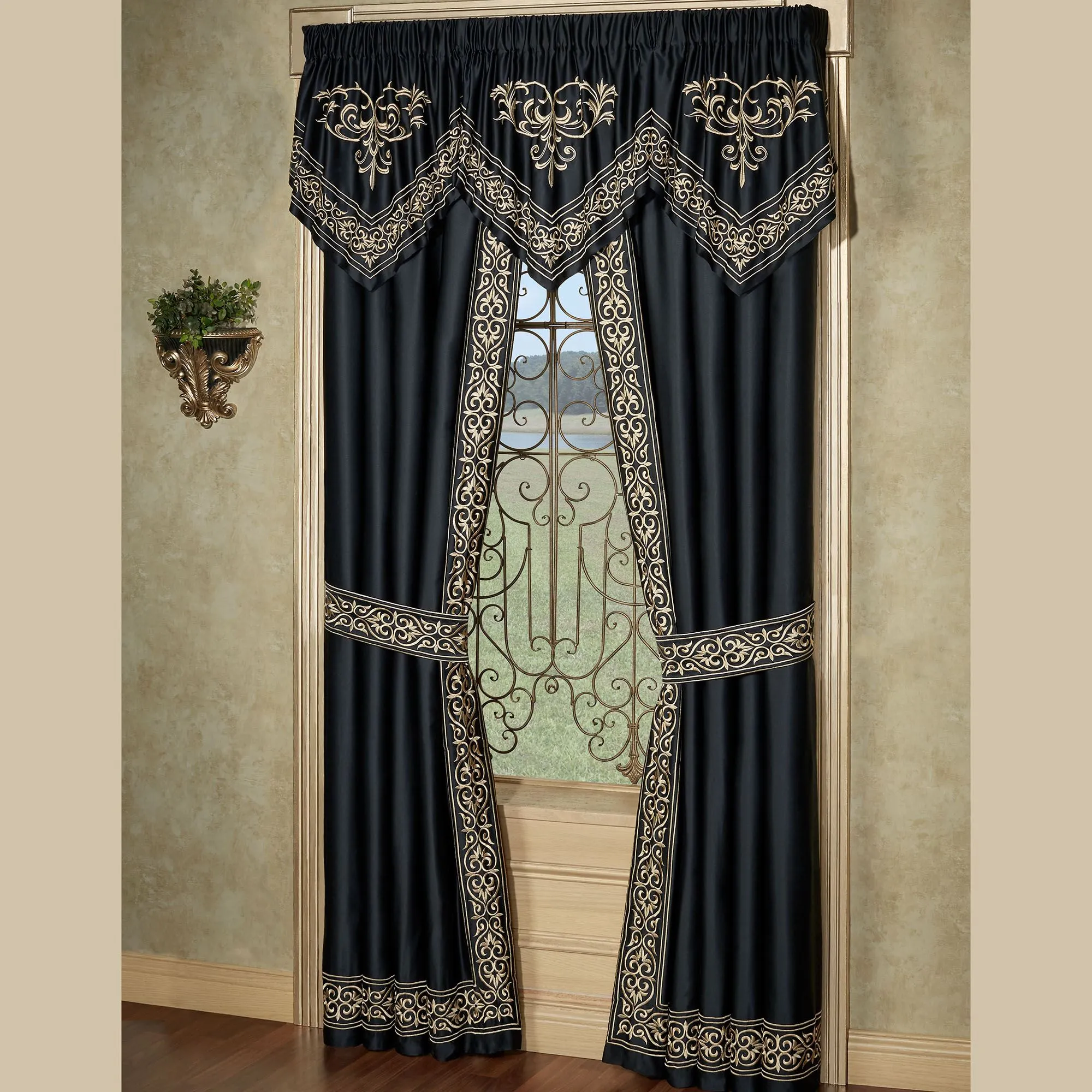 Transform your space into that of an exquisite palace with the Kensington Ascot Window Treatment. In beautiful polyester sateen, the black window treatment features grandly embroidered golden scrollwork framing for elegant definition. Lined window treatment has tailored framed bottom edges and 3" rod pockets. Specify Ascot Valance or Curtain Pair. Each Ascot Valance also has an embroidered swag accent. Curtain Pair also has embroidered framing on the inside edges and includes tiebacks. For best results, dry clean. Imported. The curtain pair width is the total width of two panels together.