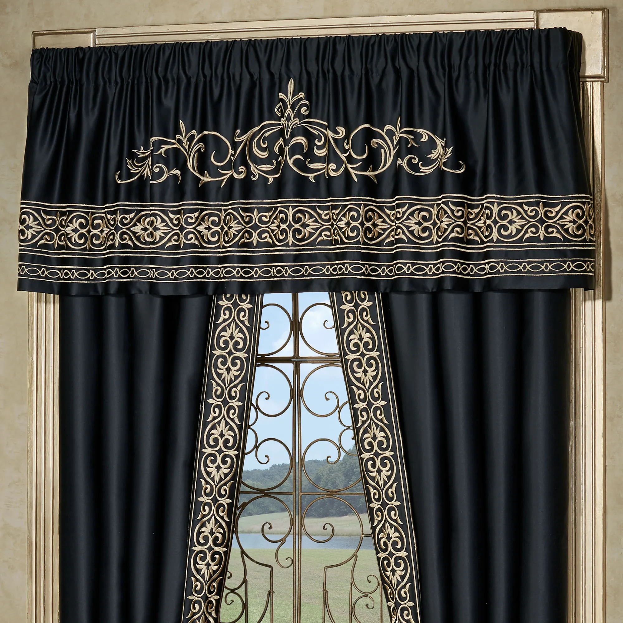Window Treatment has 3" rod pockets. Curtain Pair is 84"W; choose 84"L or 96"L. Each Ascot Valance is 32"Wx22"L. Empire Valance is 110"Wx28"L. Tailored Valance is 72"Wx20"L.