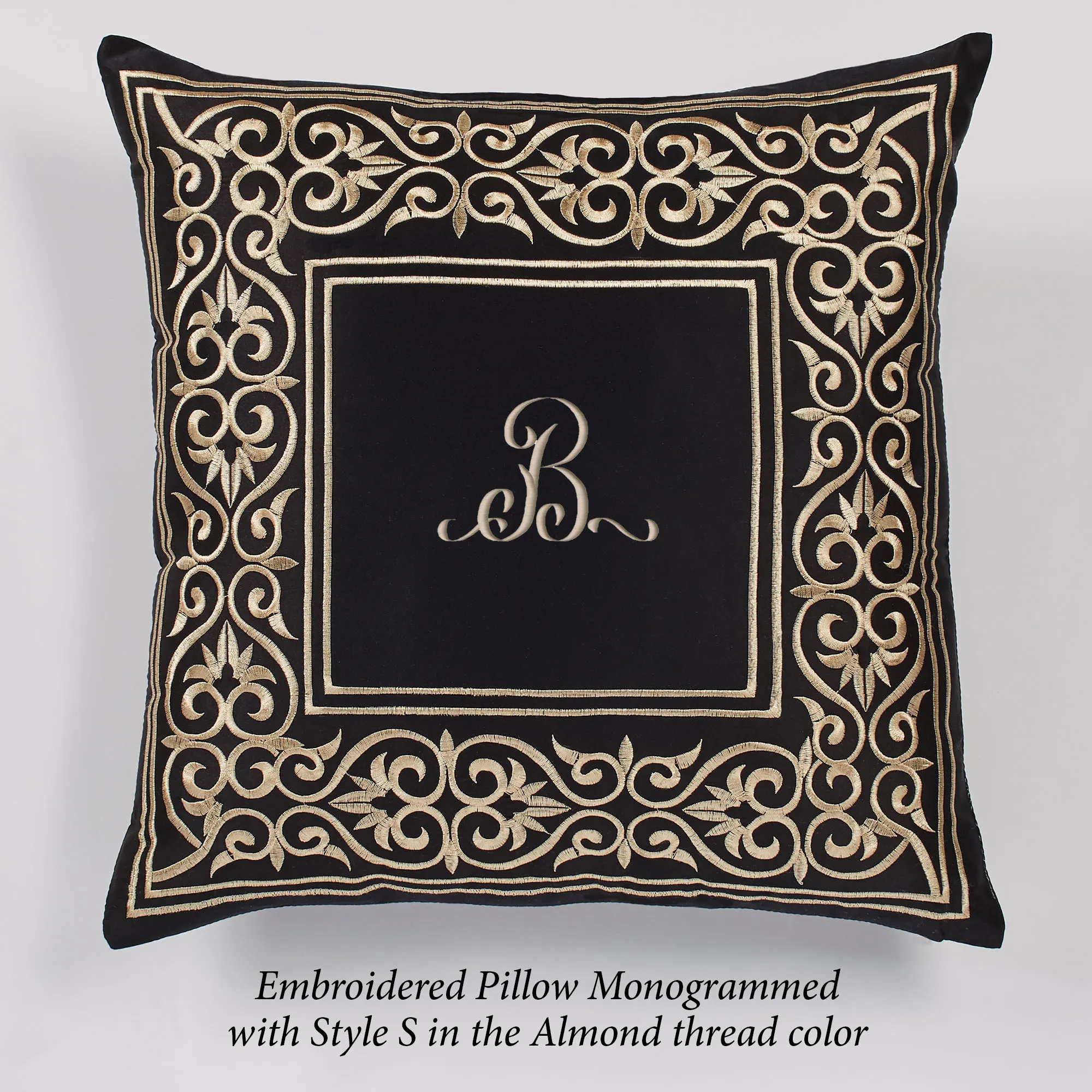 The Square Pillow may be monogrammed for an extra $7. Monogramming is shown in the Almond thread color.