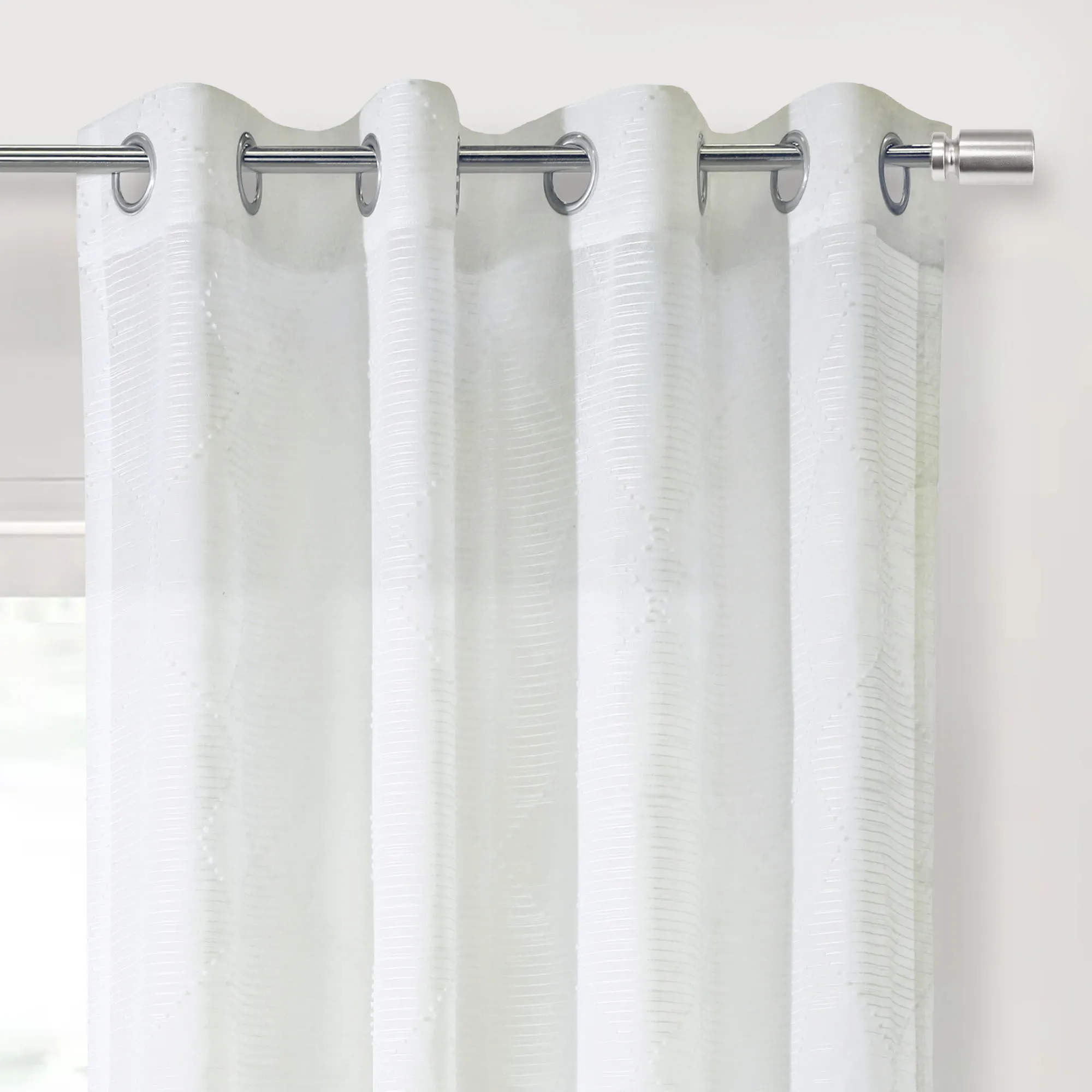 Embroidered diamonds add a subtle embellishment to the Kenswick Grommet Curtain Panel. Each polyester panel features a chic white semi-sheer design with tone-on-tone diamonds. Sold individually, each 52"W panel hangs via 1.5" dia. brushed silver metal grommets. Machine washable. Imported.