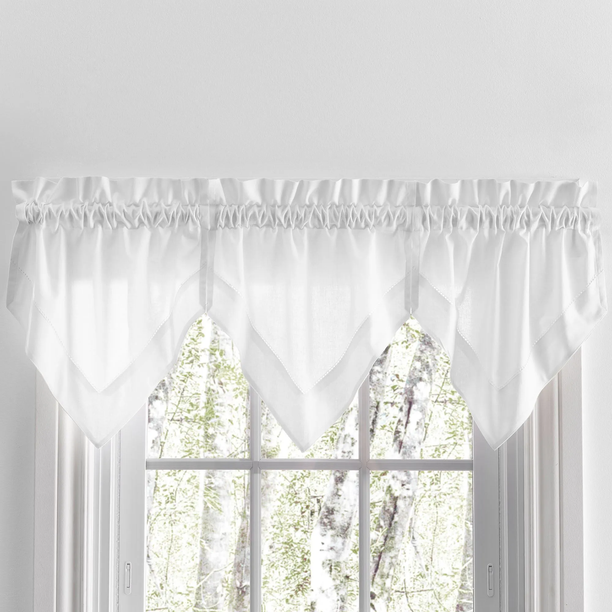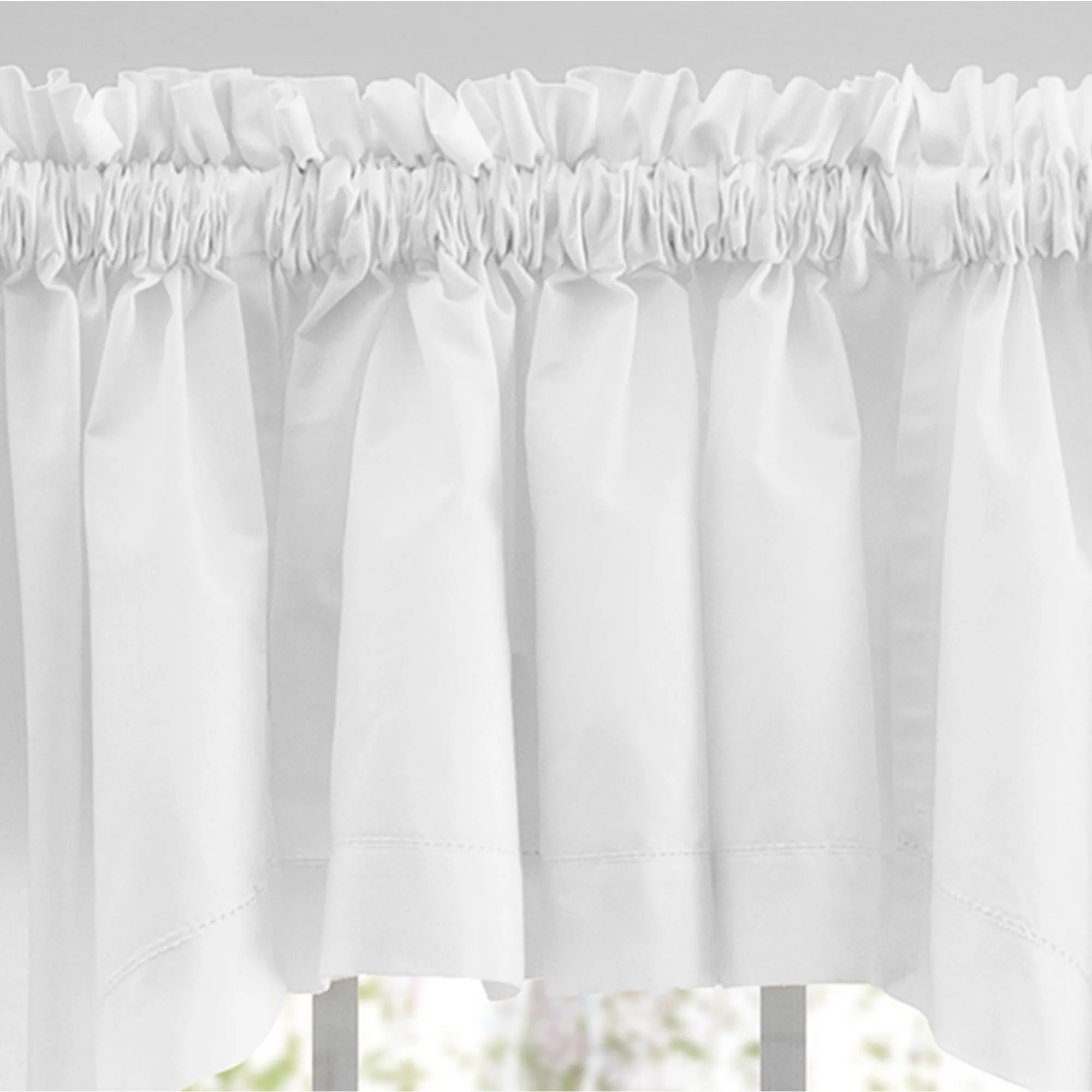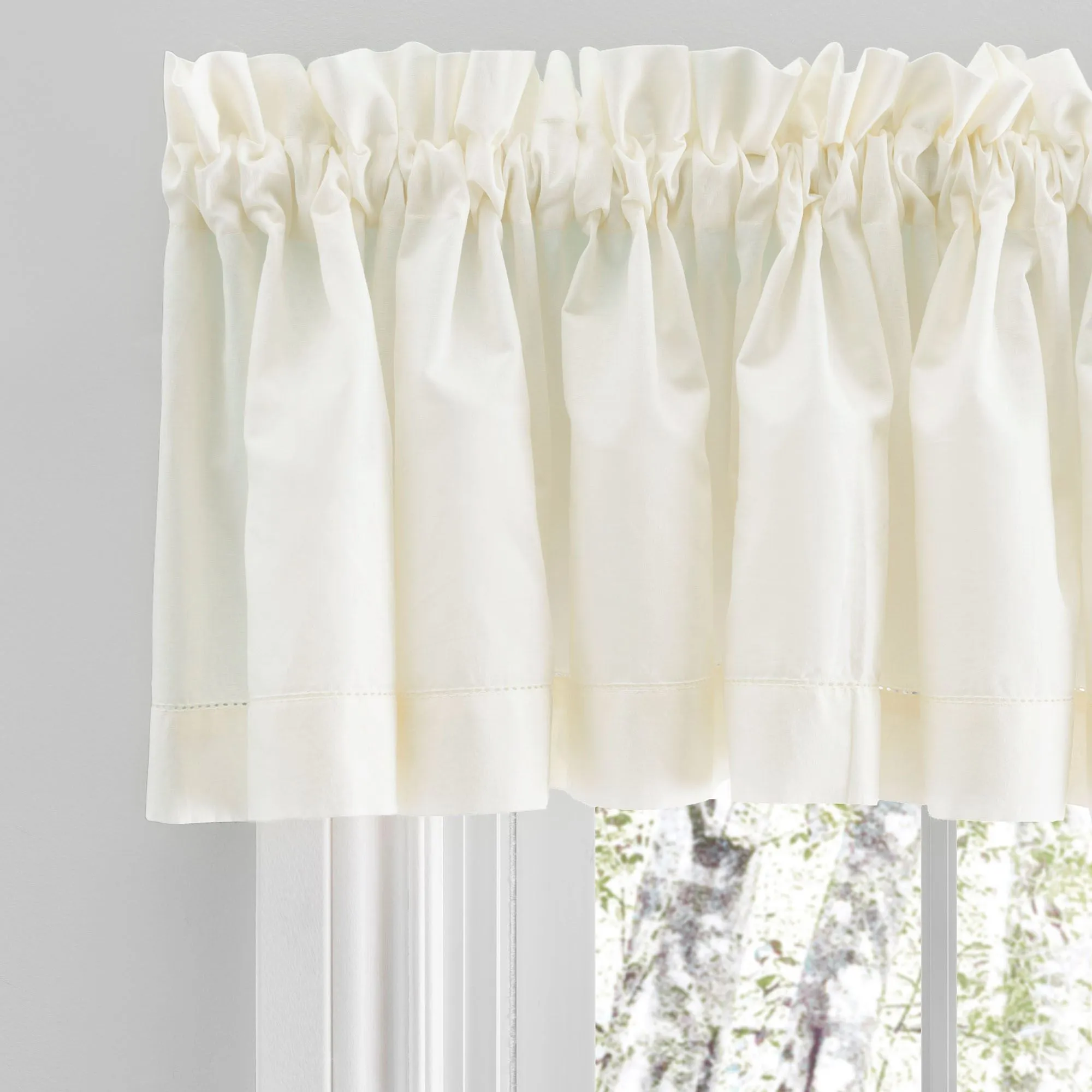 Frame your view with the soothing simplicity of the Kenton Window Treatment. Crafted from soft cotton, each solid color window accent features subtle hemstitch detailing. Rod pockets are 2". Specify Curtain Pair, Tailored Valance, Ascot Valance Set, Swag Valance Pair, or Insert Valance. Curtain Pair is 80"W and includes tiebacks. Tailored Valance is 80"Wx13"L. Ascot Valance Set includes three valances; each valance is 16"Wx15"L. Swag Valance Pair is 80"Wx36"L. Insert Valance is 40"Wx13"L. Machine washable. Imported. The curtain pair width is the total width of two panels together.