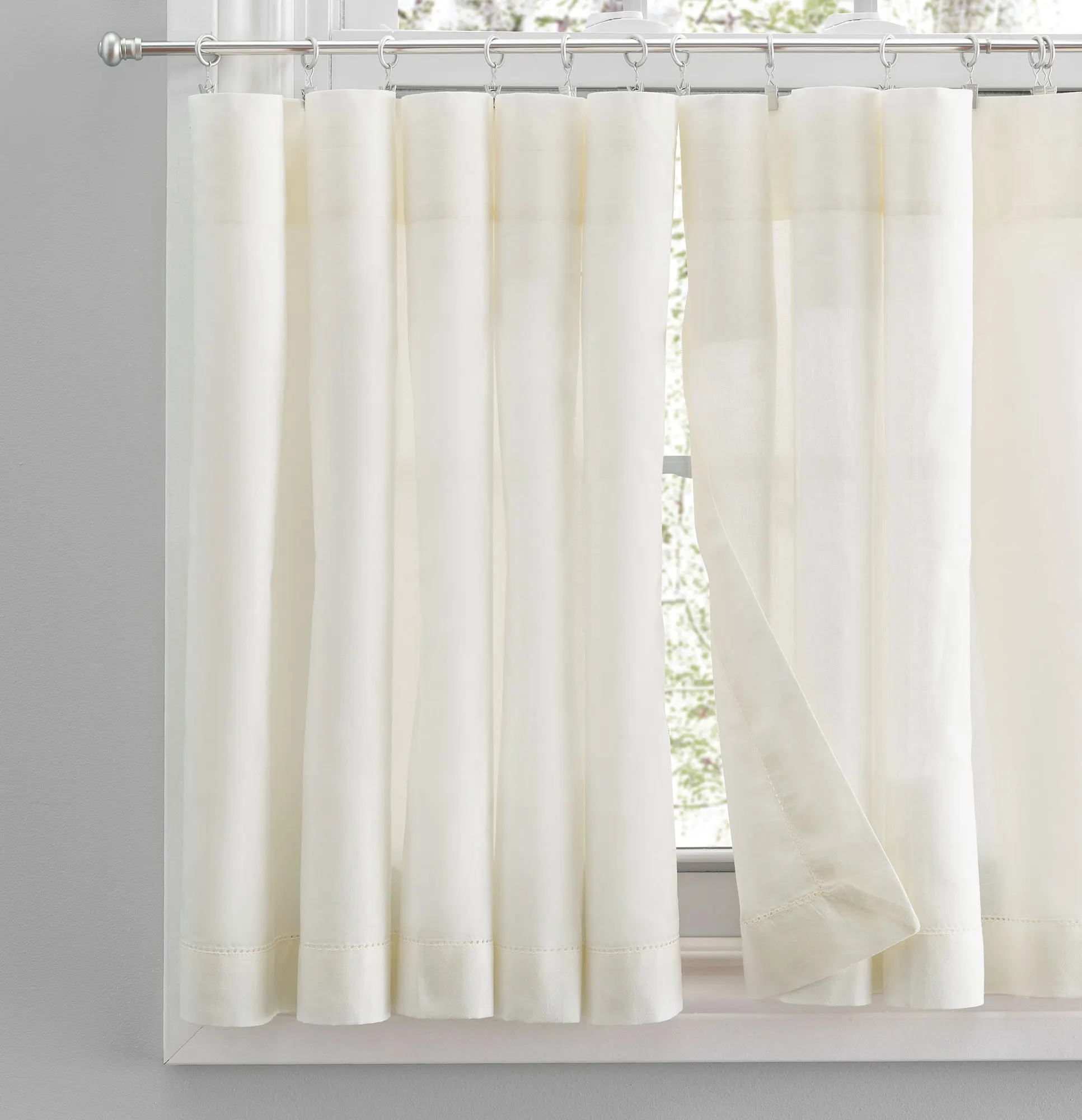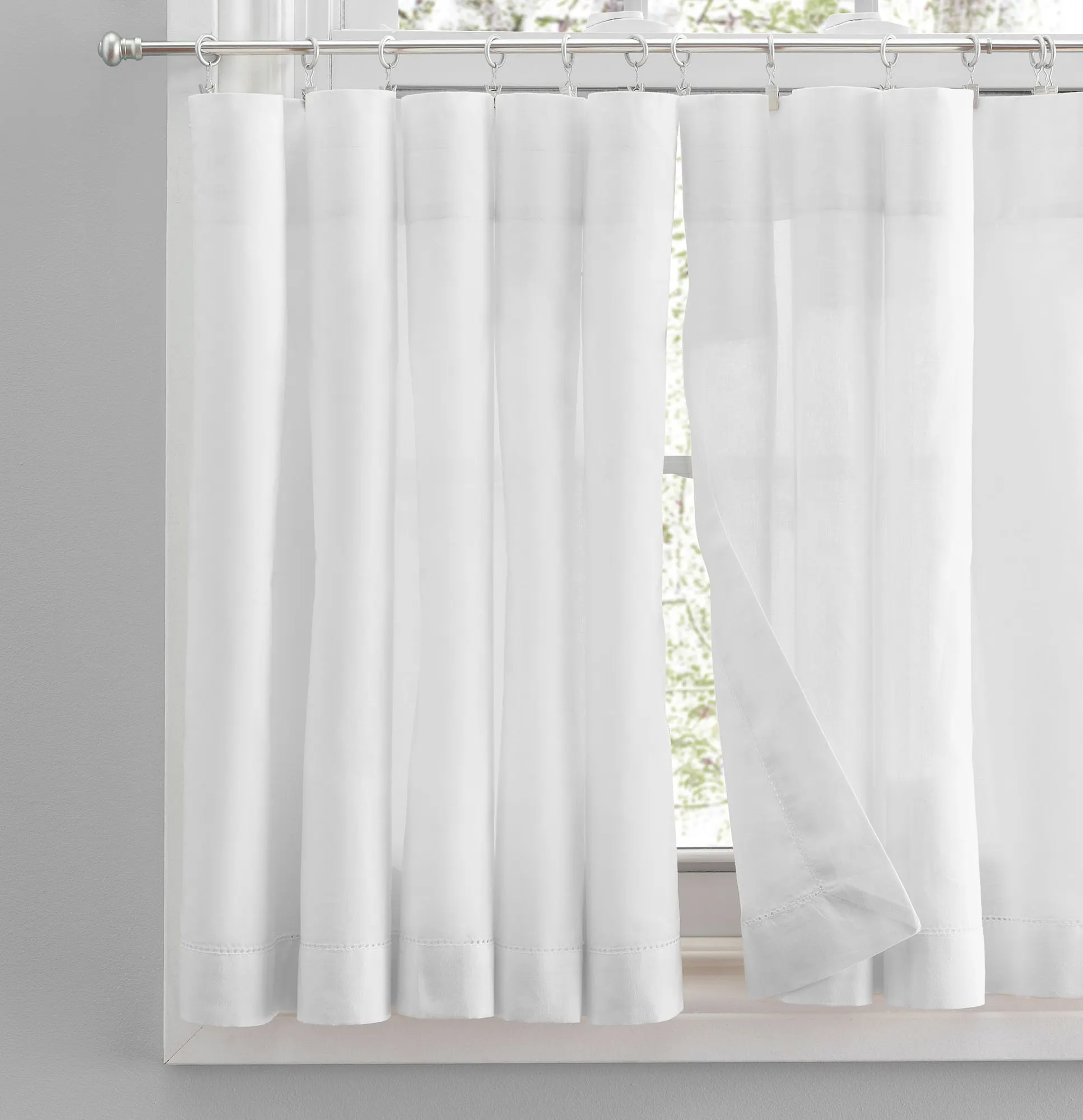 Frame your view with the soothing simplicity of the Kenton Window Treatment. Crafted from soft cotton, each solid color window accent features subtle hemstitch detailing. Rod pockets are 2". Specify Tier Pair, Swag Valance Pair, Insert Valance, Tailored Valance, or Ascot Valance Set. Tier Pair is 80"W. Swag Valance Pair is 80"Wx36"L. Insert Valance is 40"Wx13"L. Tailored Valance is 80"Wx13"L. Ascot Valance Set includes three valances; each valance is 16"Wx15"L. Machine washable. Imported.