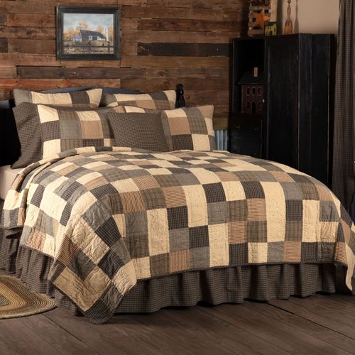 Quilt features patchwork blocks, bound edges, and a back of coordinating amber and black plaid. Quilt fill is cotton. Choose Twin, Queen, King, or Cal King.