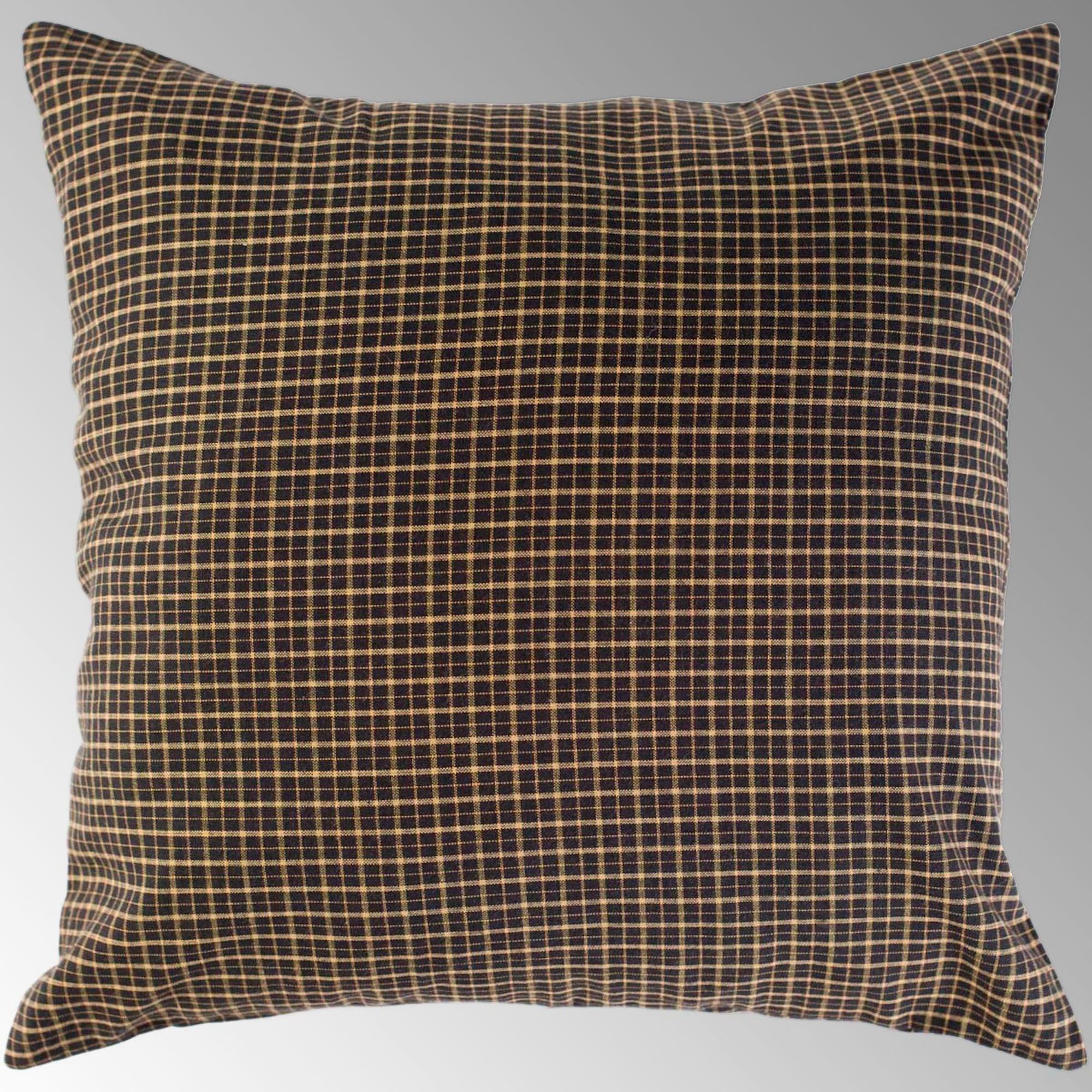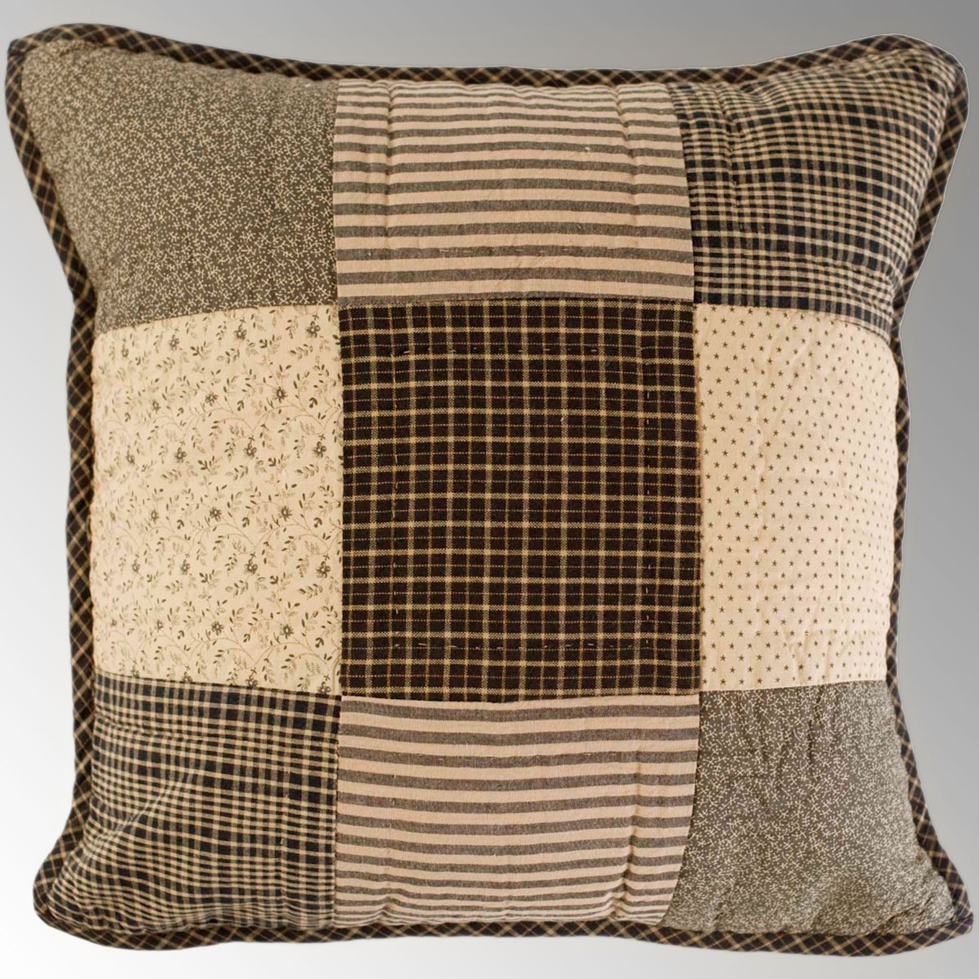 Pillows have back button closures and polyester inserts. Machine washable; spot clean inserts. Embroidered 18" Square reads "Believe and Receive" with star accents, two applique crows, and layered flange edges. Tailored 16" Square is plaid. Quilted 16" Square features blocks and bound edges. Embroidered 16" Square has tailored edges, a mitred plaid frame, a floral center, and an embroidered plaid crow applique.