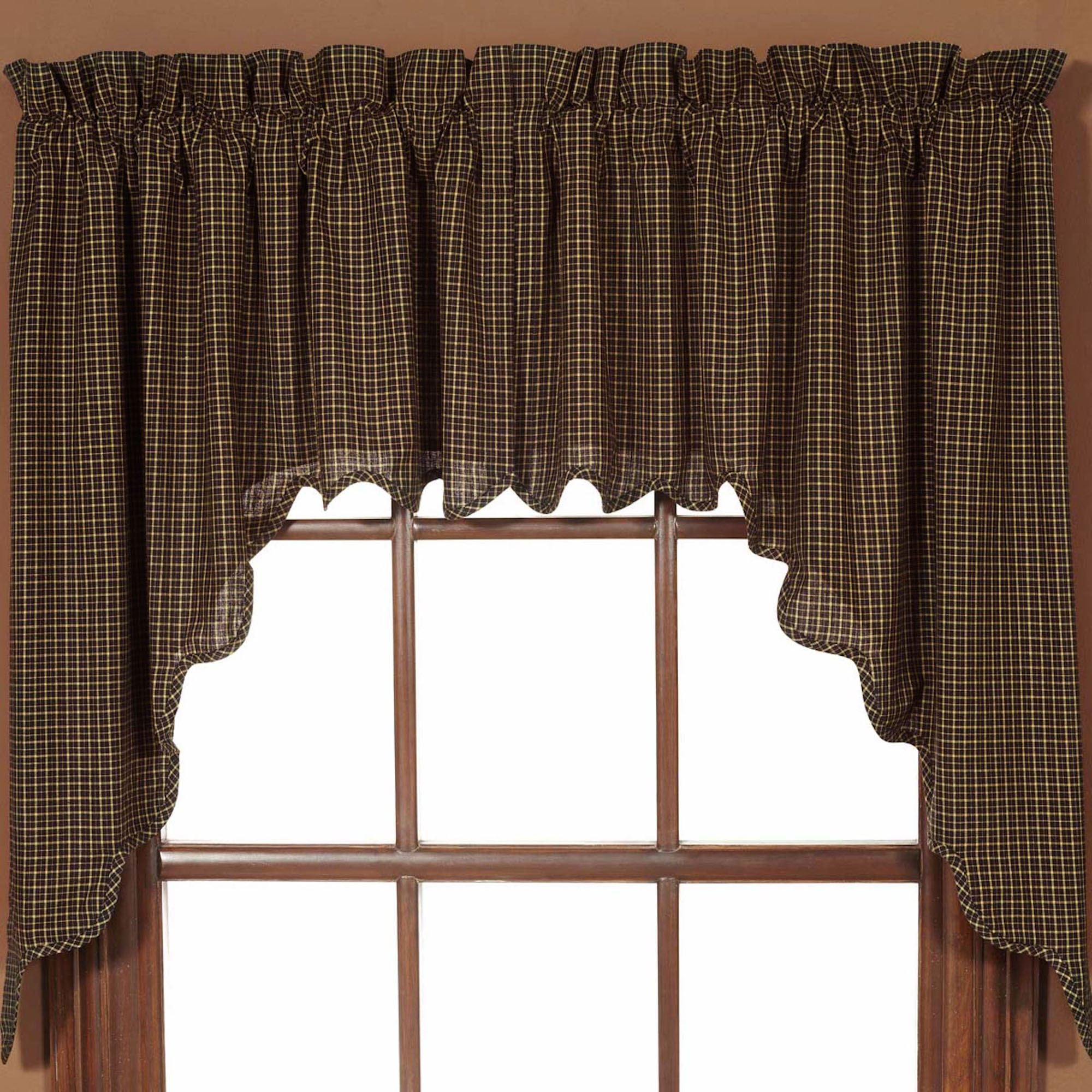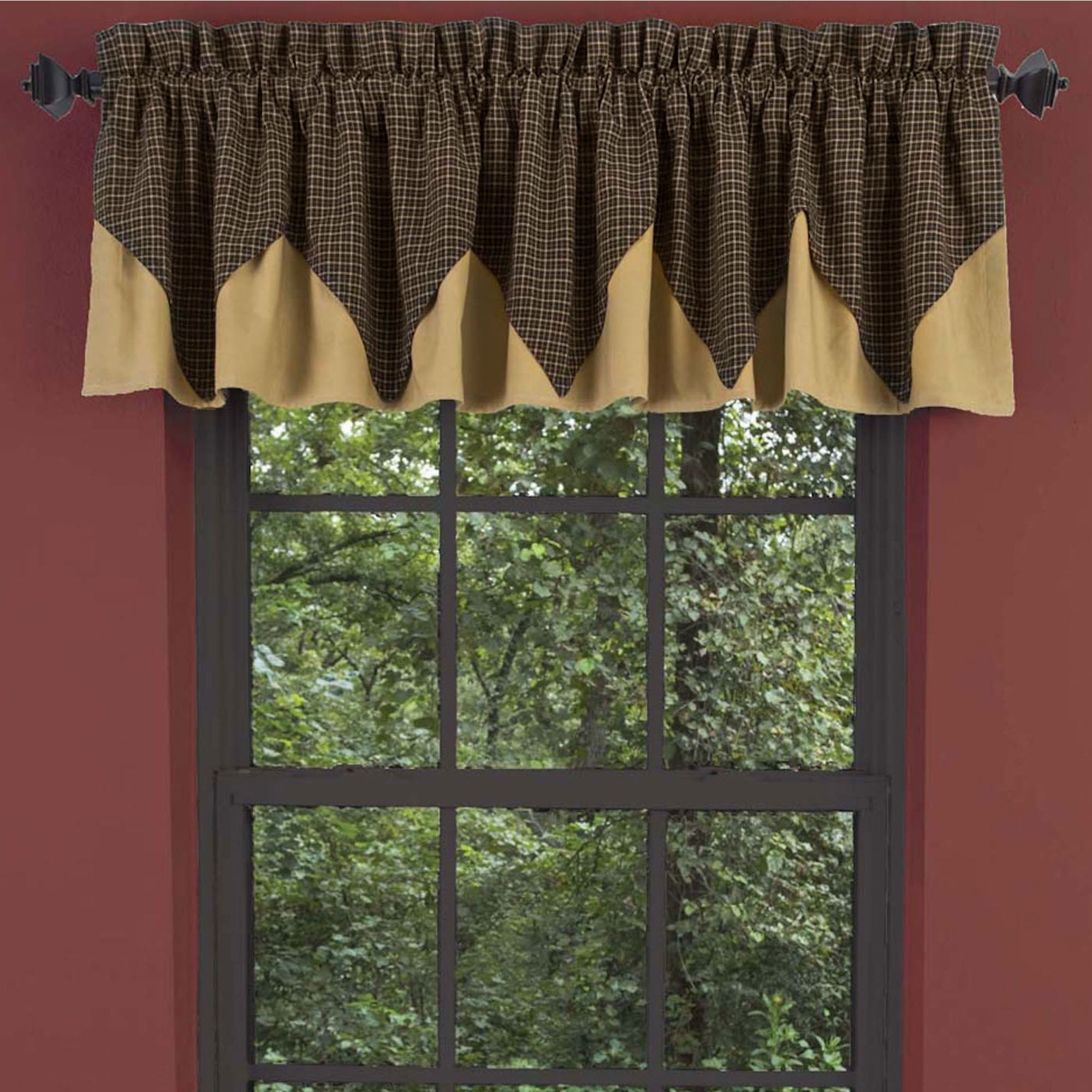 Lined Window Treatments are plaid with tailored edges and 3.5" rod pockets. Curtain Pair has scalloped bottom edges and includes tiebacks. Prairie Curtain Pair features a scalloped inside edge and adjustable drawstring ties; available in two lengths. Layered Valance has a gold bottom layer. Star Valance has a floral edge decorated with applique stars; available in two widths. Prairie Swag Valance features a scalloped inside edge.