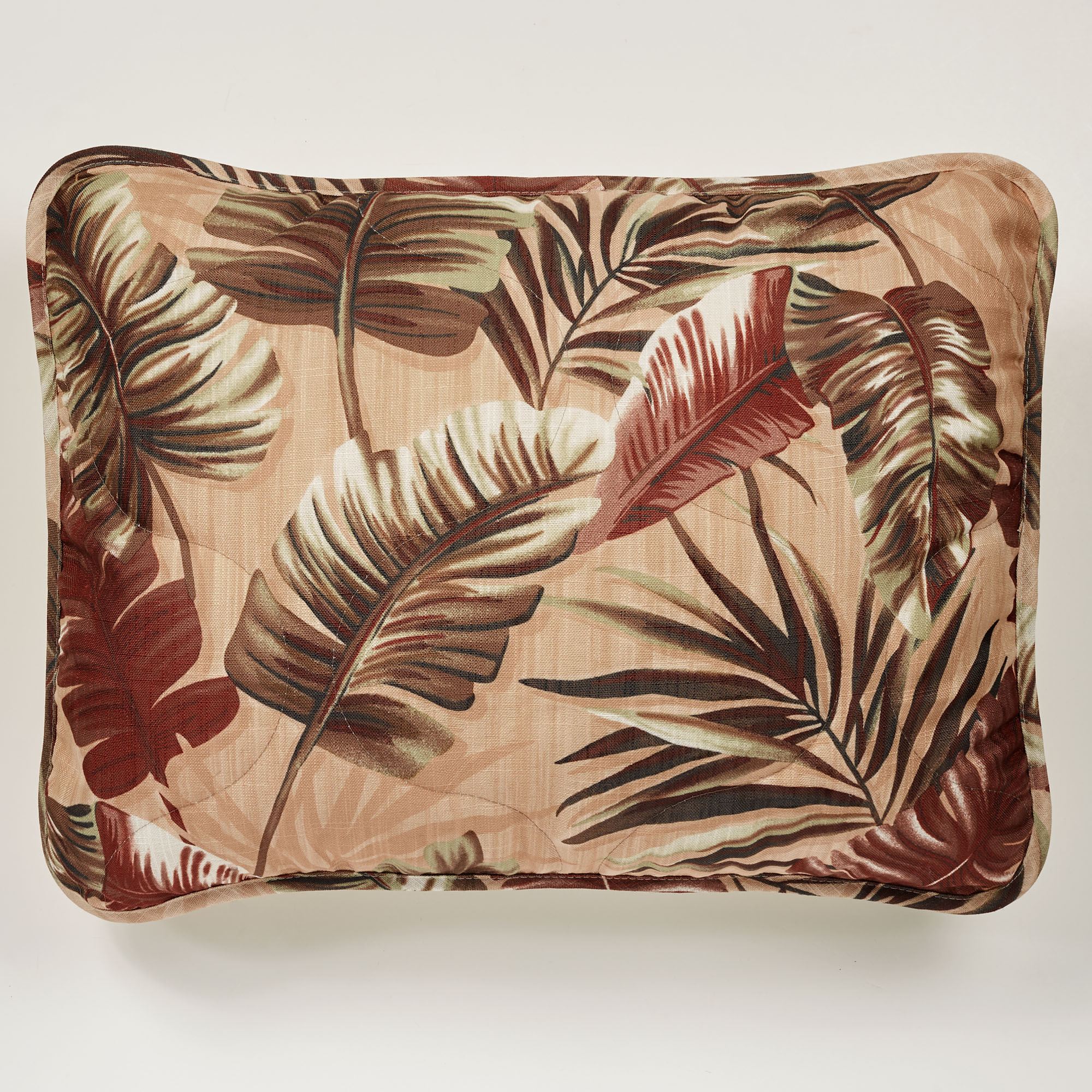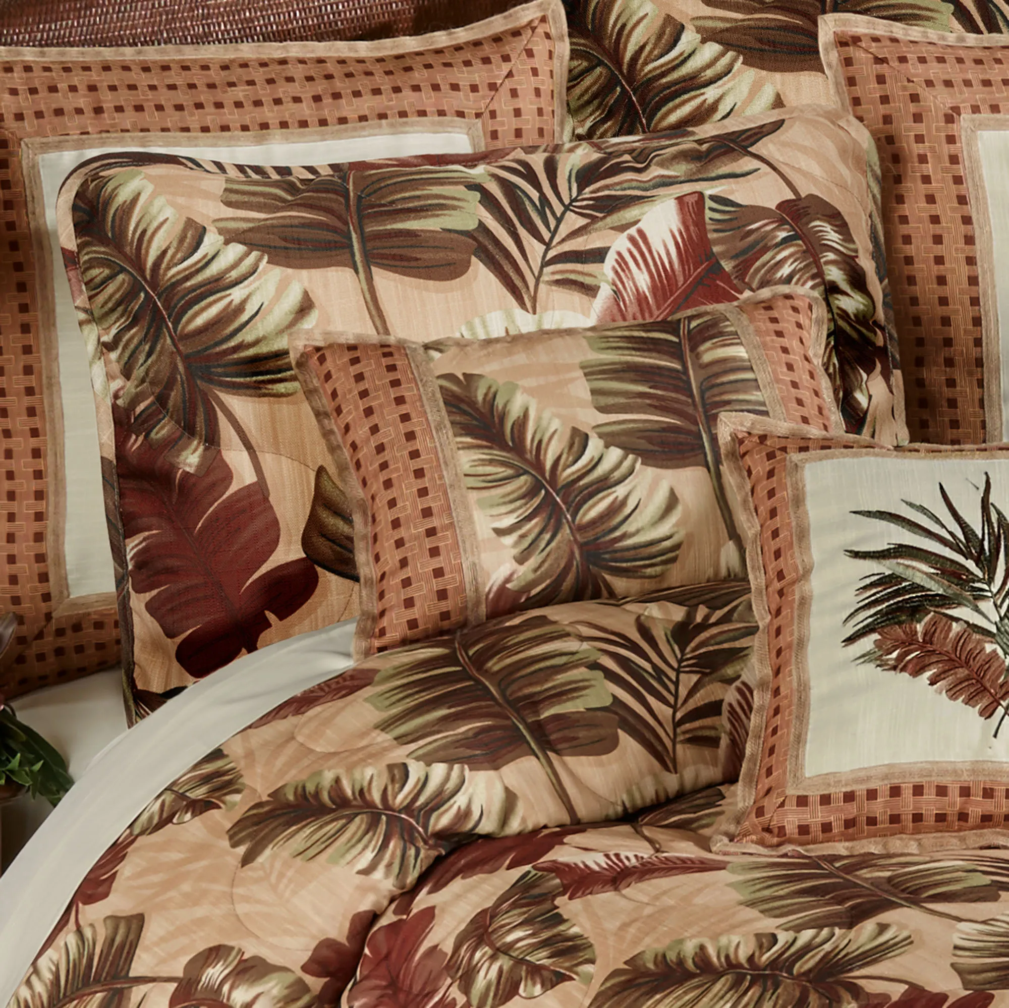 Change your scenery to the island views of Key West with this tropical ensemble. The slubbed polyester bedding features tarragon, mahogany, off-white, russet, sienna brown, black, deep sage, cinnabar, honey, and ivory hues throughout classic fanning palm leaves and basket weave motifs for the relaxed style of seaside getaways. Some items are accented with charming jute trim.