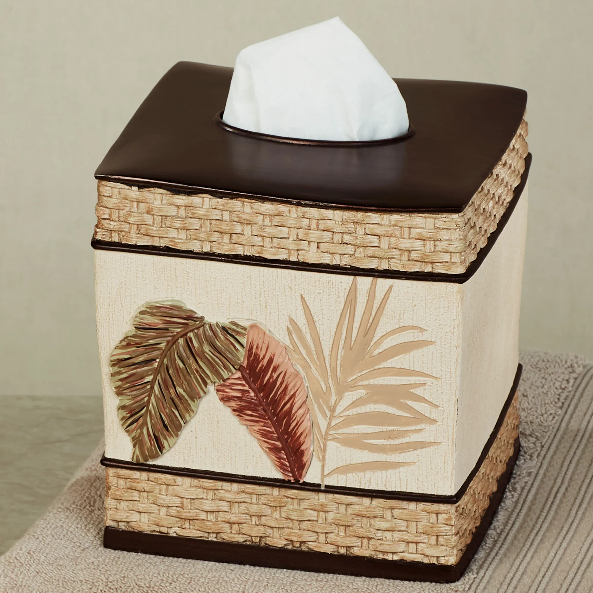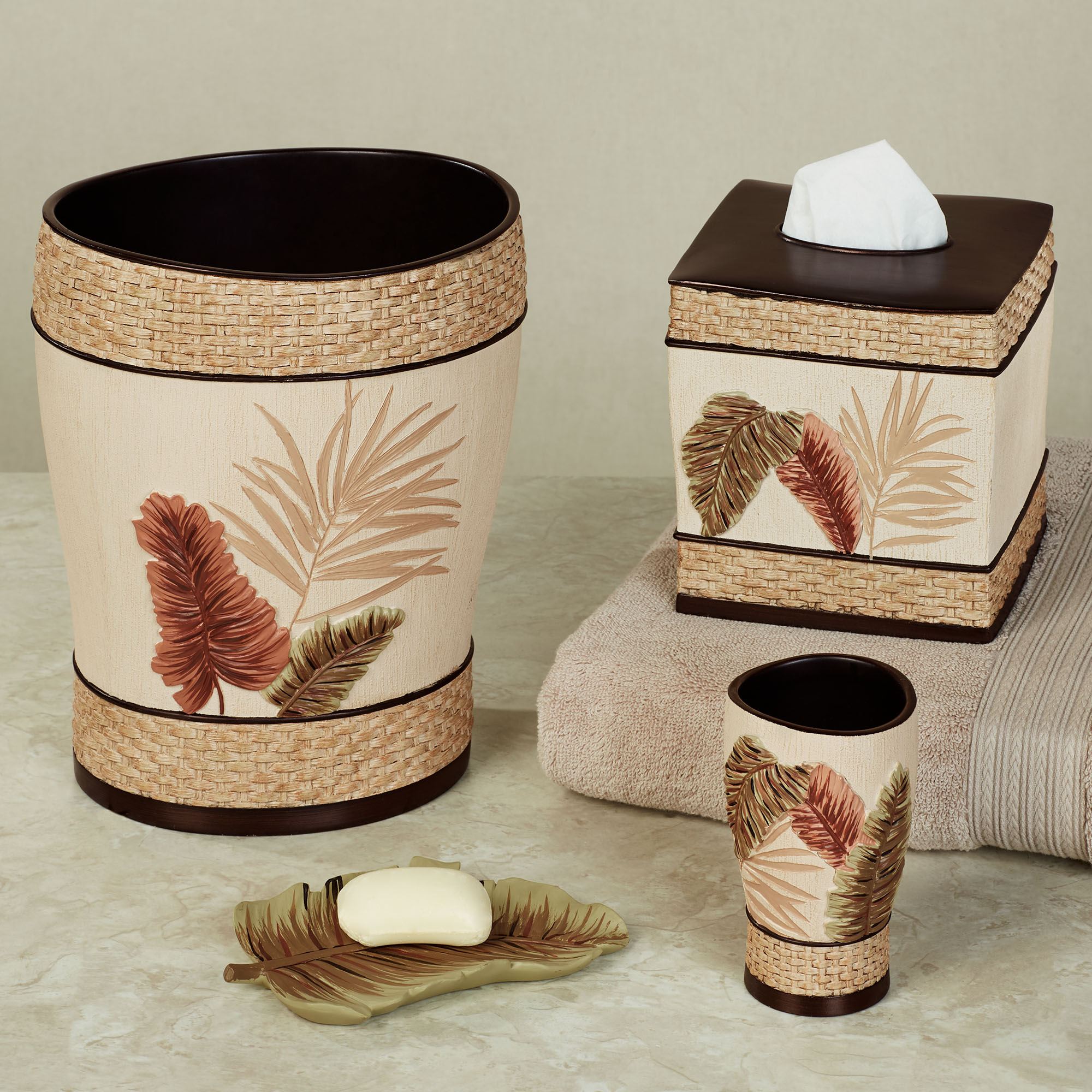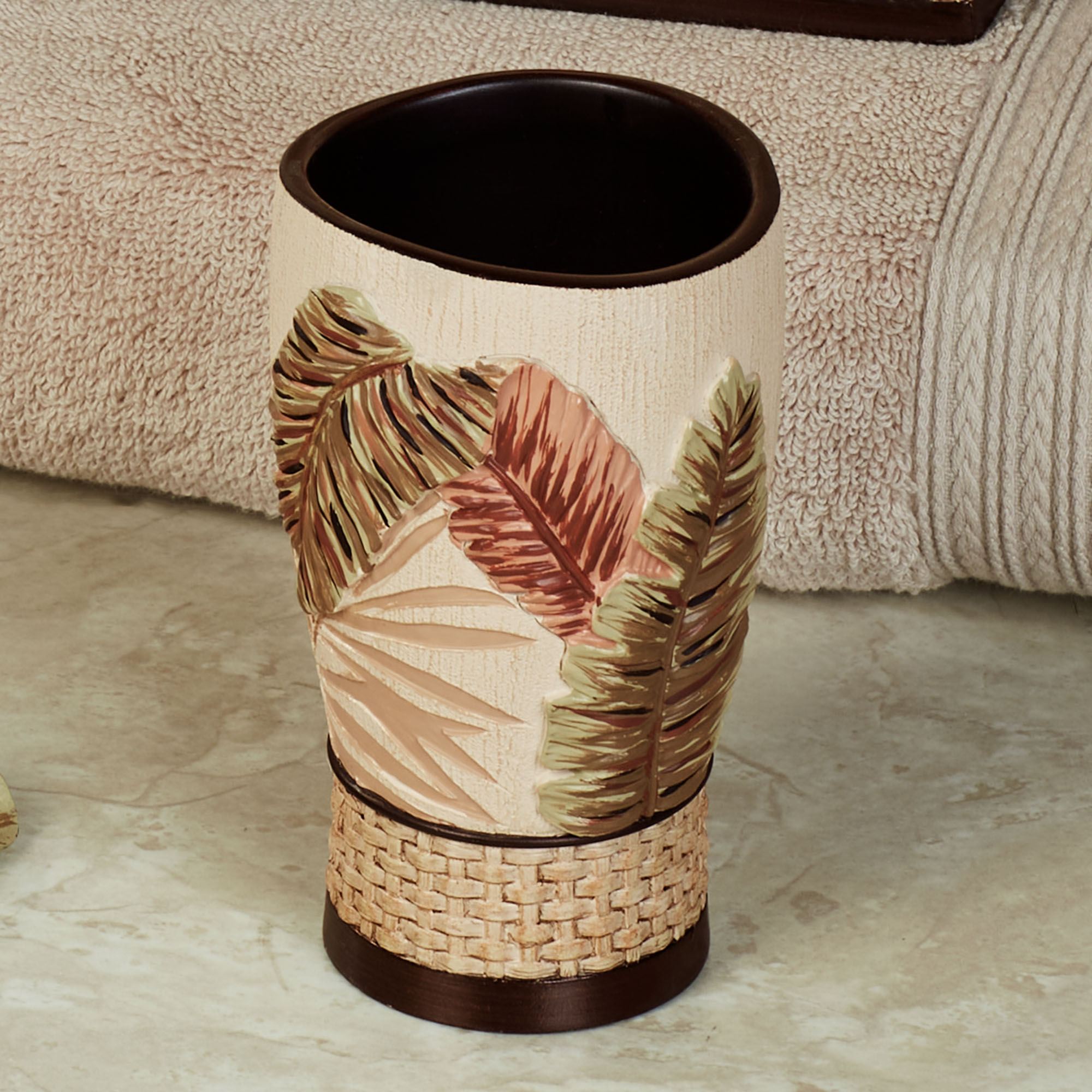 Change your scenery to the island views of Key West with these handpainted resin tropical bath accessories. Each shaped accent, except the Soap Dish, features a textured wheat ground decorated with dimensional leaves in russet, fern, light brown, and camel hues. Solid bronze bands and basket weave trim add finishing touches. The Soap Dish is shaped like a beautiful palm leaf. The Brush Holder can be used to hold your toothbrushes or makeup brushes. Specify Tissue Cover, Wastebasket, Soap Dish, or Tumbler.