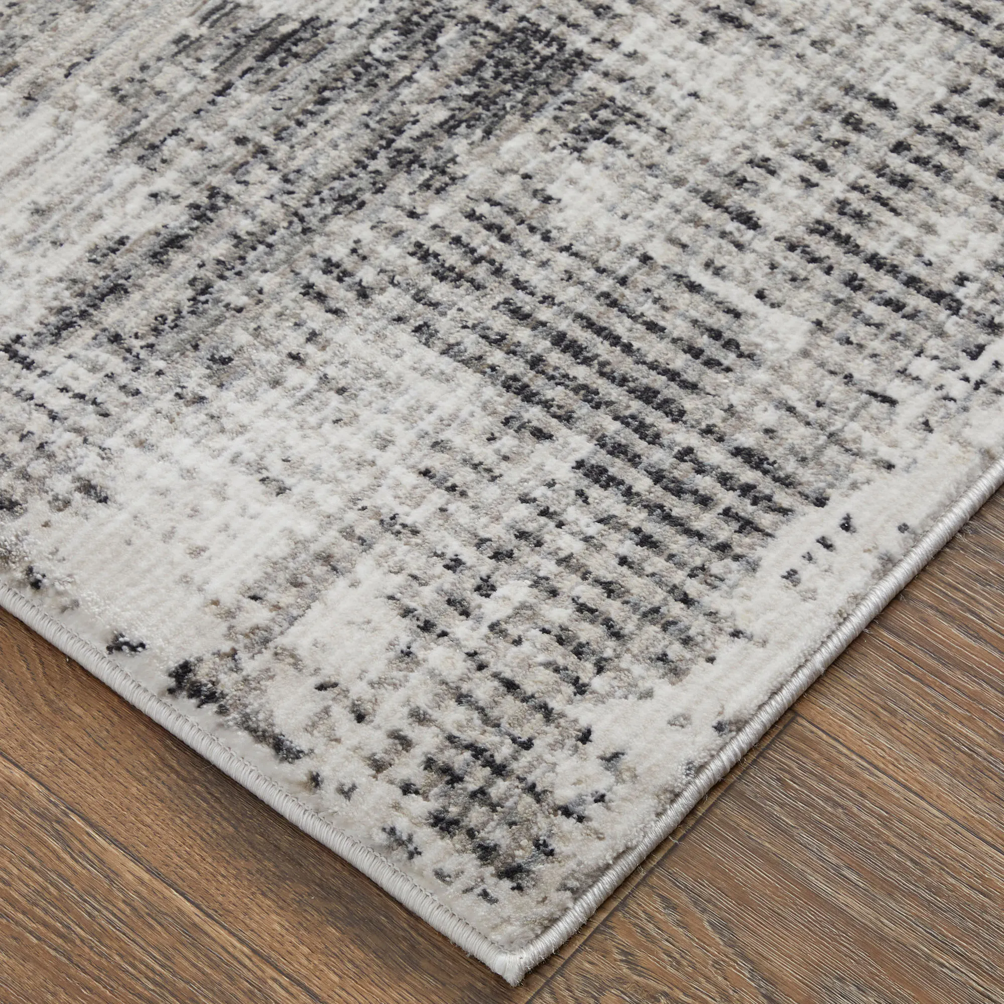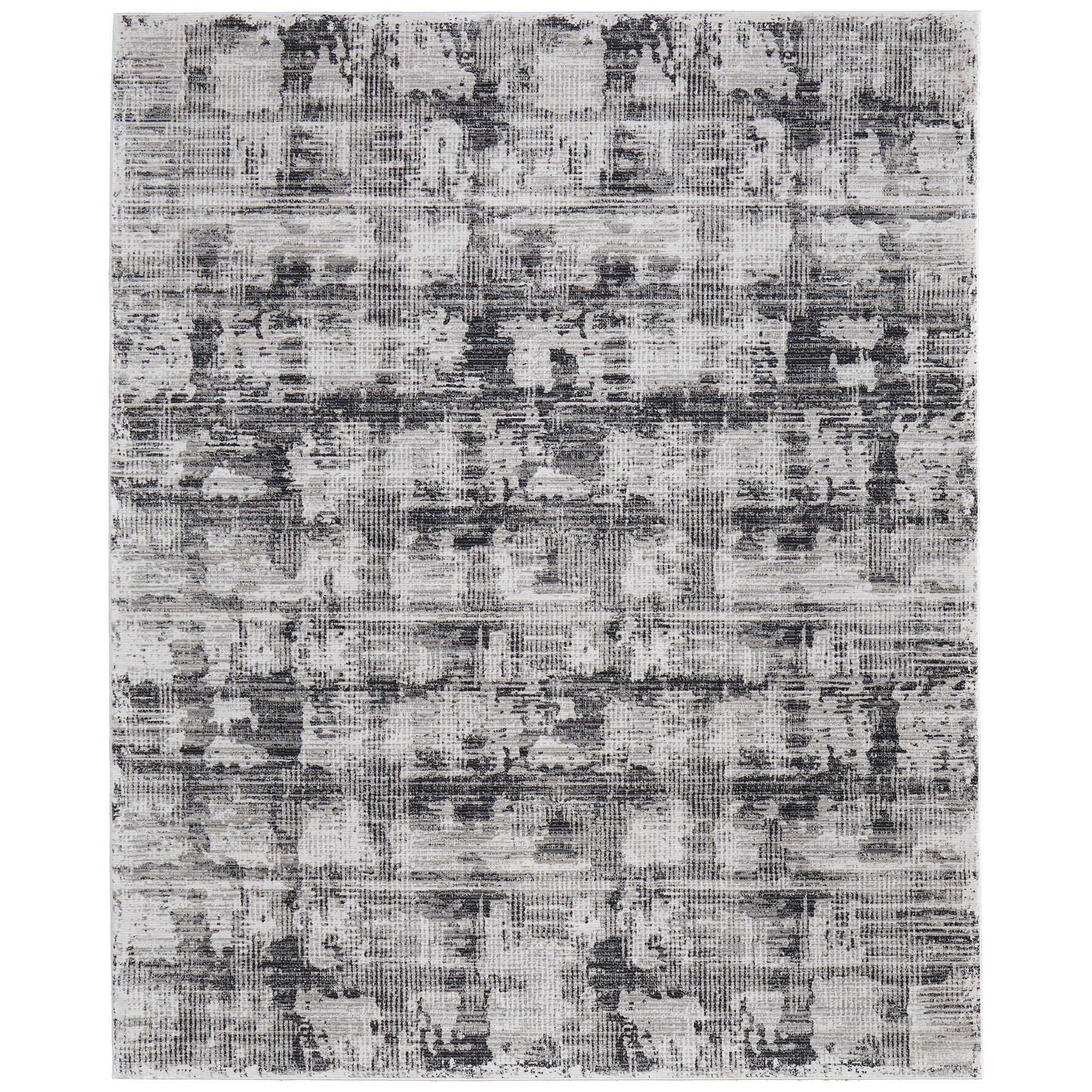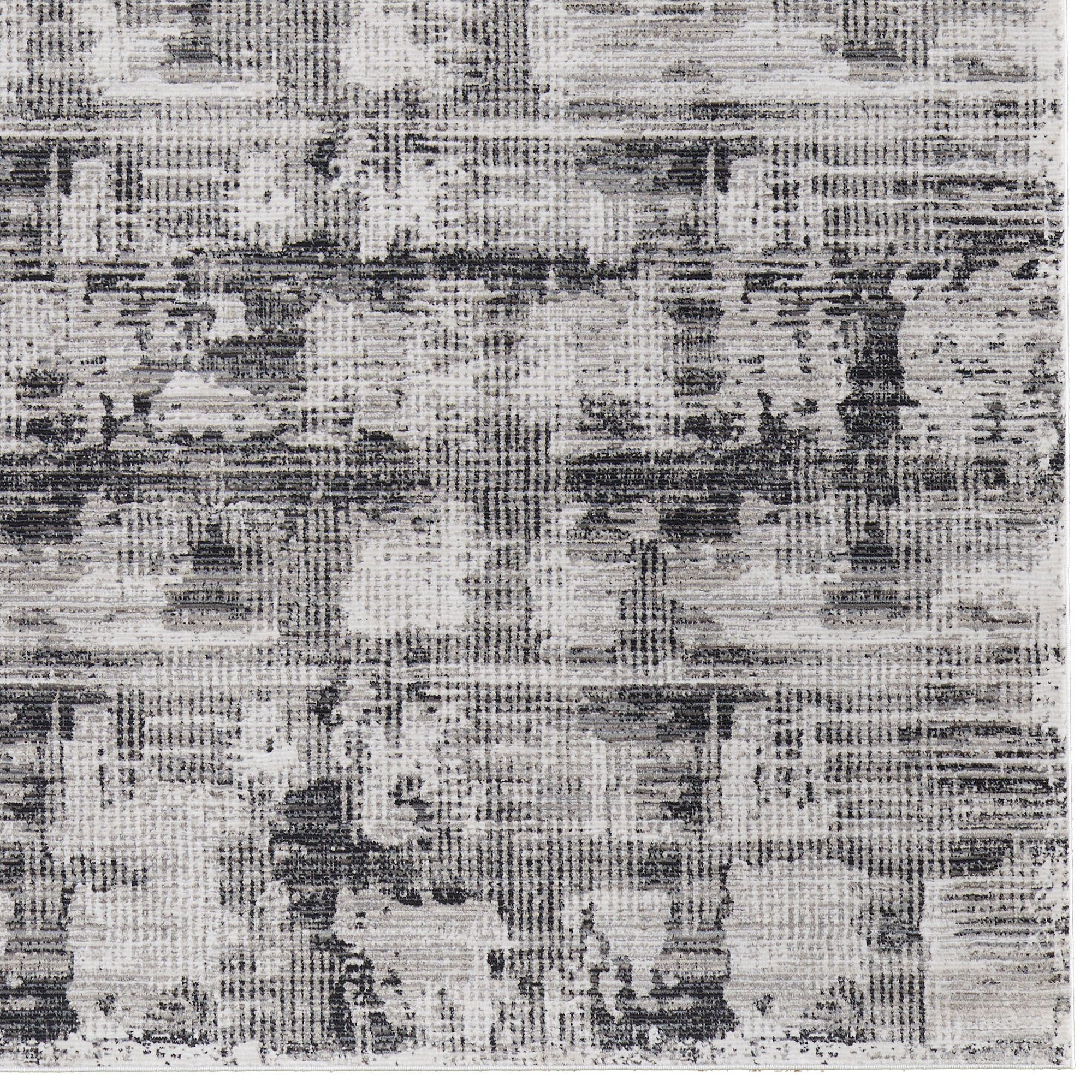 The Kiefer Rug decorates with abstract designs. Power-loomed polypropylene/polyester area rug for the living room, .47" thick, features a crosshatch pattern on a light gray background. Colors include shades of ivory, gray, black, and beige. Backing is cotton. We recommend professional cleaning by a rug cleaner. Imported.