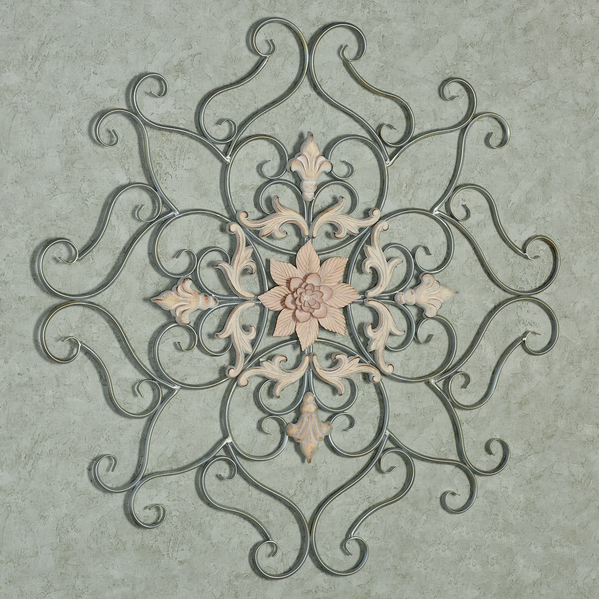 The Kieran Wall Grille displays a classic elegance. With an openwork design, the handcrafted wall grille features powder-coated gray metal scrollwork, whitewashed natural wood fleurs and acanthus leaves, a center layered pink flower, and lovely handpainted accenting. Overall, the wall grille measures 30"dia.x1"D.