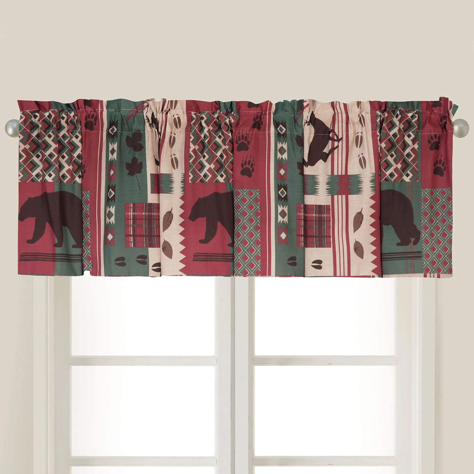 The cotton Killian Ridge Tailored Valance features printed rustic designs of bears, deer, leaves, animal tracks, plaids, and various geometrics. Colors include chestnut, ecru, cocoa, dark red, and blue-green. Valance has a 2" rod pocket and measures 72"Wx15.5"L. Machine washable. Imported.
