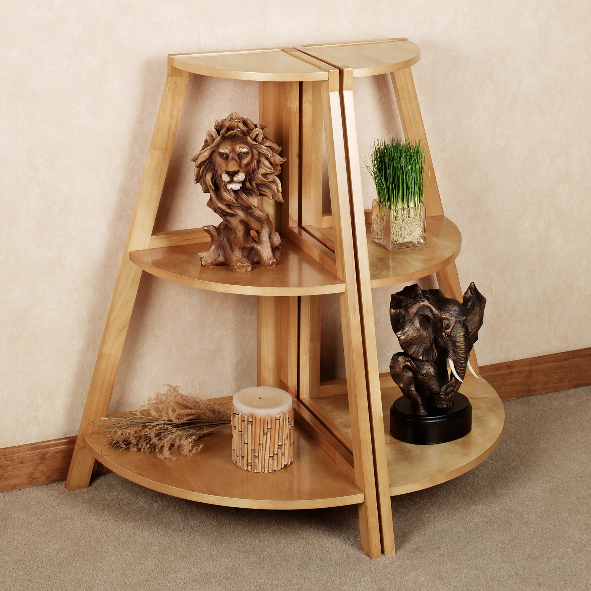 Bring additional storage and display space to your room with the Kimber Corner and Ladder Shelves. The convenient, wooden three-tier shelves will mesh easily with many decor styles due to their clean design and natural oak finish. Ladder and corner shelves can be combined to create an entire entertainment center or one expansive display area for all your favorite accents. Short Corner Shelves are sold as a pair; each is 22"Wx18"Dx32"H. Short Ladder Shelf, 25"Wx18"Dx32"H, is sold individually.