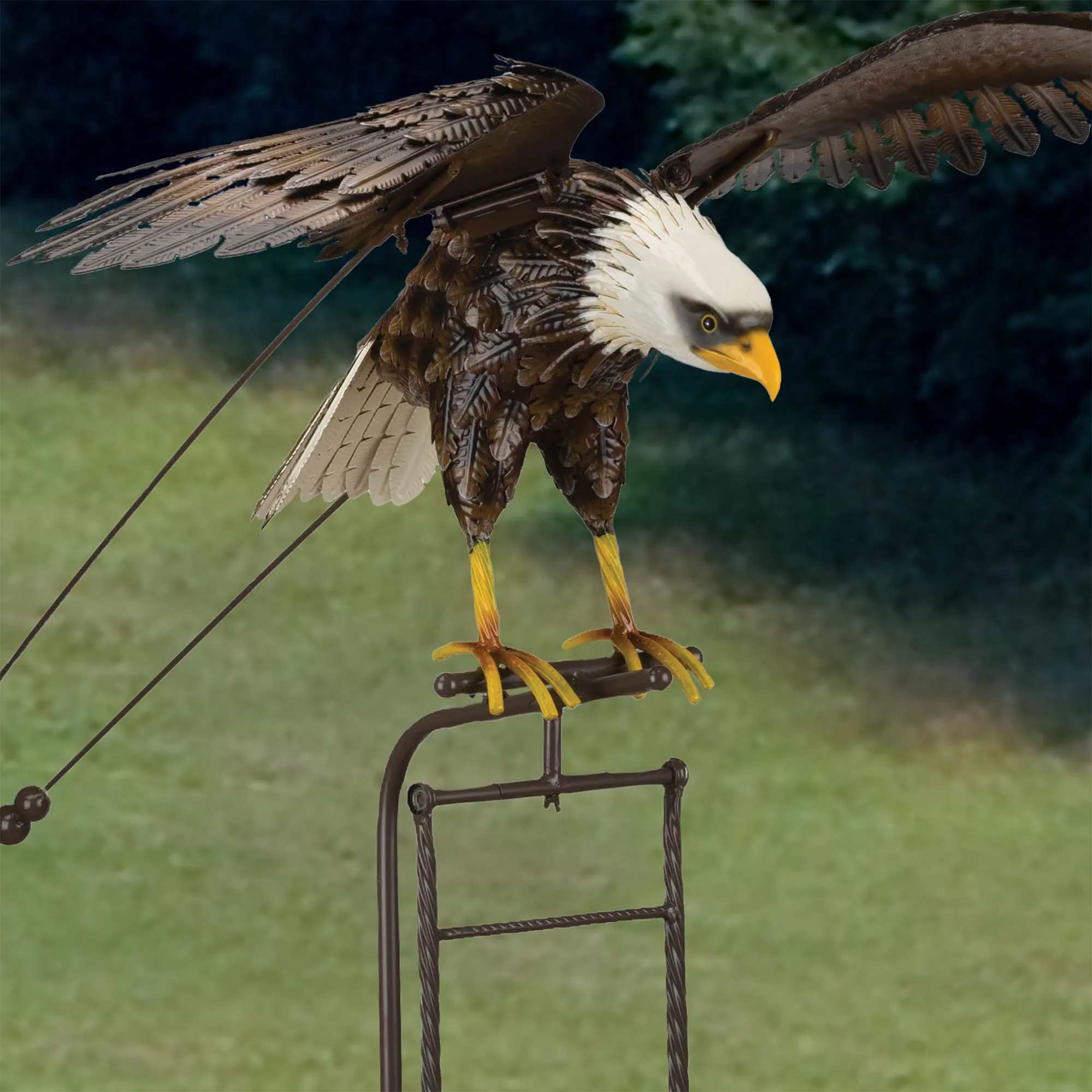 The majestic Kinetic Rocking Eagle Outdoor Sculpture soars to new heights in your garden area. Made of metal with a powder-coat finish, this grand eagle features pressed feathers in brown and ivory along with yellow feet and beak. On a secure prong base, the unique design features a weighted ball to balance the detailed bird that rocks back and forth while also flapping its wings in the blowing wind. The included four-prong double-"U" stake helps secure this marvelous eagle sculpture. For outdoor year-round use. Measures 35.5"Wx46"Dx55"H; weighs approx. 20 lbs.