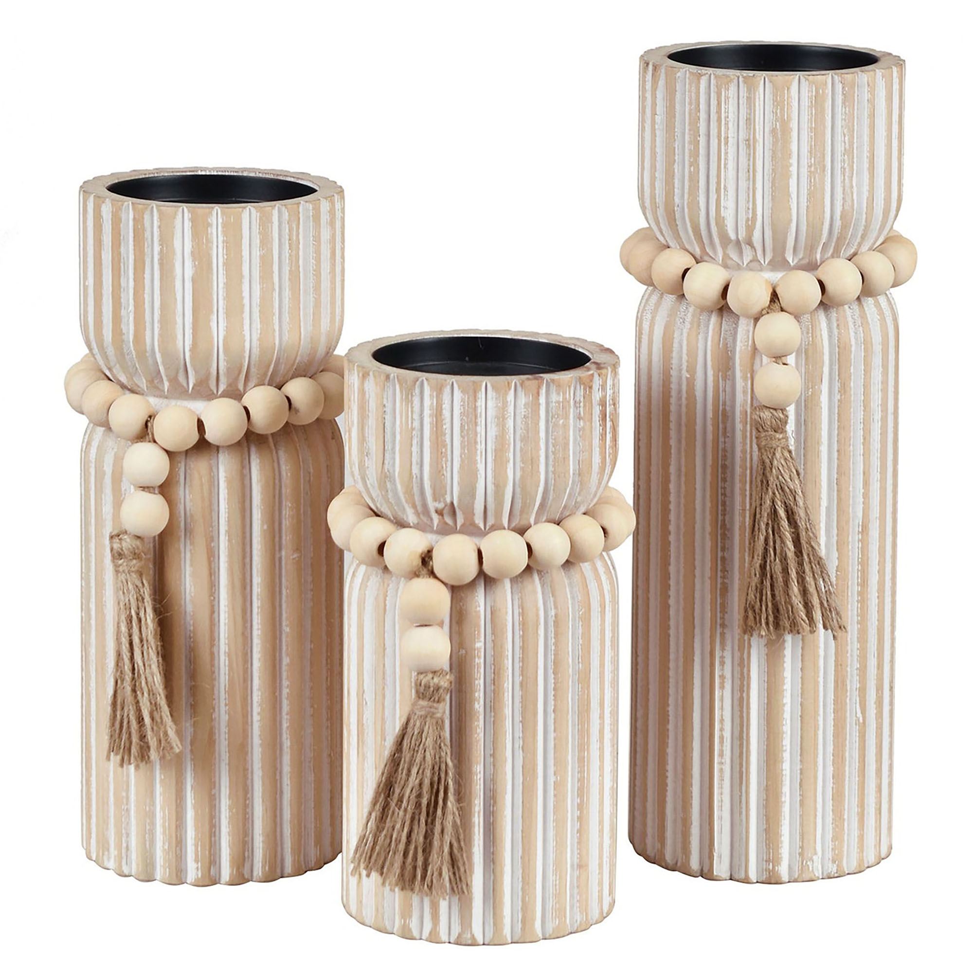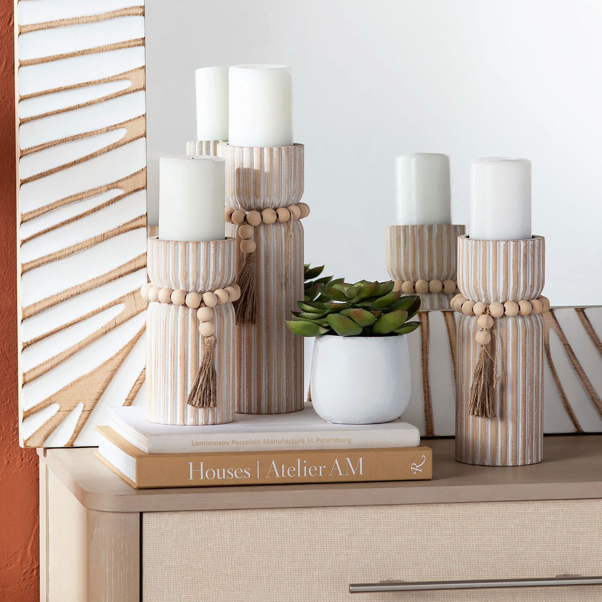 Craft a charming ambiance in your space with the Kingsley Candleholder Set. Designed by David Lee, each candleholder features whitewashed and natural light brown wood hues. A beaded strand with a tassel accent gives the fluted, shaped designs a cinched look. Each holds your 3" dia. pillar candle. Set includes three 4" dia. candleholders; large is 12"H, medium is 10"H, and small is 8"H.