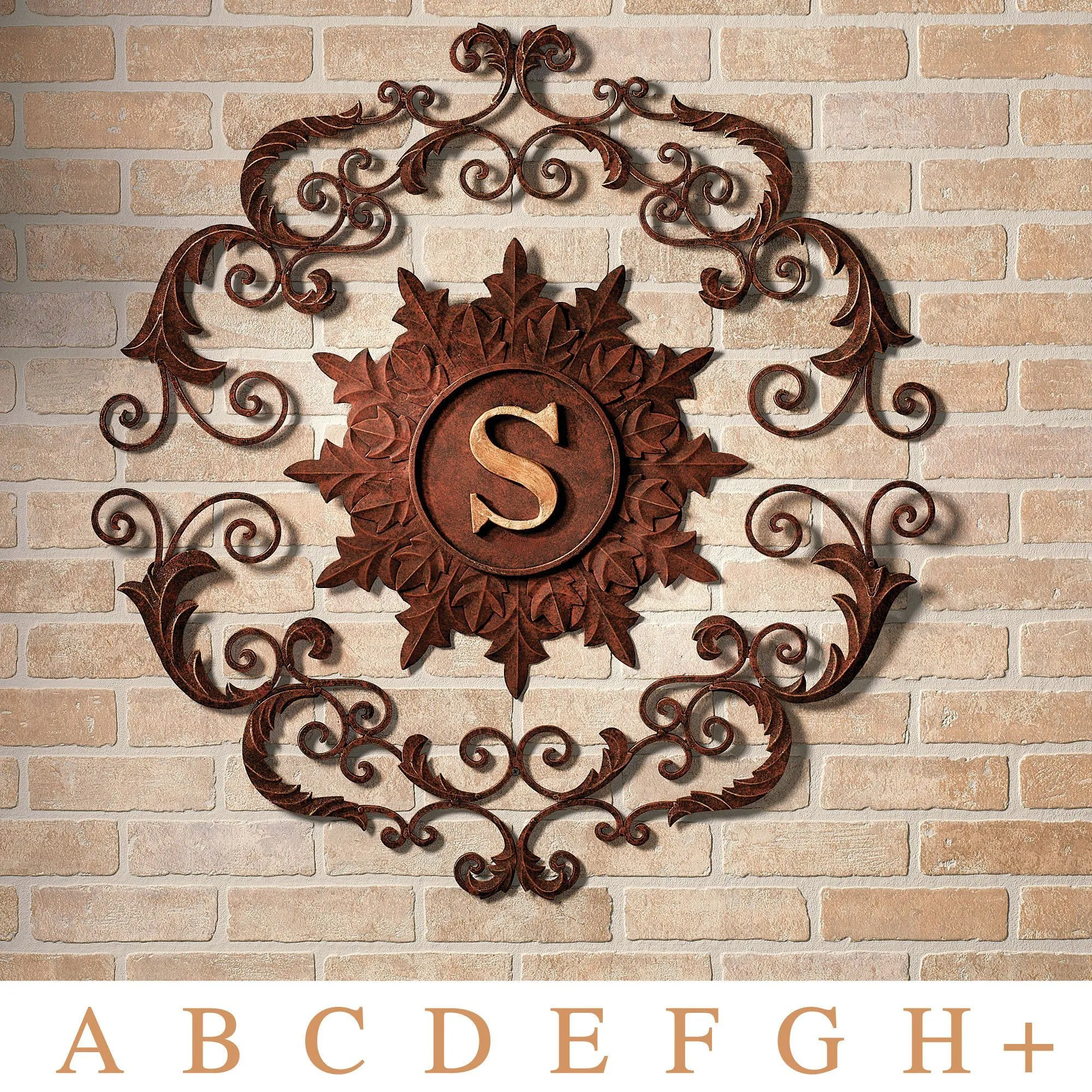Kingston Monogram Wall Grille has a scrolled top and bottom around a medallion with fleurs. Three-piece handcrafted metal grille has a handpainted, rustic brown finish. Letter is finished in sponged Italian gold. 34" dia., 18 lbs. Letter is 5"H.