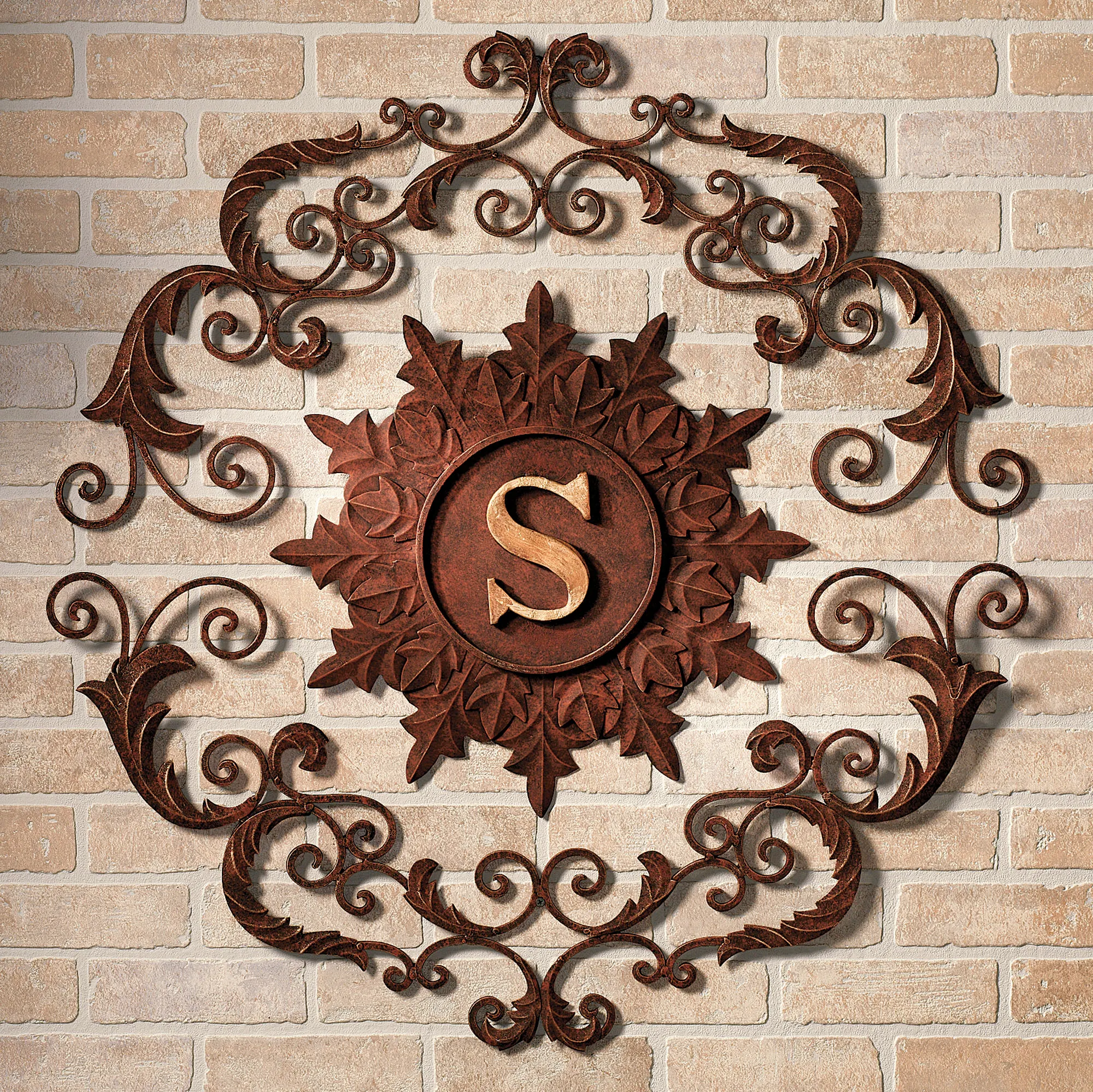 Kingston Monogram Grille by Dr. Livingstone, I Presume has a scrolled top and bottom around a center medallion with fleur accents. Three-piece handcrafted metal grille has a handpainted, rustic brown finish. Letter is finished in sponged Italian gold. Hand-finished wall grille will weather naturally if placed outside.