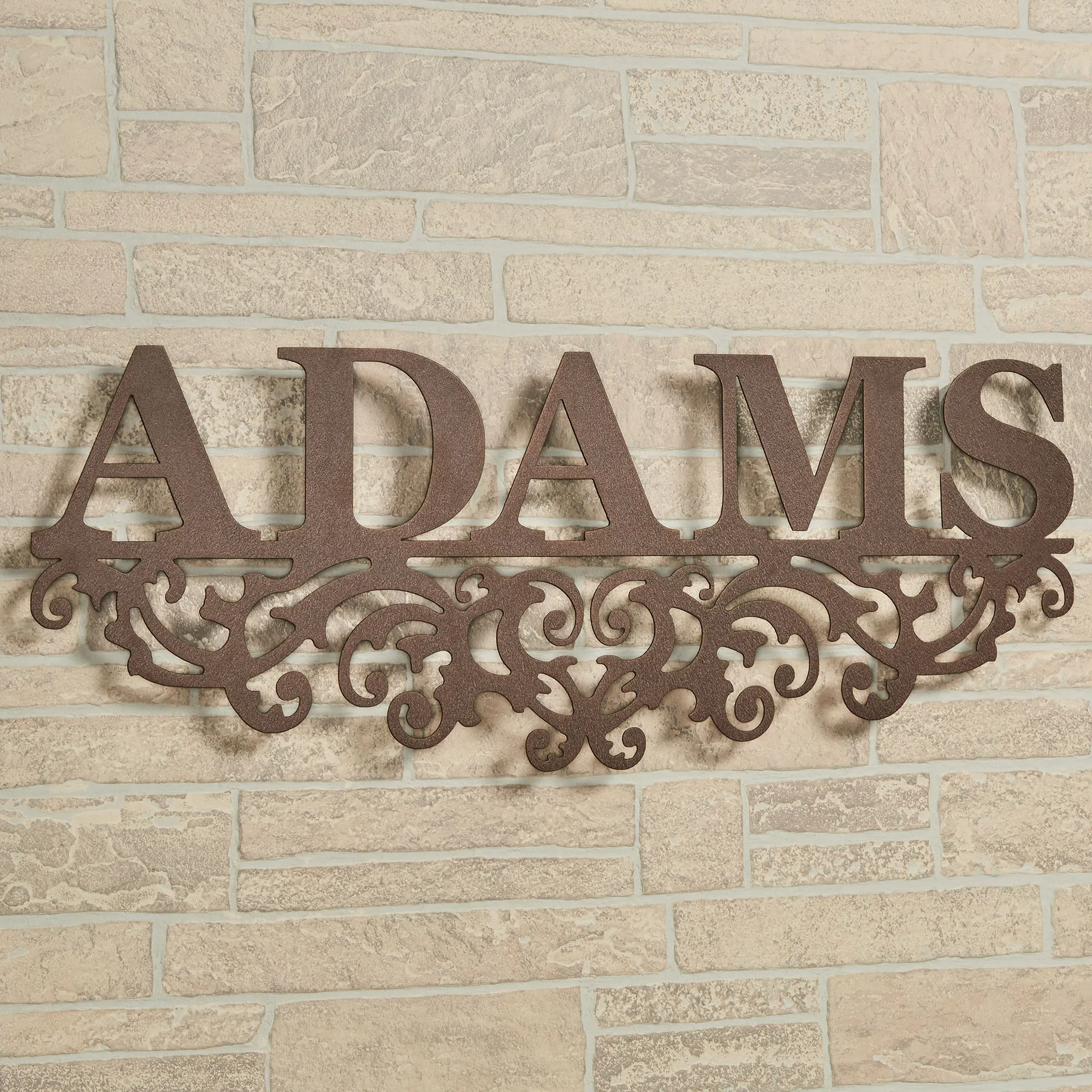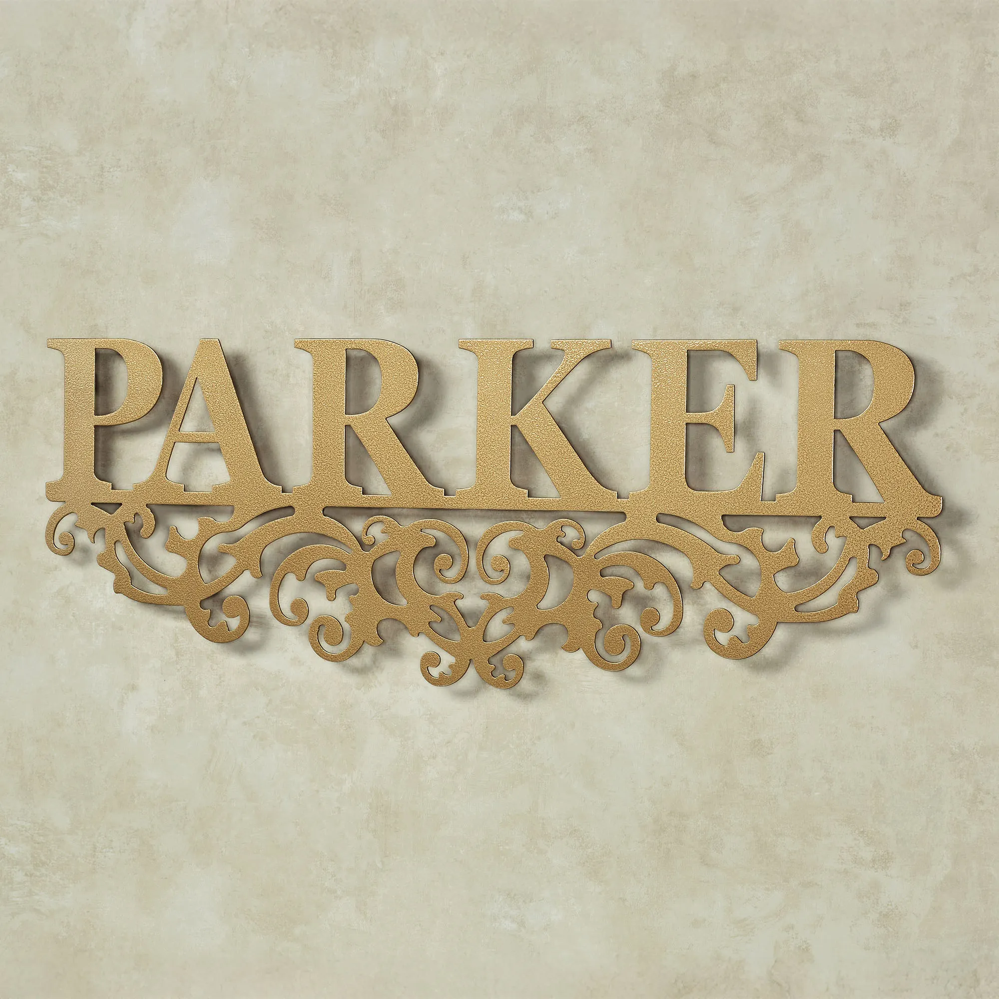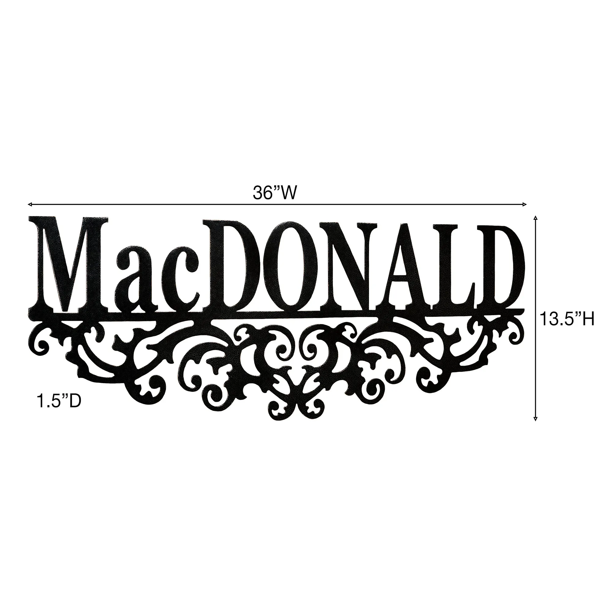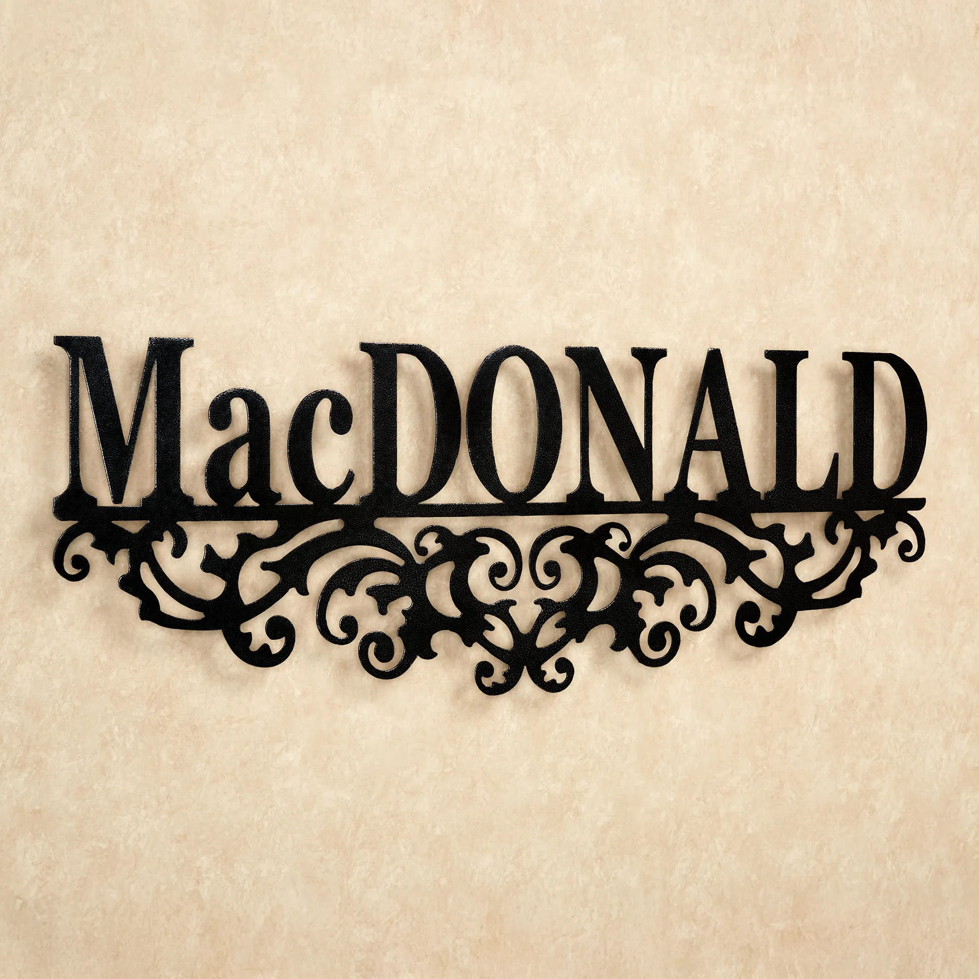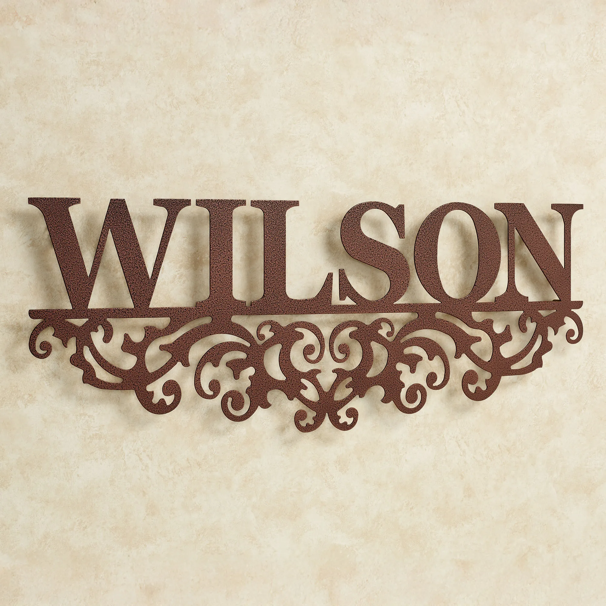 Display your heritage and take pride in your family name with the Kinship Family Name Personalized Wall Art Sign. Wall sculpture is handcrafted of precision-cut, 14-gauge steel and has a rich powder-coat finish. Wall art sign is also UV-, weather-, and tarnish-resistant. This item may be personalized with your family name up to 10 CHARACTERS. A hyphen counts as a character; a scroll will support the hyphen. Scrolls will accent the sides of names with character counts of three and under. Letters are uppercase with the exception of names with a prefix. In those cases, the prefix will be uppercase and lowercase, like MacDONALD. Specify Antique Copper, Antique Pewter, Black, Bronze, or Gold. Measures 36"Wx1.5"Dx13.5"H. (C)2013 Touch of Class(R).