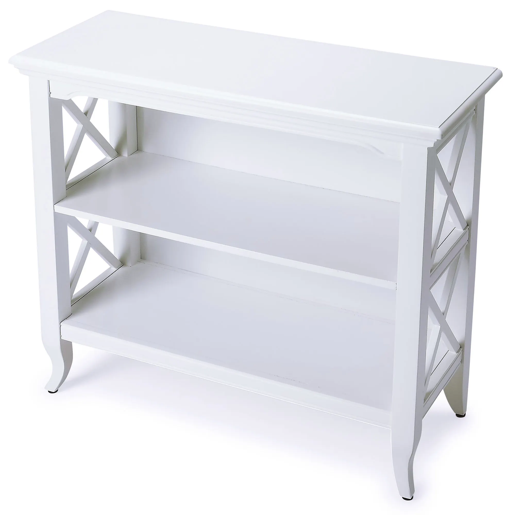 The Kinsley Bookshelf can organize your reading collection in style. This wooden bookcase, from Butler Specialty, has a slightly distressed antique white finish and an open "X" design on the sides. Shelves are 26.5"Wx11"D. Middle shelf to top is 9.25"H; lower shelf to middle shelf is 9.75"H. Overall, bookshelf is 32"Wx16"Dx30"H; weighs 40 lbs.