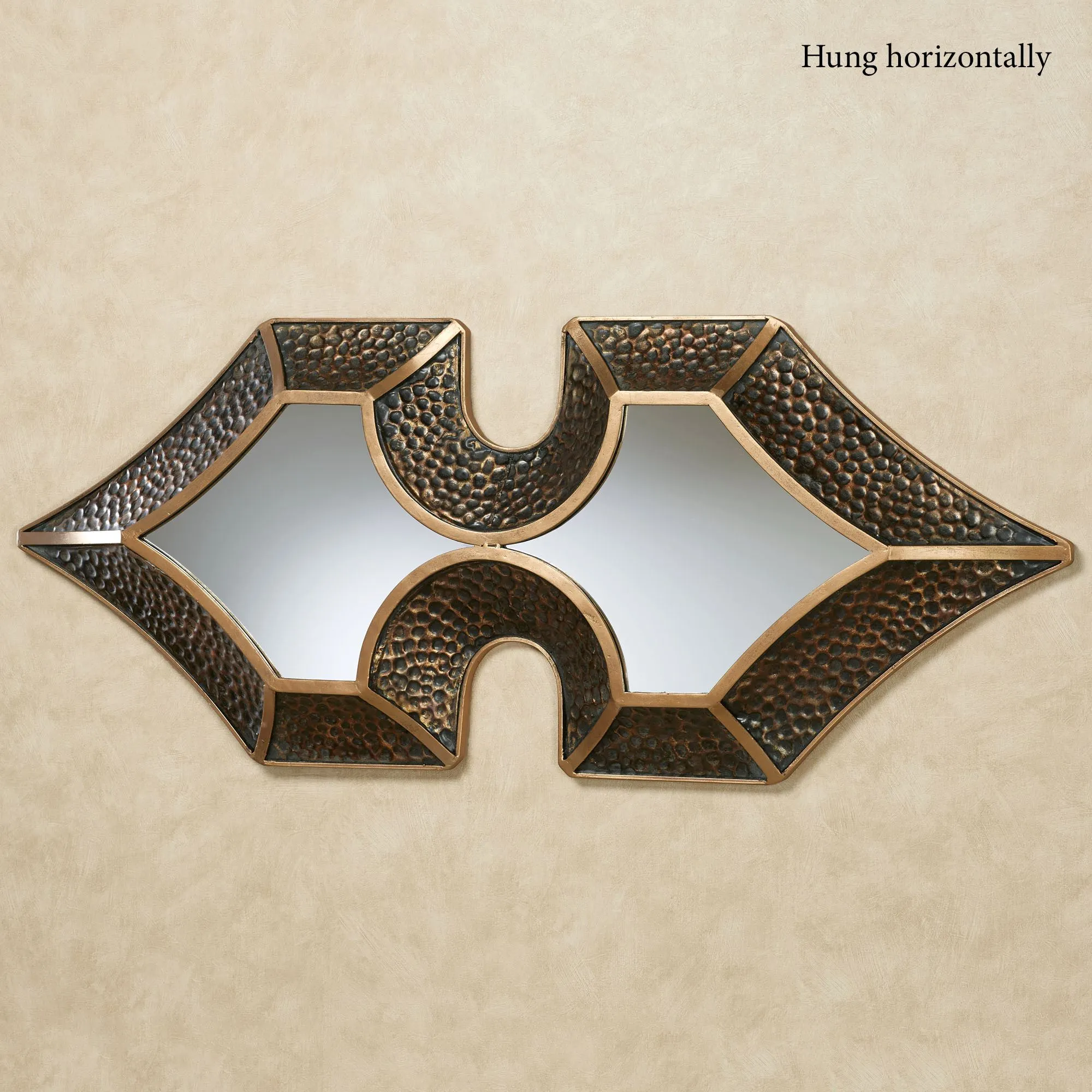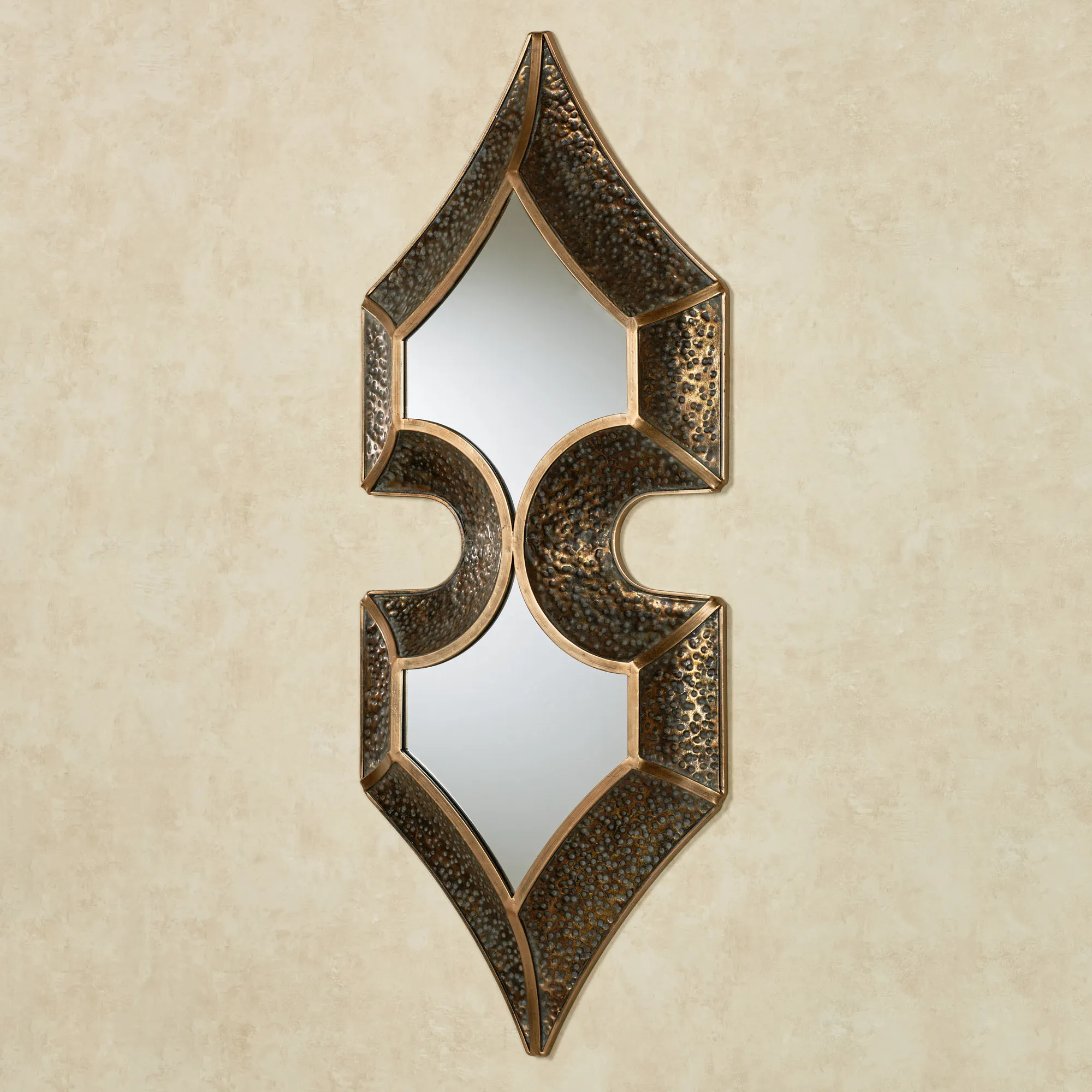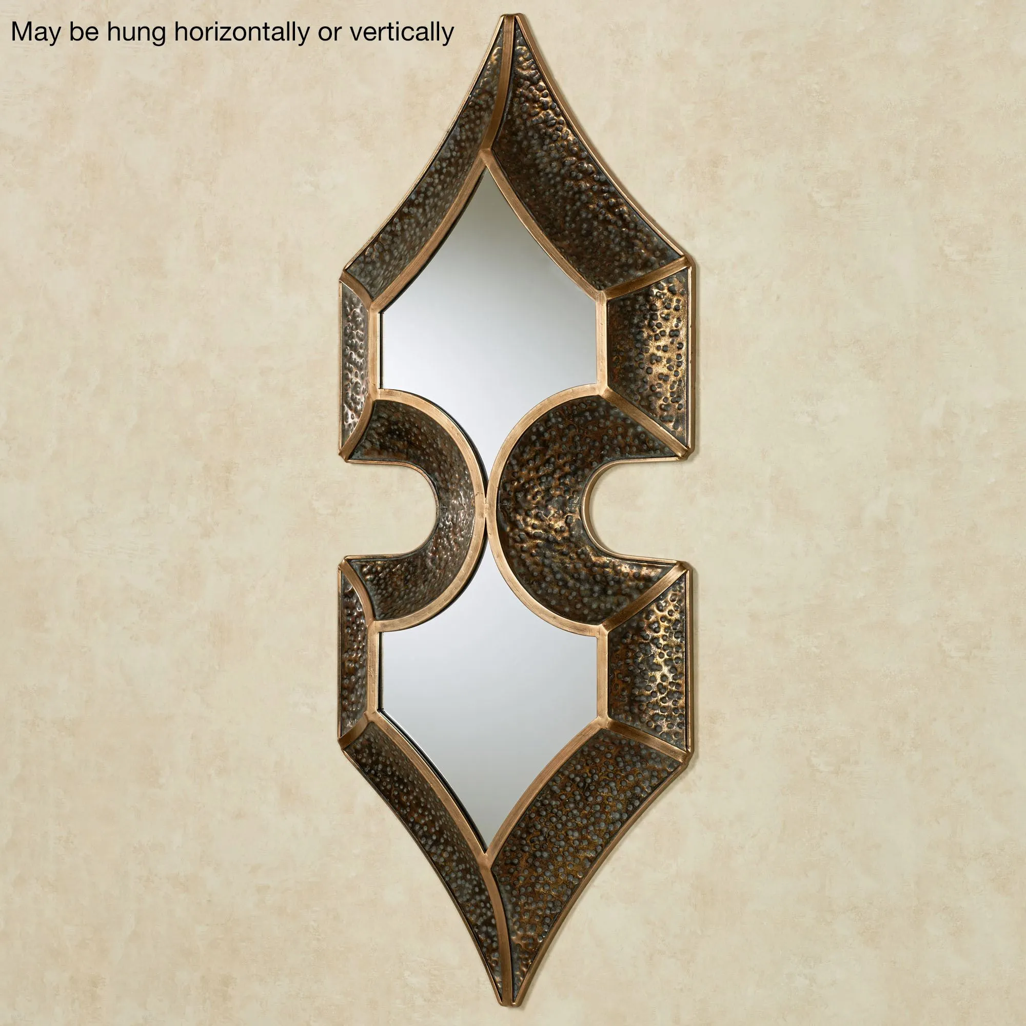 The Kipp Mirrored Metal Wall Sculpture clearly defines ornate beauty with its unique, captivating style. Accented with a curving middle, the shaped wall mirror features two distinct pointed ends, with each sweeping angle outlined in the unique frame. Highlighted in verdi and gold, the 4"W bronze-finished metal frame features a hammered texture to lend dimensional appeal to the center glass mirror. The thin borders are distressed. Measures 21"Wx4"Dx50"H and weighs 10 lbs.