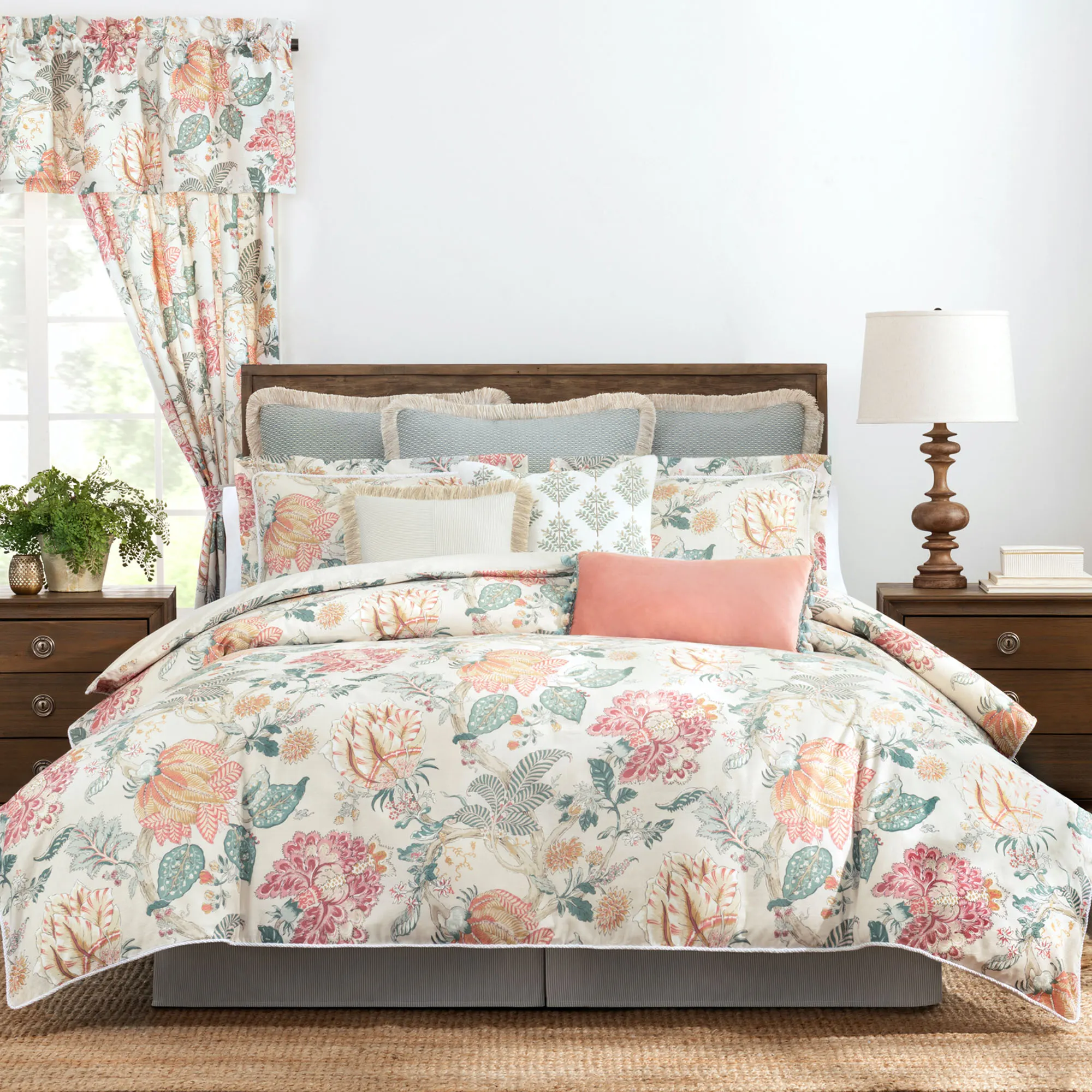 Flirty floral and leaf designs blossom with charm and beauty on the Komodo Comforter Bedding from Rose Tree. The cotton comforter features a printed Jacobean design in sweet shades of burgundy, green, pink, coral, melon, white, gold, and beige on light cream. Oversized comforter has a solid light cream backing. Fill is polyester. Machine washable; dry clean the bedskirt. Imported.